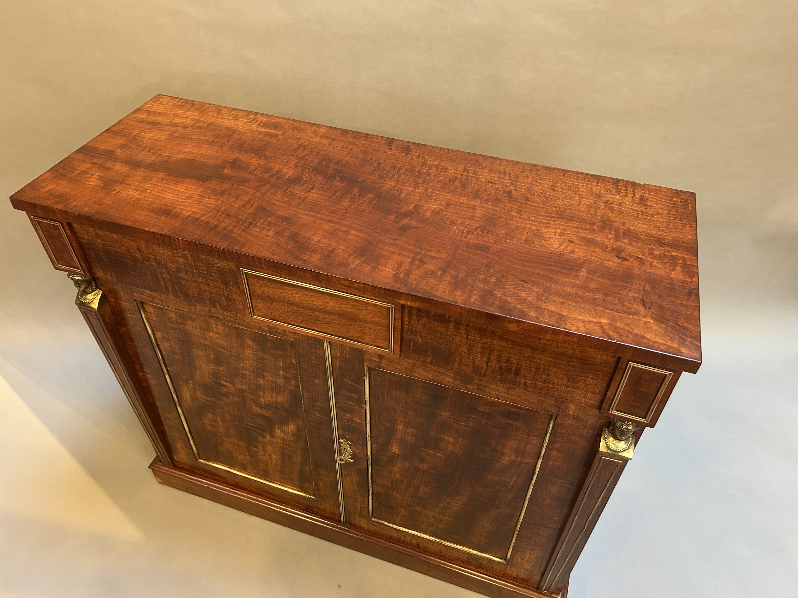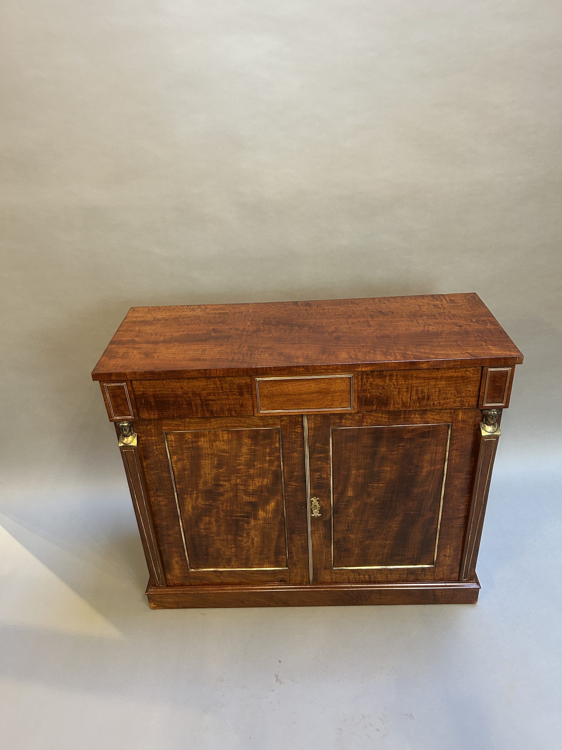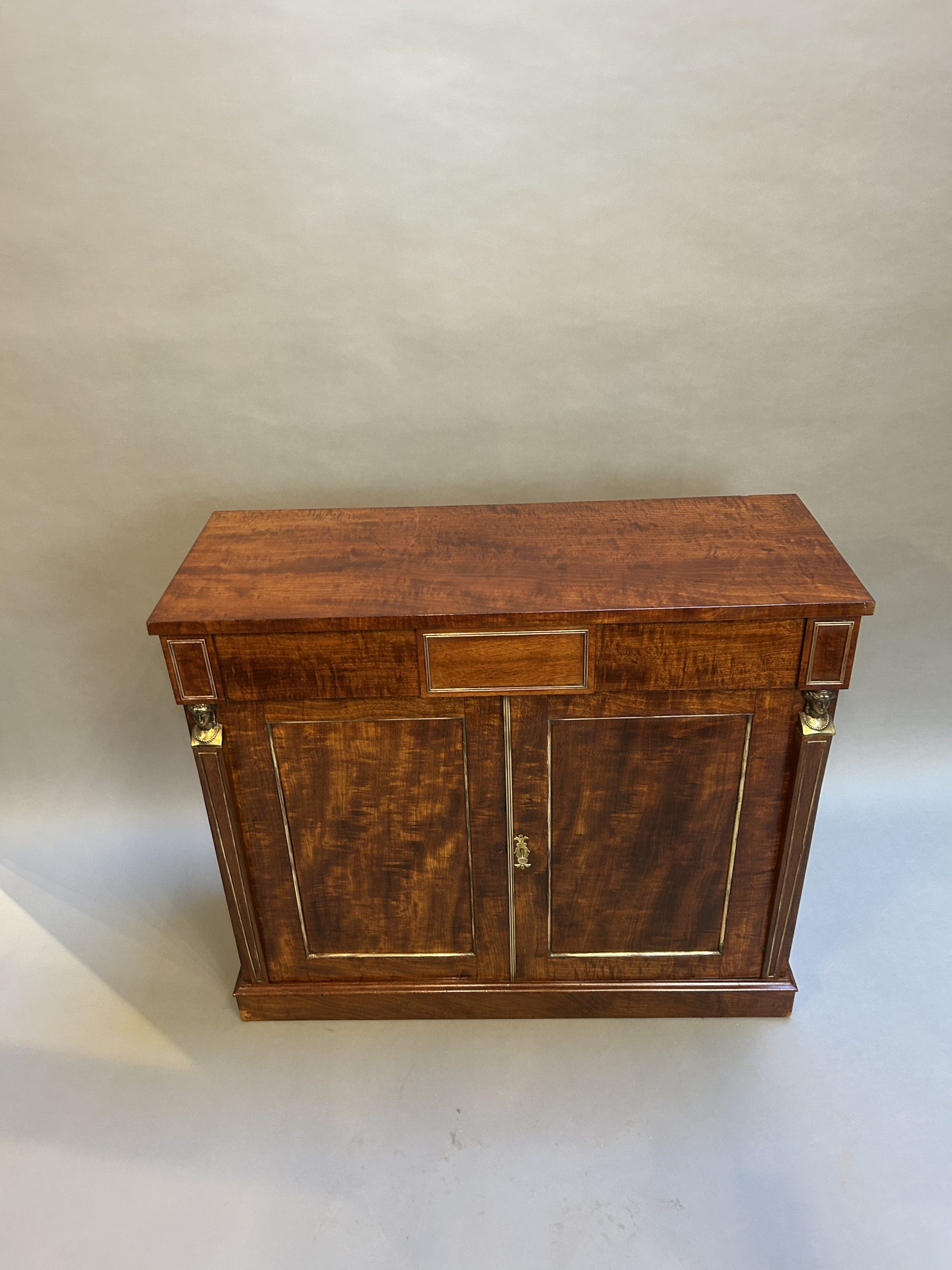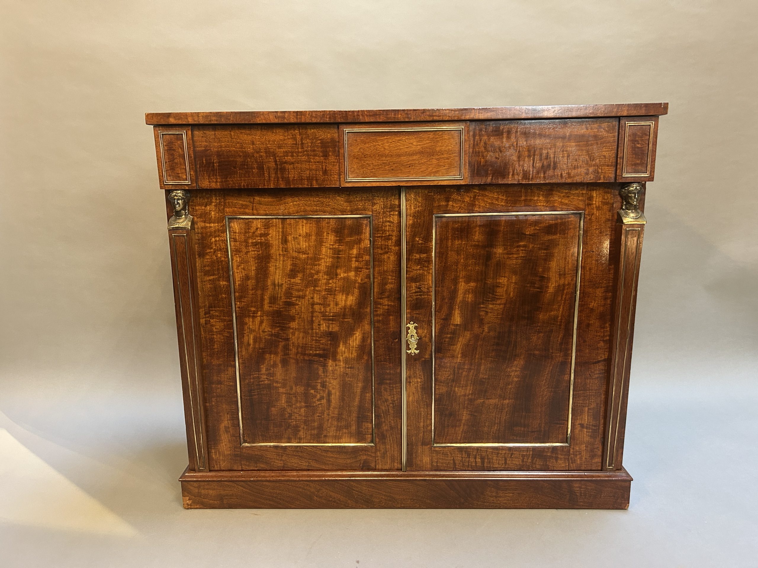 A very smart side cabinet circa 1810 of well figured ”fiddle-back” mahogany of good colour, the rectangular top over long frieze drawer and 2 panel doors flanked by tapering pilasters with gilt busts, enclosing shelved interior with cellarette, brass mounts throughout and raised on plinth base.