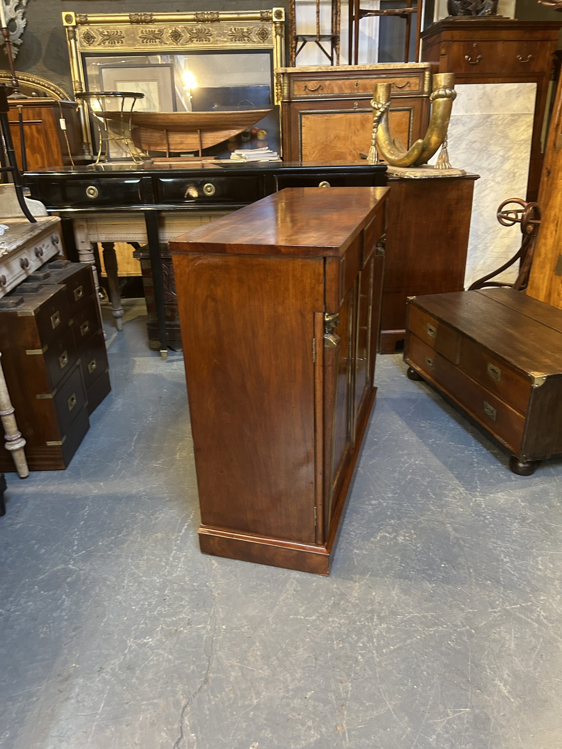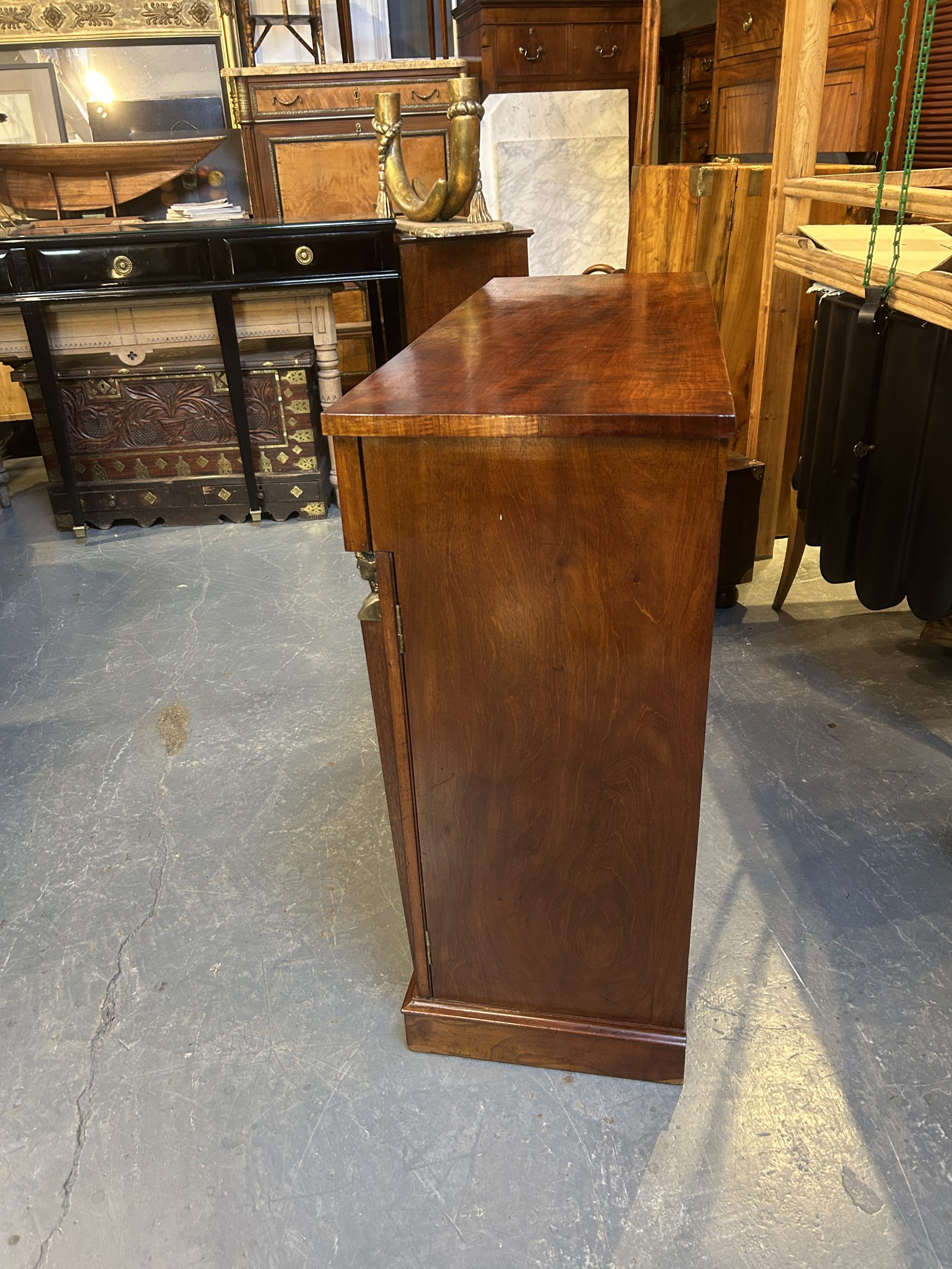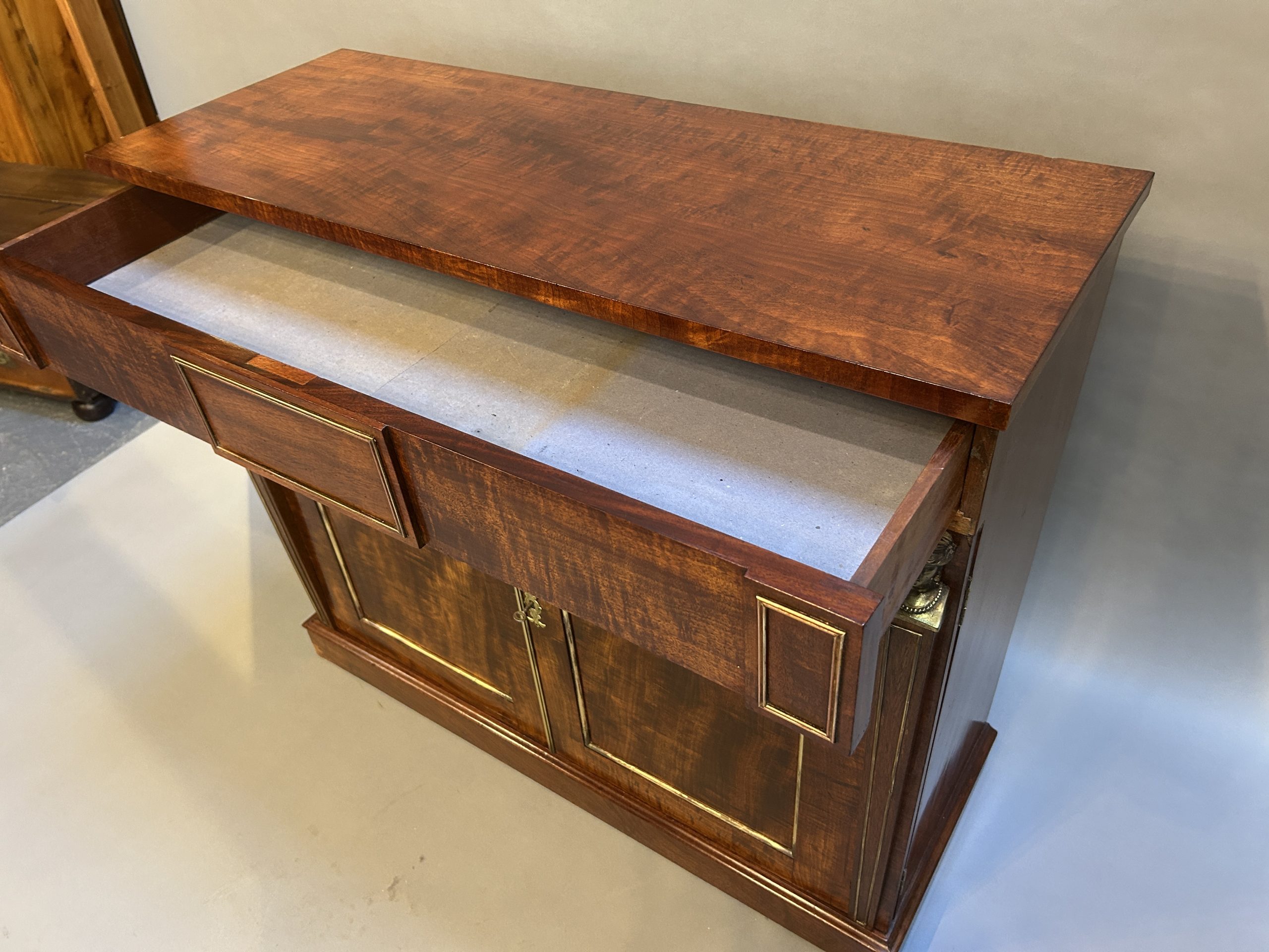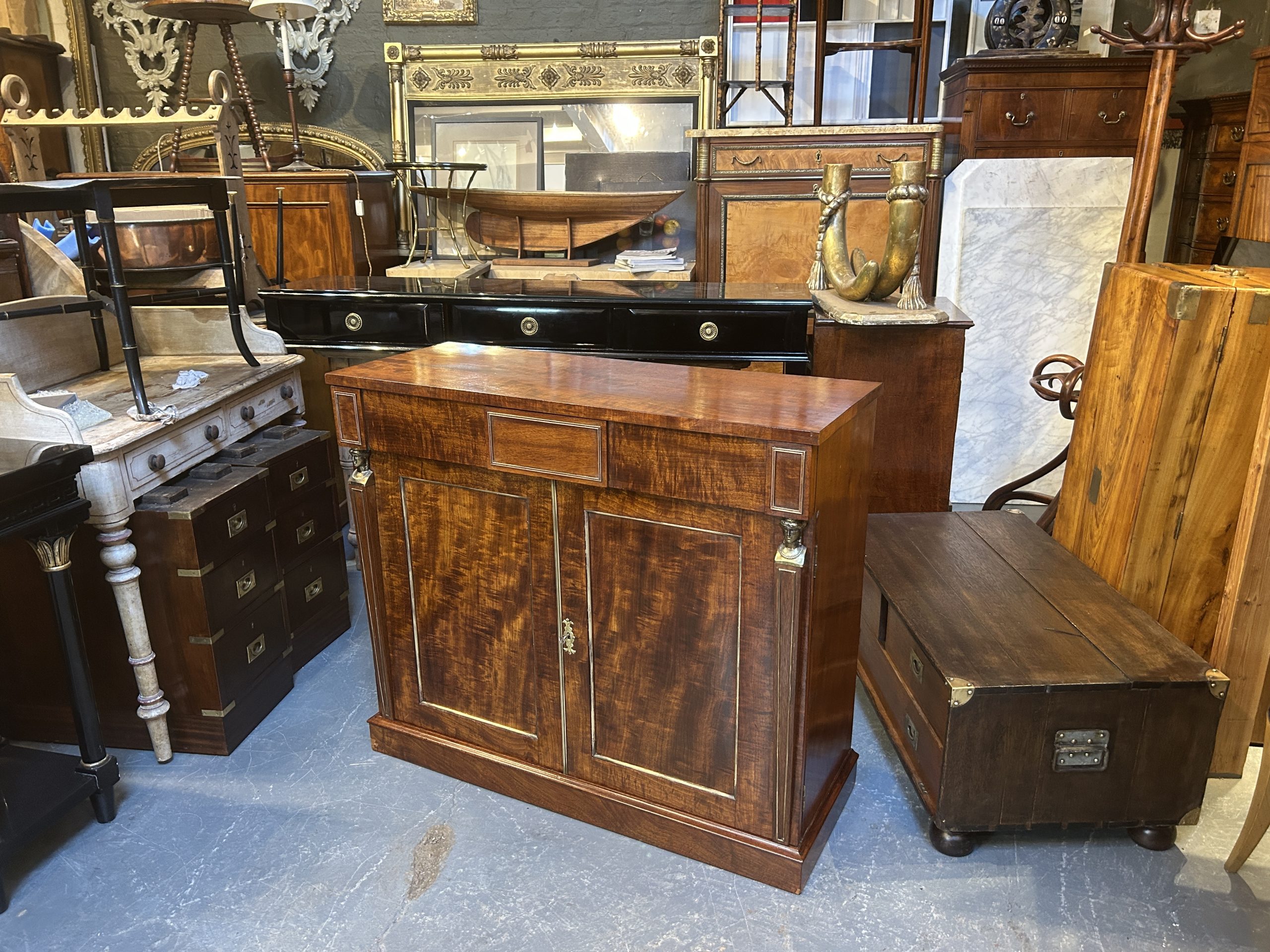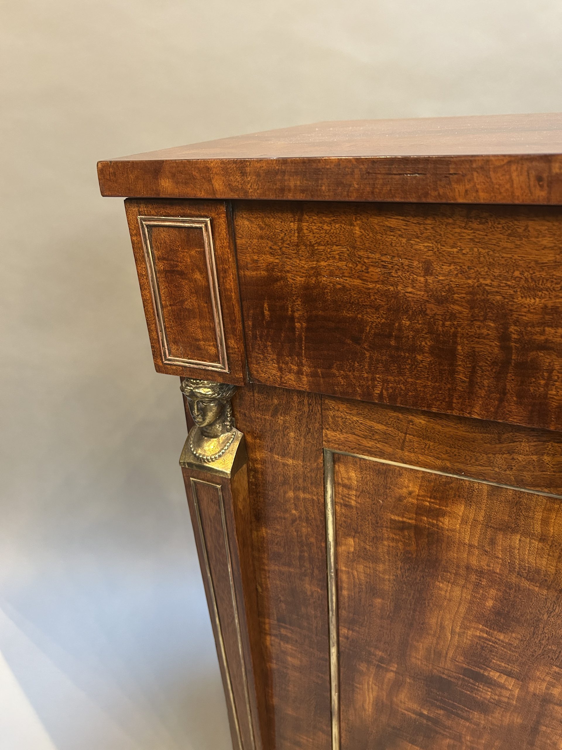 A very smart side cabinet circa 1810 of well figured ”fiddle-back” mahogany of good colour, the rectangular top over long frieze drawer and 2 panel doors flanked by tapering pilasters with gilt busts, enclosing shelved interior with cellarette, brass mounts throughout and raised on plinth base.
