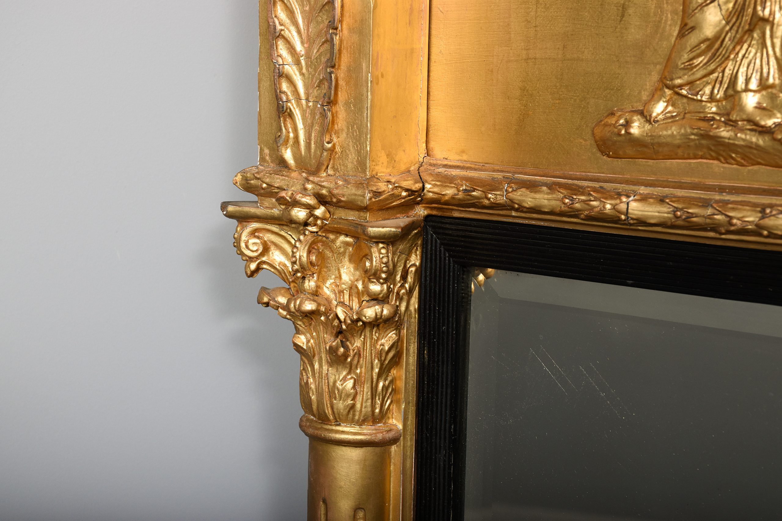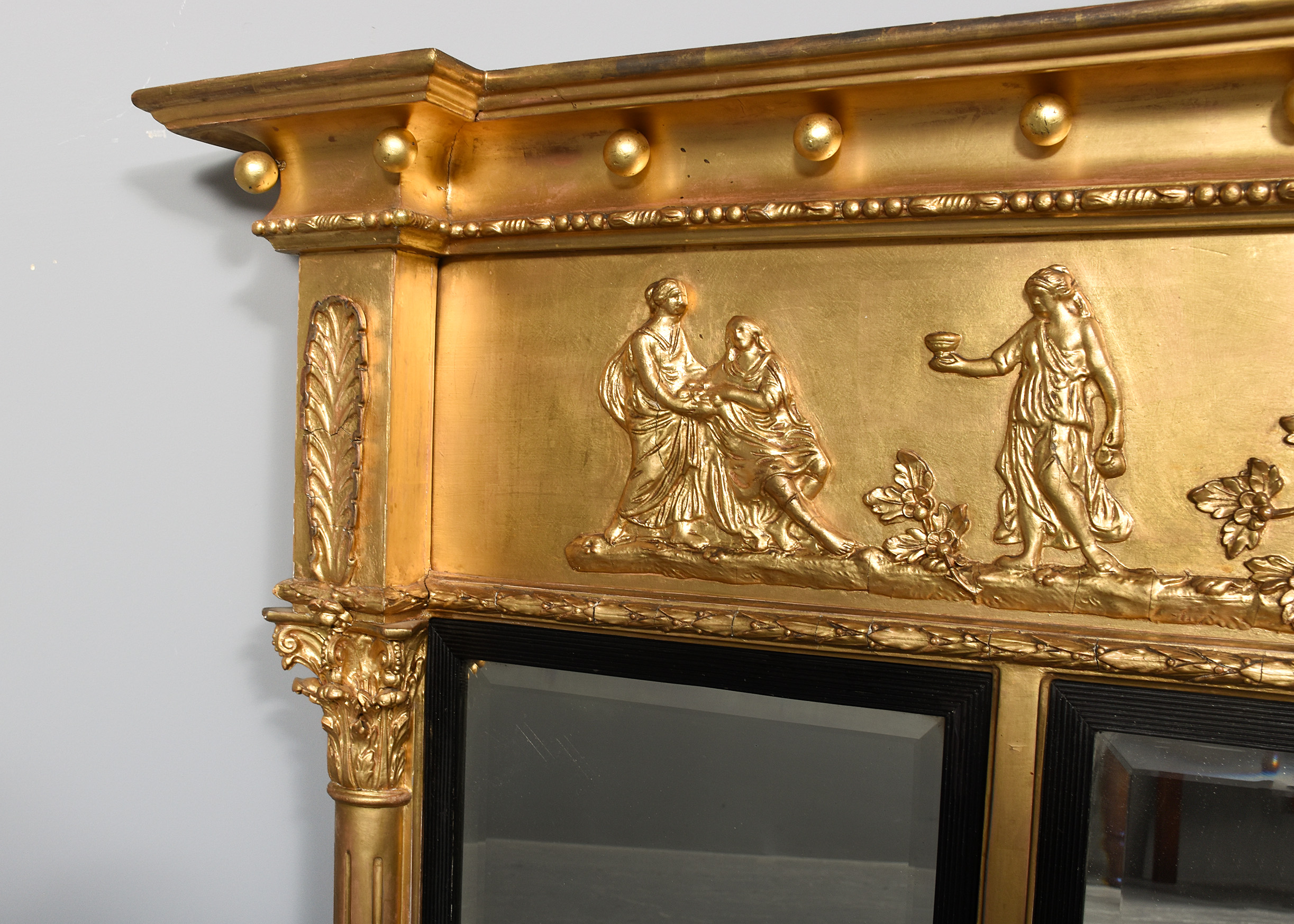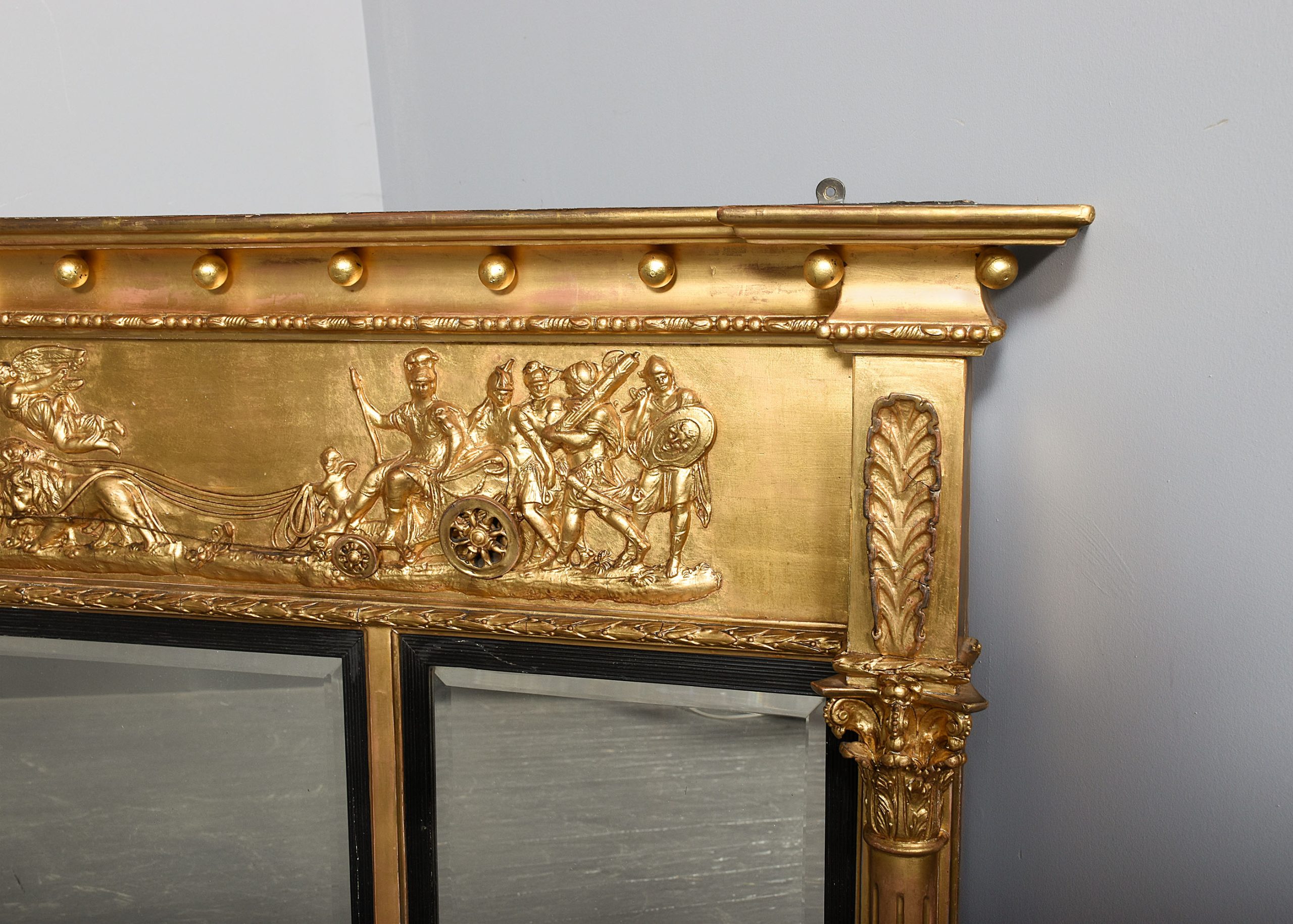 Circa 1820. A quality Regency gilded tryptic overmantel mirror, the flat top with cavetto styling beneath with gilded spheres, the frieze with classic scene of chariot with lions, winged angels and classical figures on a gilded rocky base, this is flanked by carved acanthus leaves, the three original bevel-edge mirrors contained within an ebonized ribbed slip, with the outer mirrors flanked by a pair of fluted pilasters with Corinthian capitals.