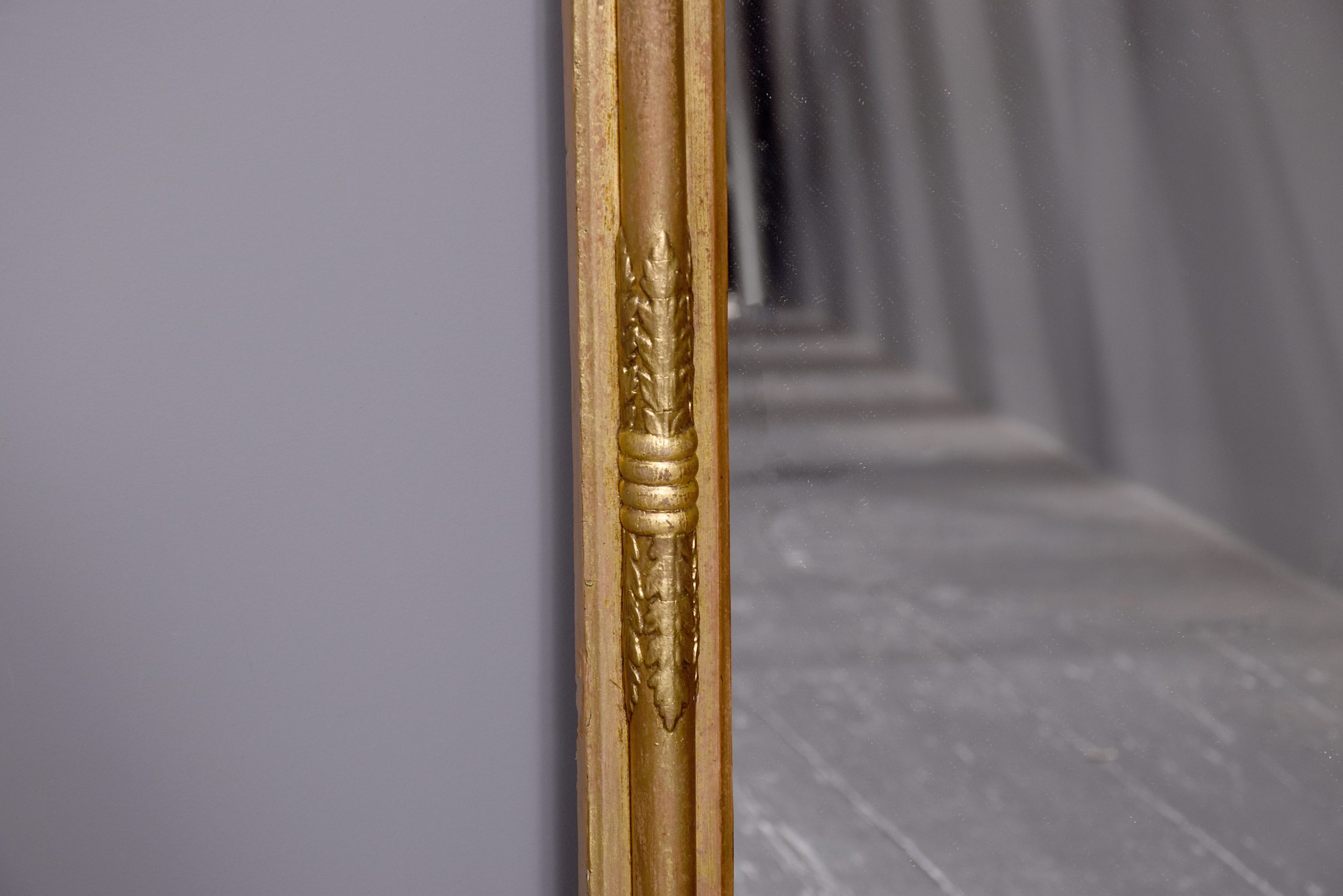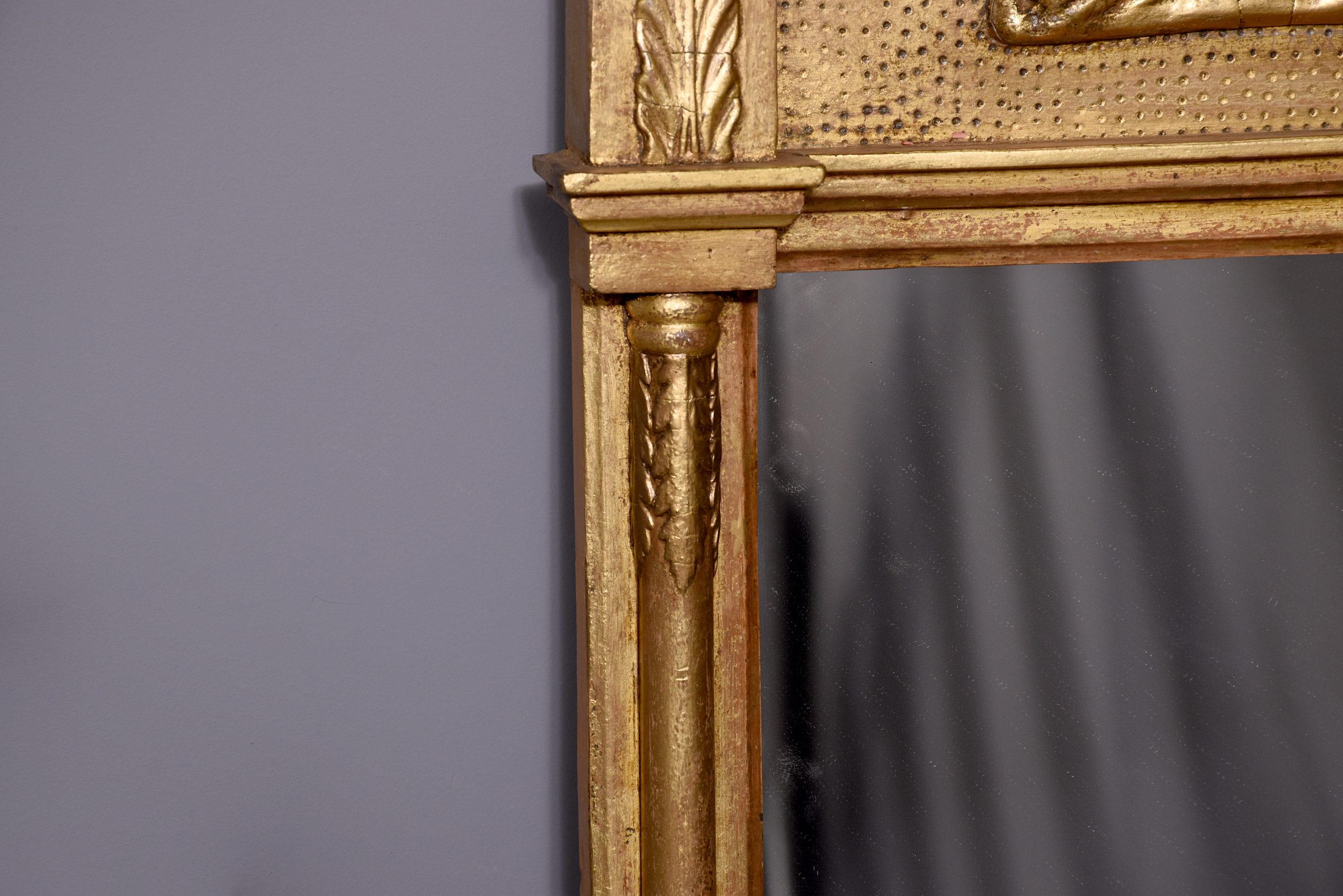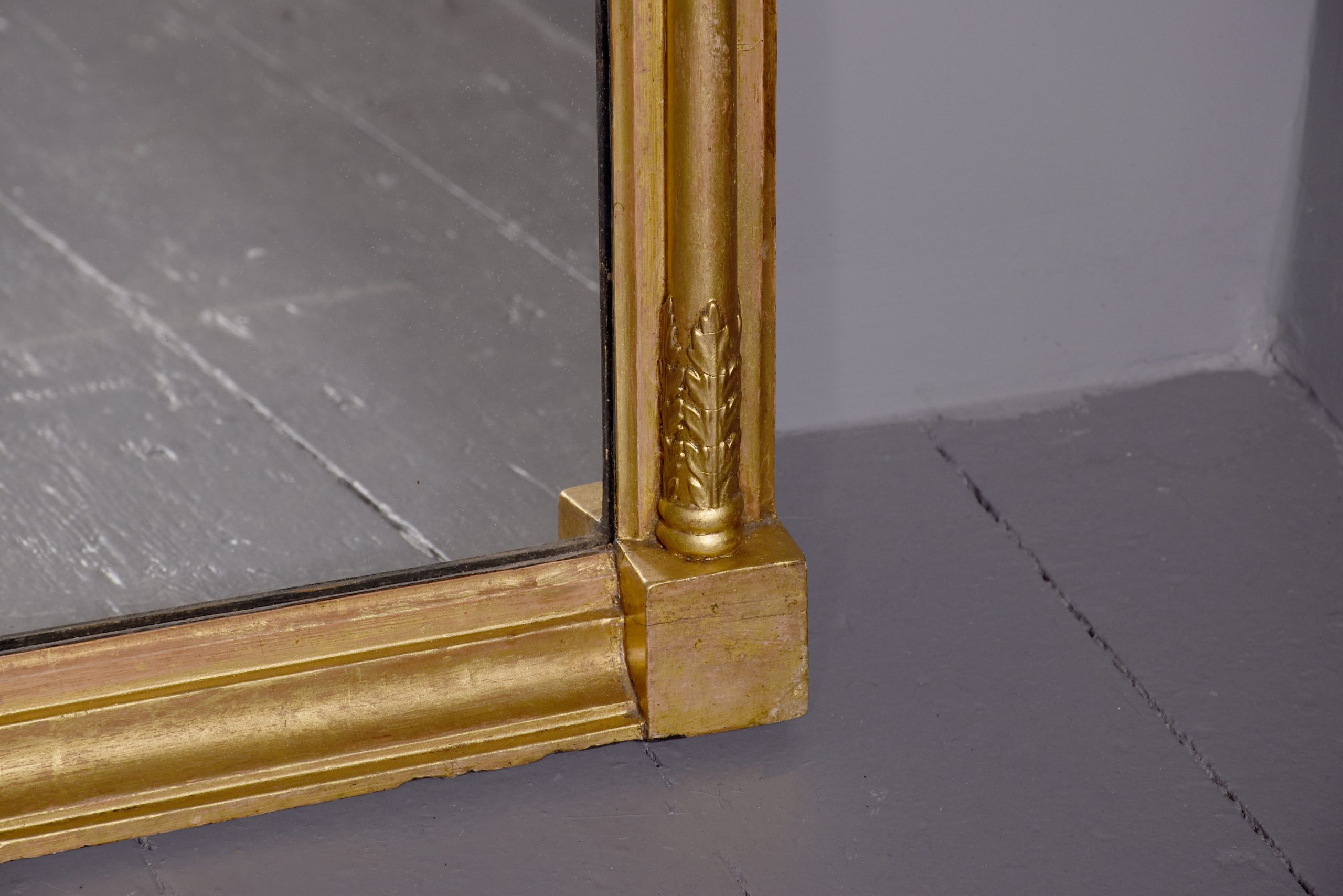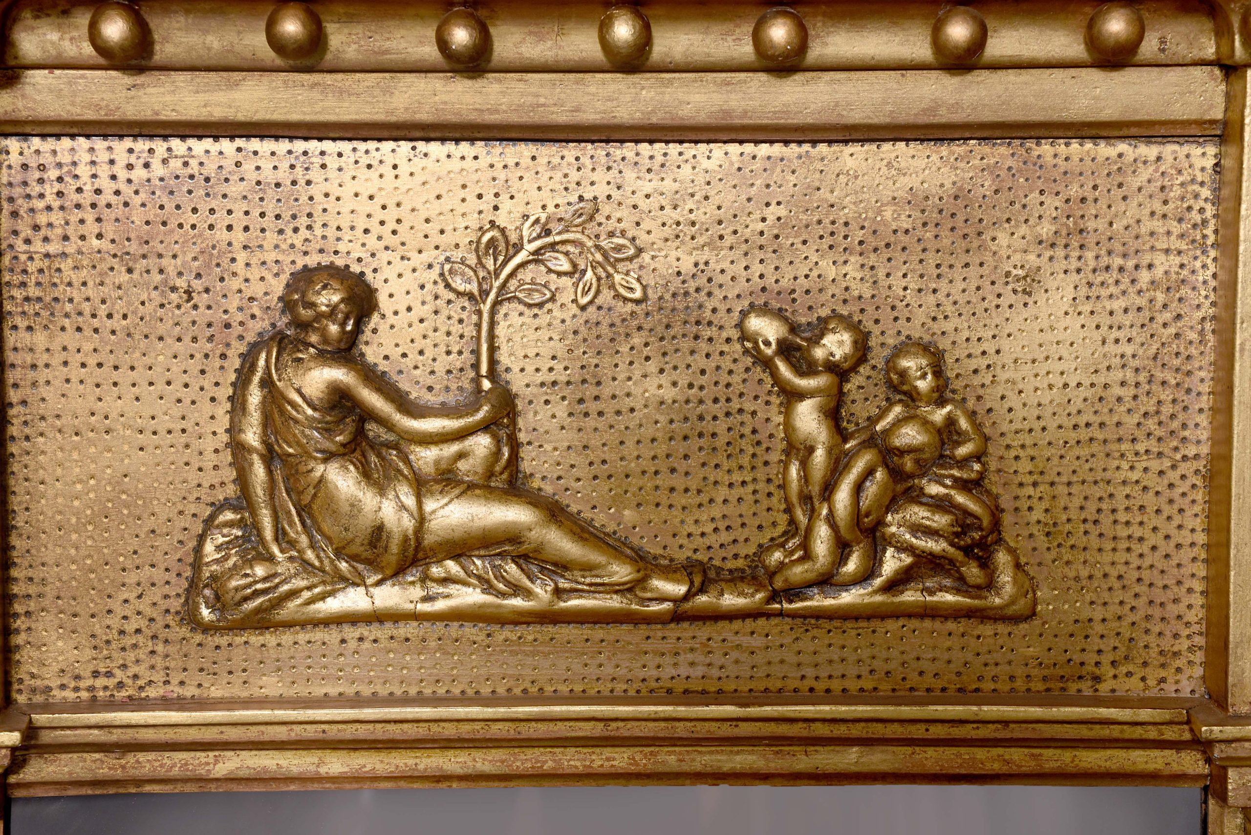 Circa 1820. Attractive Regency giltwood pier or wall mirror. Surmounted by a moulded cornice with gilded ball decorations above a neoclassical frieze with a lady and putti figures, flanked by columns with acanthus decoration. The rectangular mirror plate (old replacement, in perfect condition) flanked by columns with further foliate and ring decorations all above a neat, moulded base.
