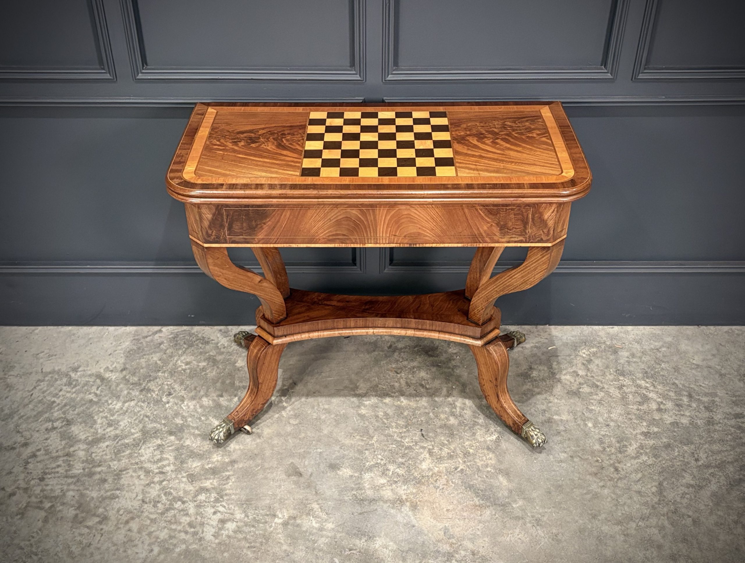 A fine Regency period mahogany games table of elegant proportions, raised on a shaped pedestal base with swept legs terminating in attractive brass paw castors.