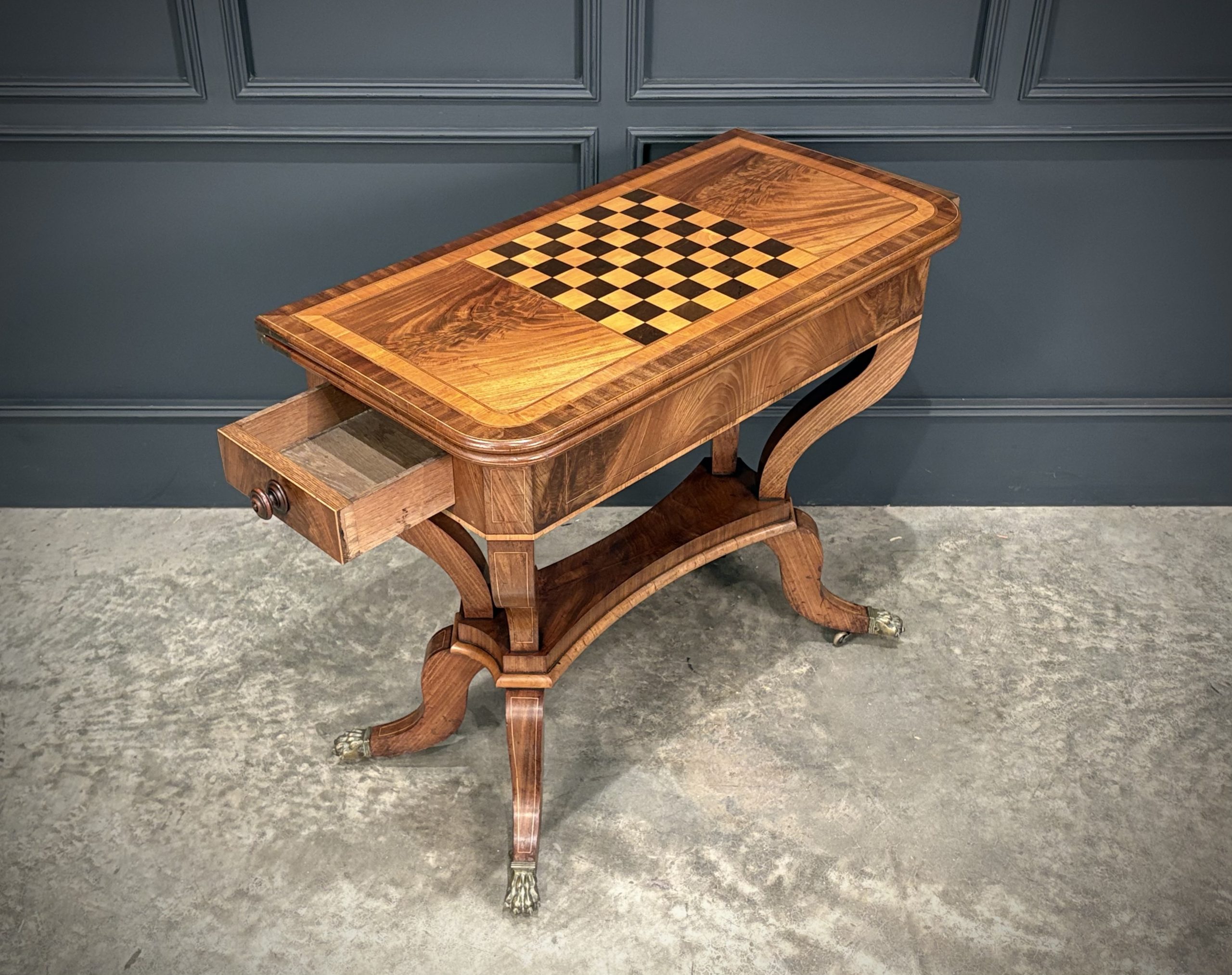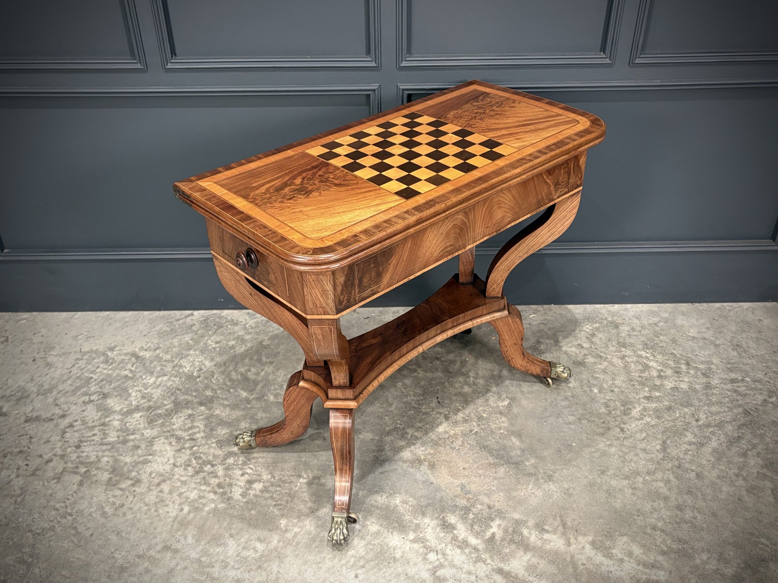 The rectangular top lifts and swivels to reveal a playing surface with satinwood inlaid border, the upper side featuring a striking ebony and satinwood inlaid chessboard.