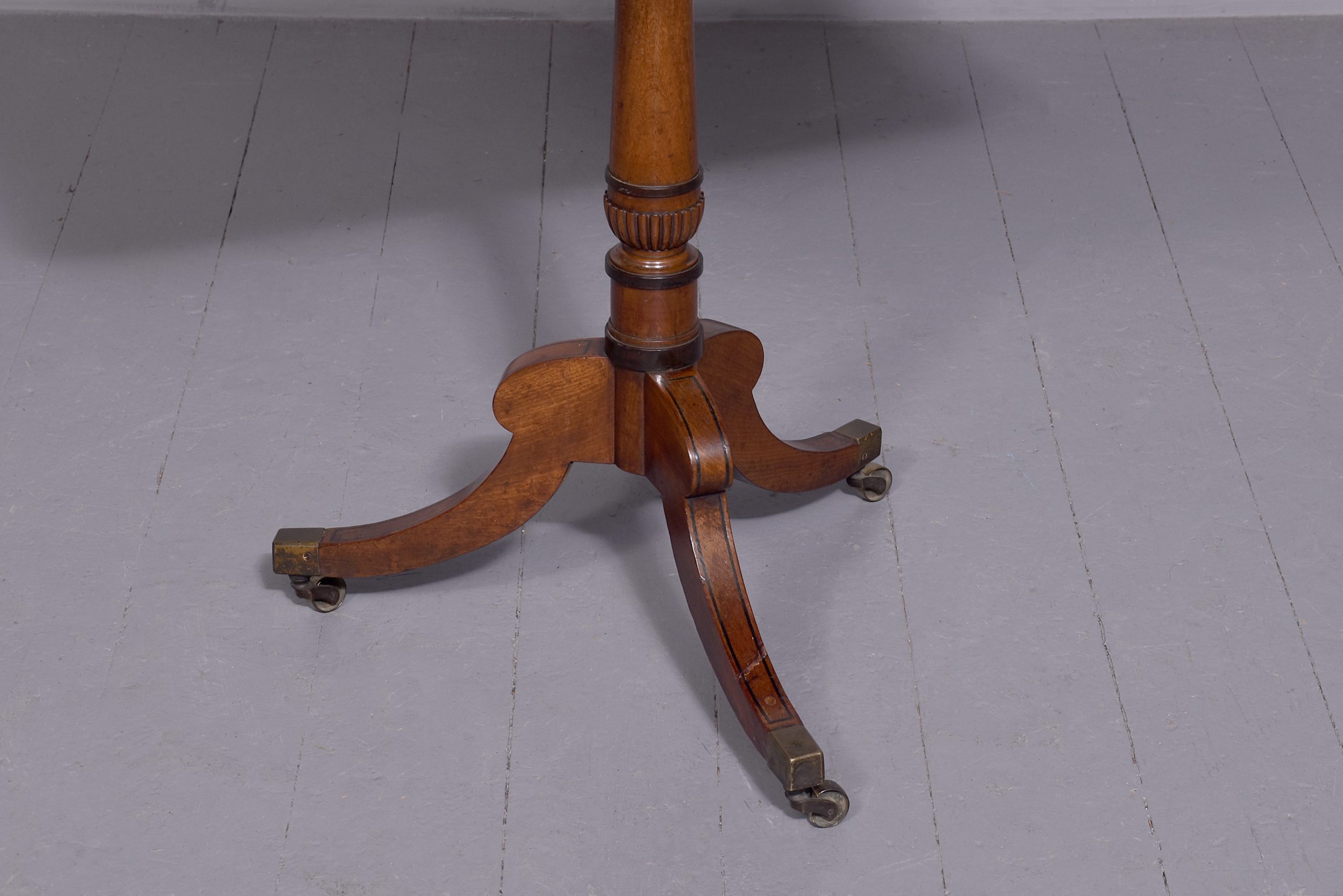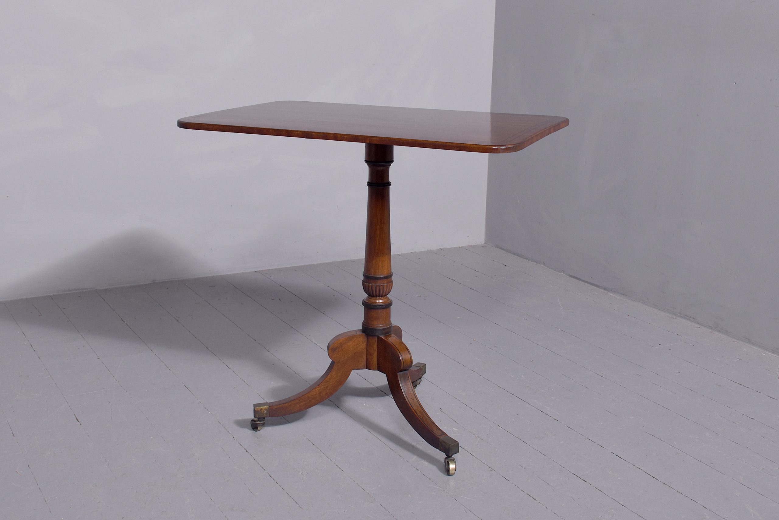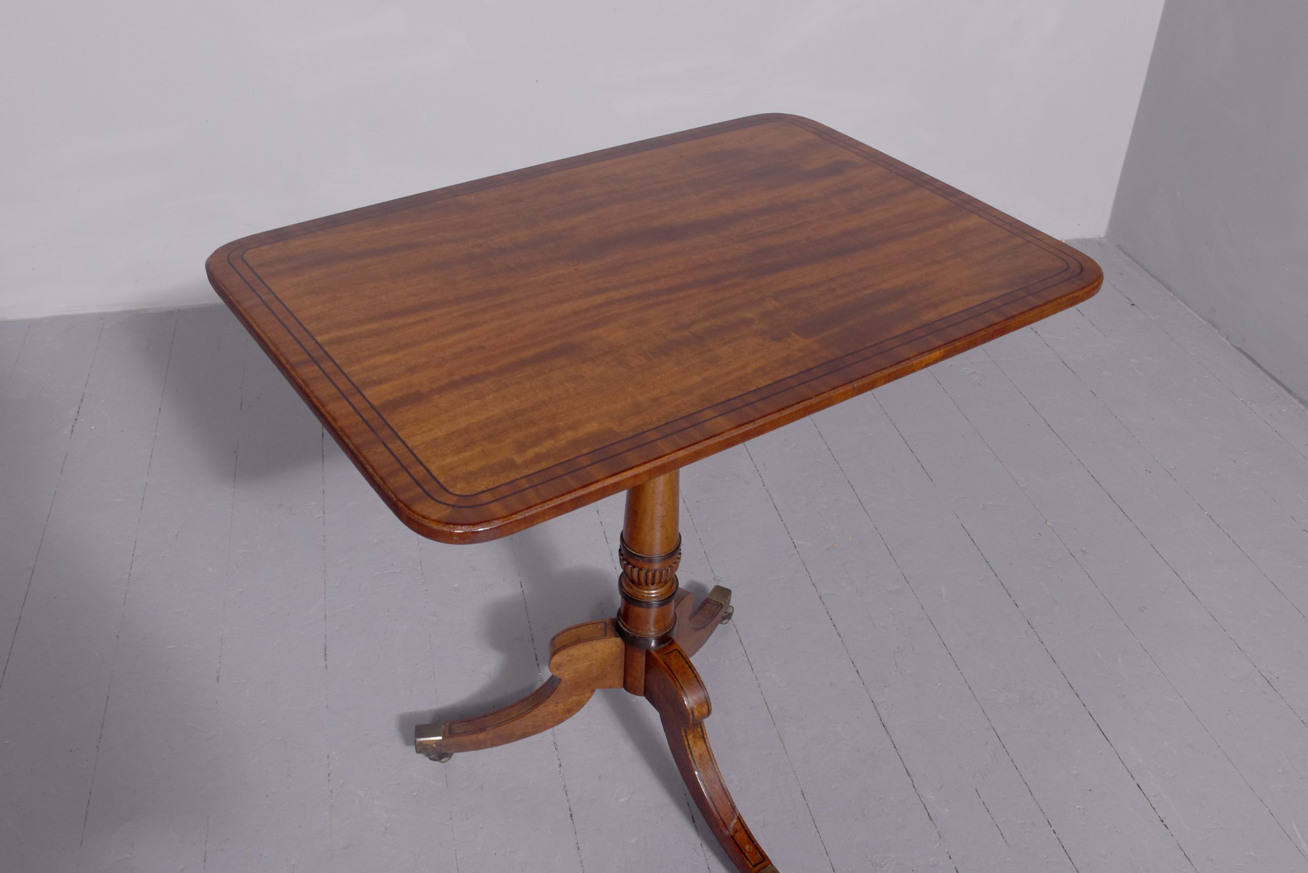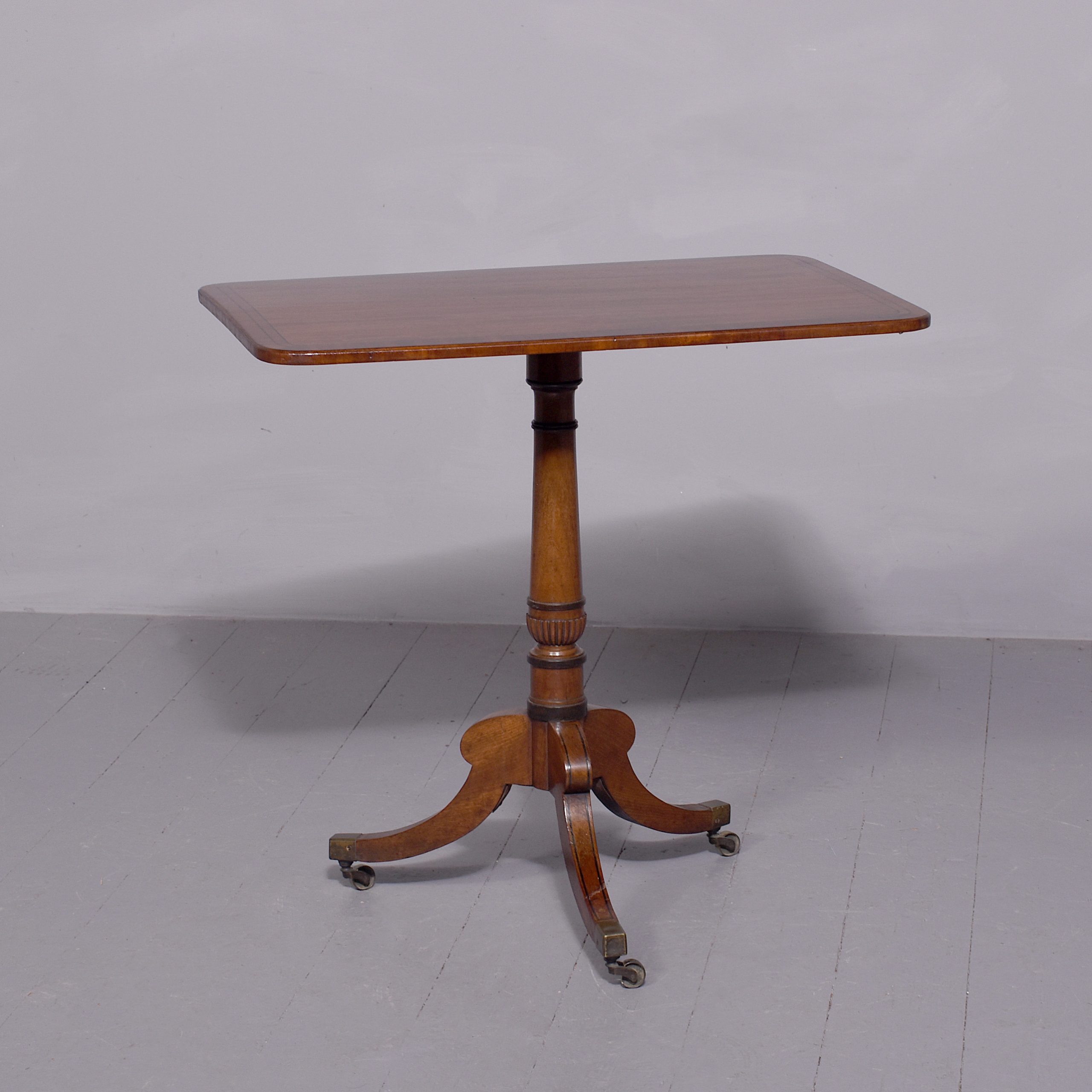 Circa 1850. A quality Regency mahogany and inlaid side table, the rectangular top with rounded corners in fine figured mahogany with double banding of ebony and broad banding and a simple chamfered fore edge, resting on a classic turned canon barrel stem with ebonized sections and a small fluted urn towards the base with further ring turning, issuing three hipped ebony inlaid saber legs finishing with the original cast brass block with the brass castors beneath. Table has recently been repolished (traditionally).