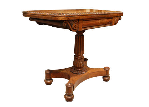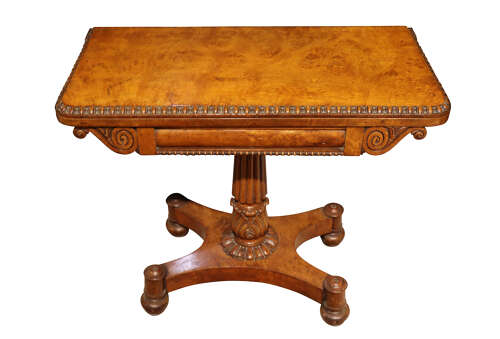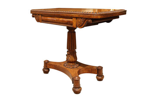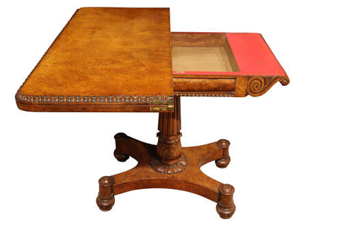 A quality Regency pollard oak games table of striking colour and highly figured grain, the rectangular top with rounded corners and a beautifully carved egg-and-dart moulded edge. The hinged top opens to reveal the original baize-lined playing surface framed in pollard oak.