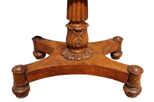 The frieze is enriched with carved roundels and bold scrolled volutes to each corner, typical of high-end Regency design. Beneath, a reeded and tapering central column rises from a crisply carved lotus base, standing on an elegant quatreform platform with turned bosses and original bun feet.
