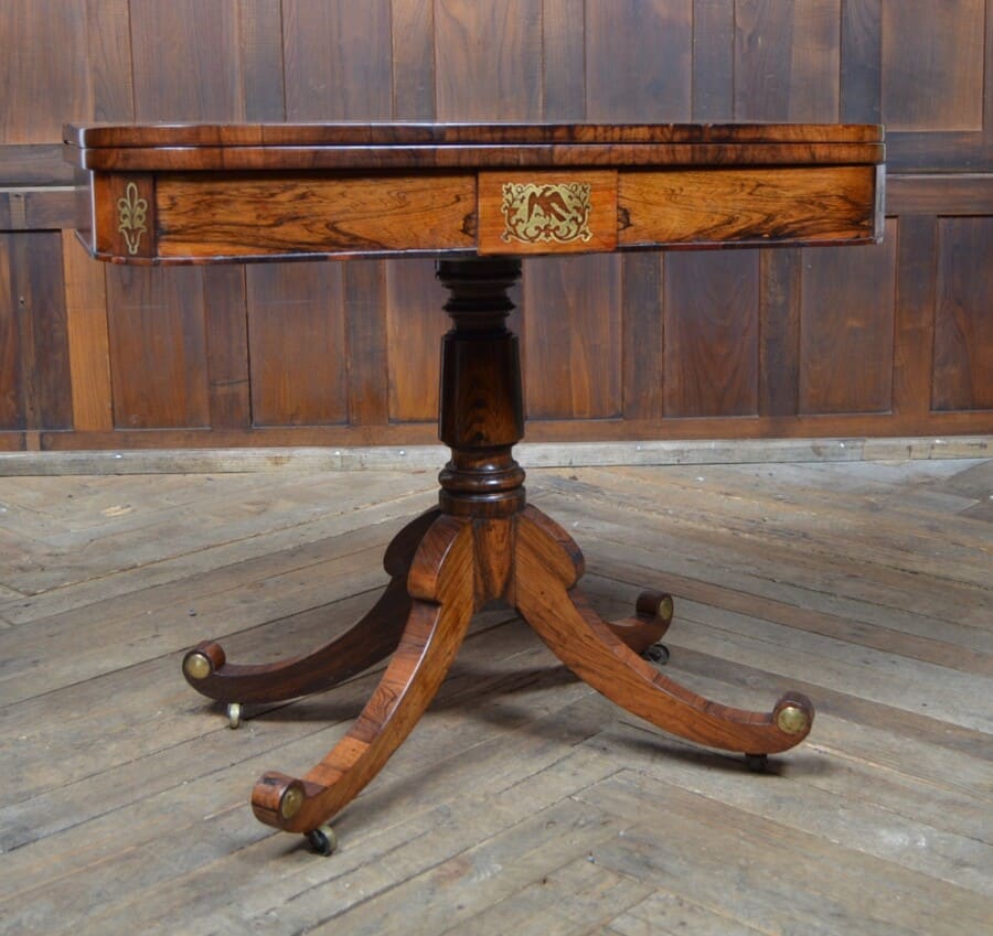 Fabulous Regency rosewood card table with outstanding brass inlay. It’s wonderful veneered top rotates to reveal a hidden storage recess with plenty of room inside to store the cards, games, etc and folds over to reveal a green baize games surface. The grain of the wood in the frieze is superb and has detailed brass inlay decorating the sides and front. Supported by a central turned carved column is carved with quadruple splay legs ending with a scroll toe terminating on castors. When closed it makes a stunning console table however it is always ready for games night. In excellent condition with a gorgeous warm colour and amazing patina. This is a stunning piece of antique furniture both attractive and practical, a perfect addition to any home.