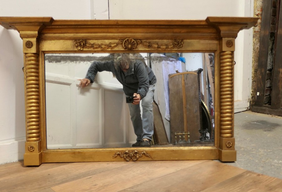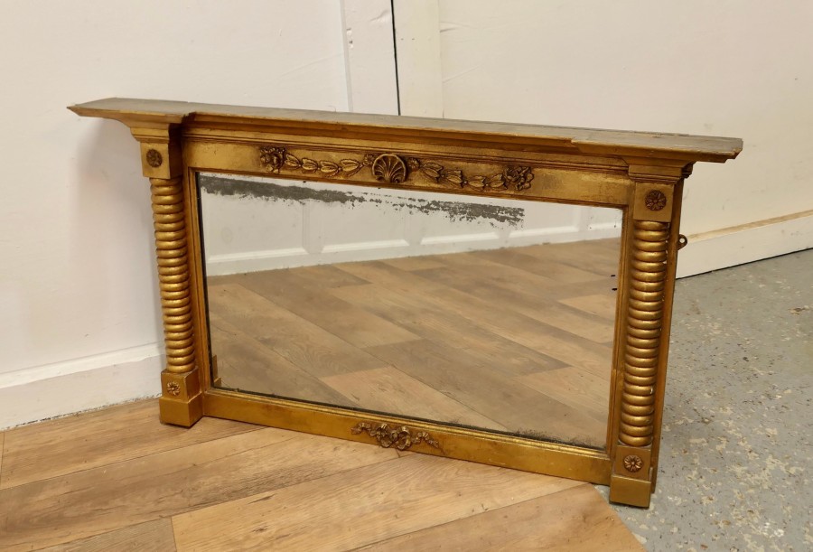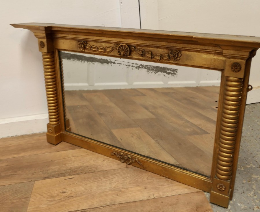 Regency Style Gilt Mirror or Over Mantle The Regency style carved Frame is a rectangular shape, it has twisted columns at either side and a shell and leaf design along the top. The mirror has an old mercury rectangular glass, the glass is original and has along fox along the top edge The Age Darkened Gold paint on the Frame has a genuine shabby look, but is in generally good condition. The mirror is 45” wide and 26” high SW74 Manufacture Date : 19th Century Materials : Giltwood