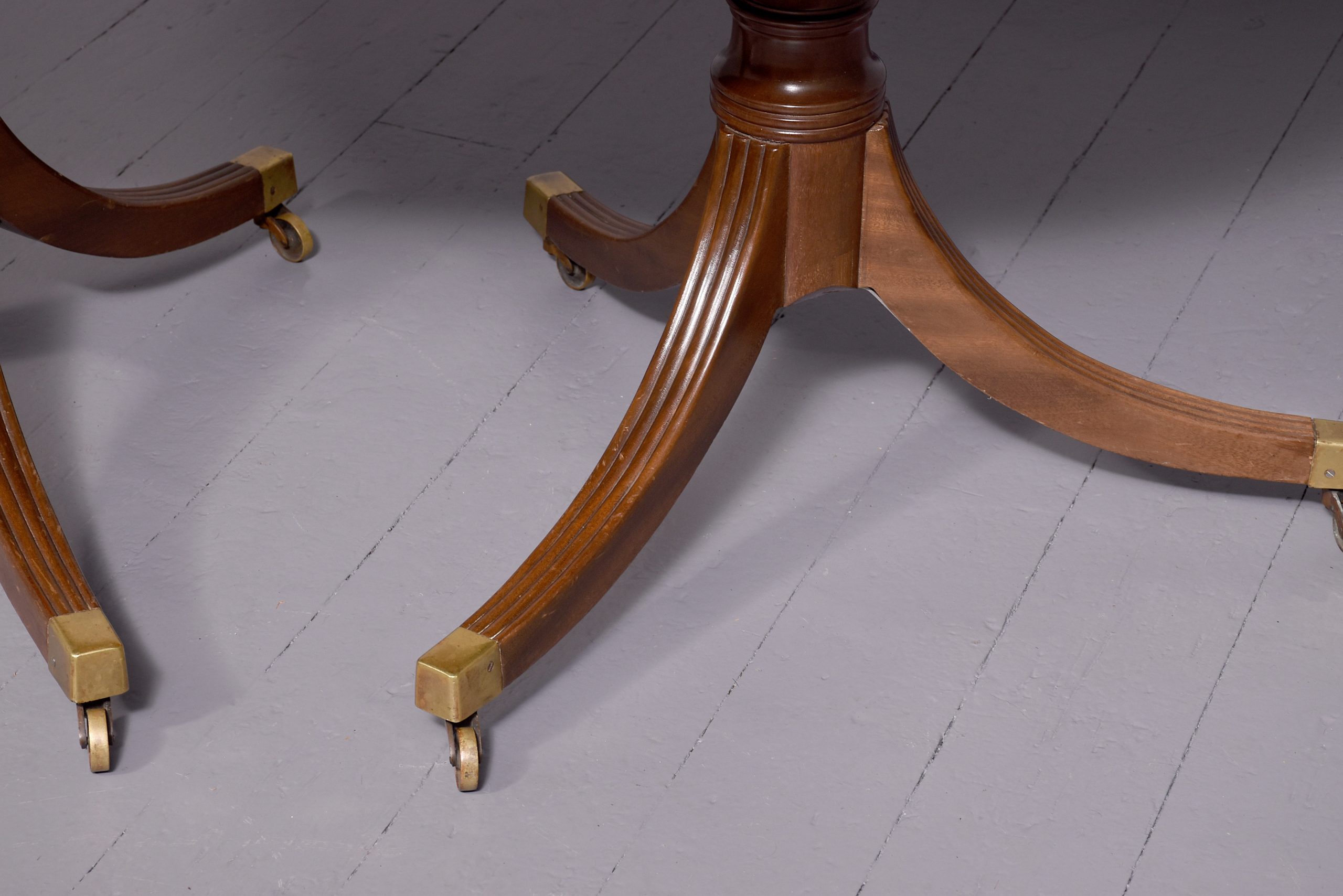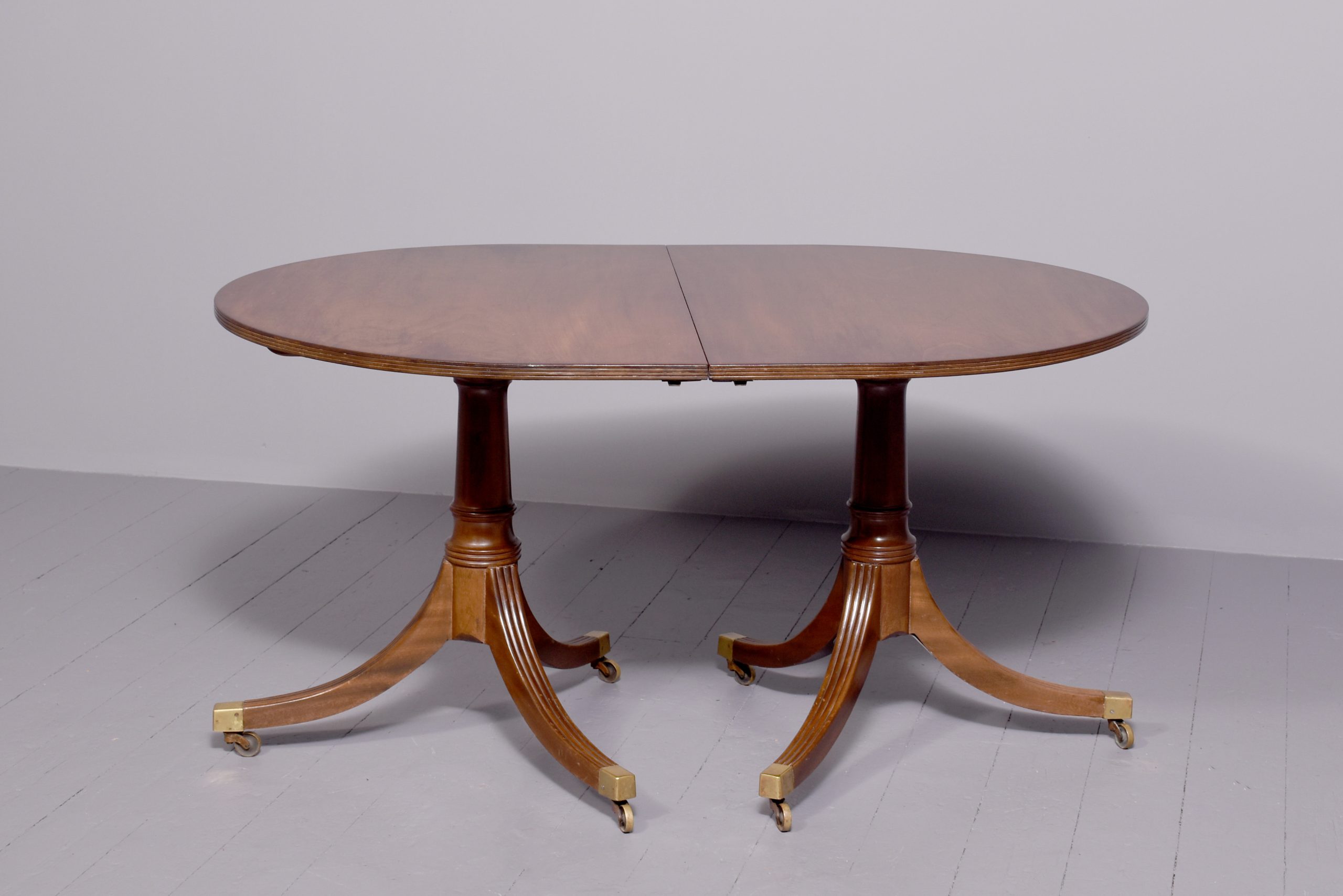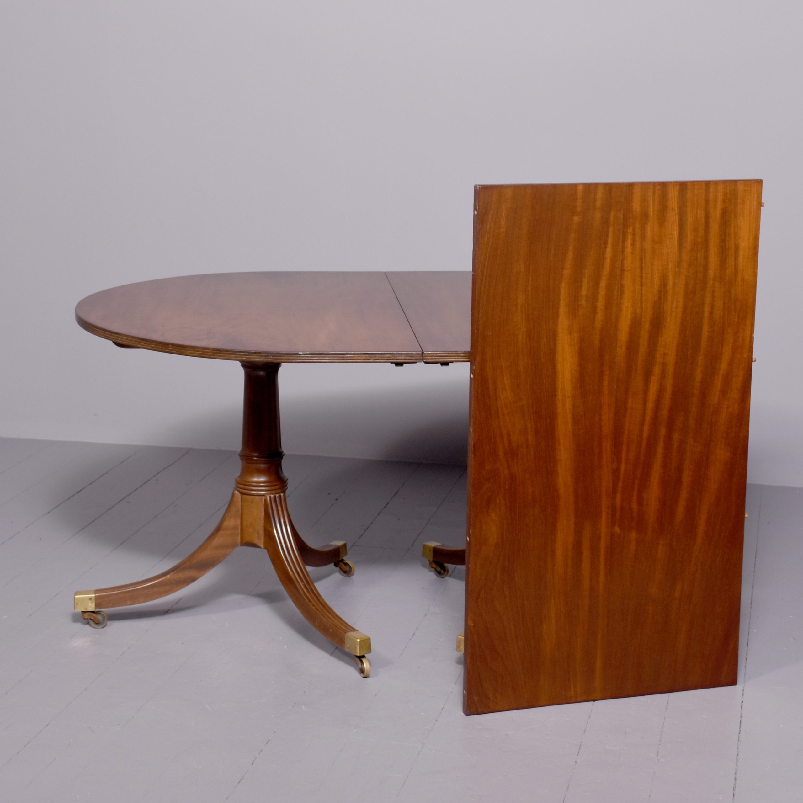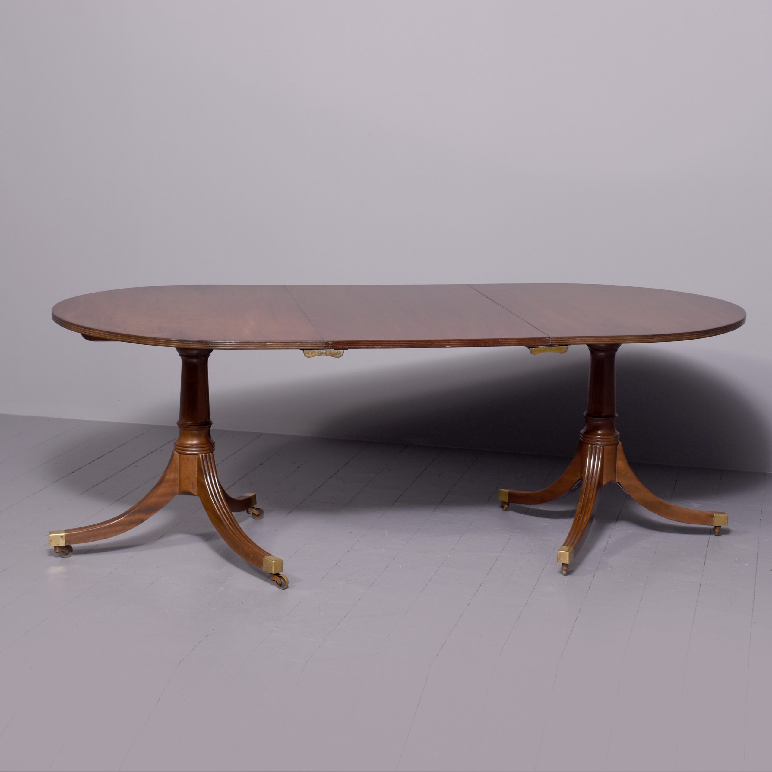 Circa 1900. A mahogany Regency style twin pillar dining table plus one extra original leaf, the tops in fine flame mahogany with ribbed fore-edge, the leaf held in place by neat size mahogany runners and four large cast brass clips and keepers, the top rest on a classic cannon barrel stem, issuing three ribbed saber legs finishing with a cast brass block with brass castors beneath, the table is clean, stylish, sturdy and functional.