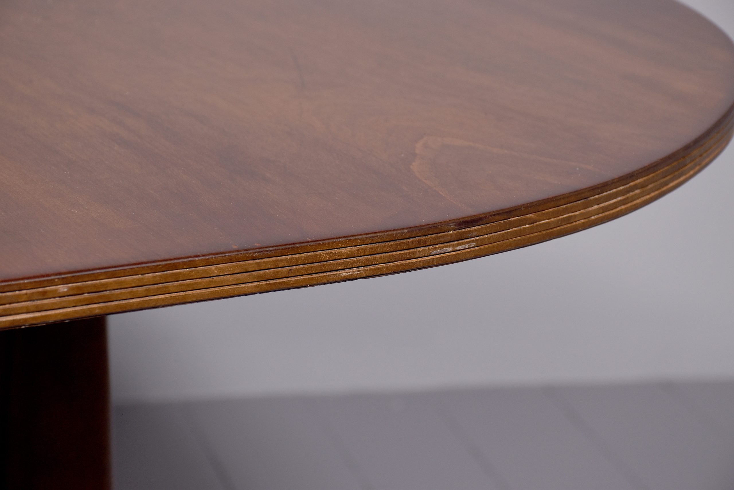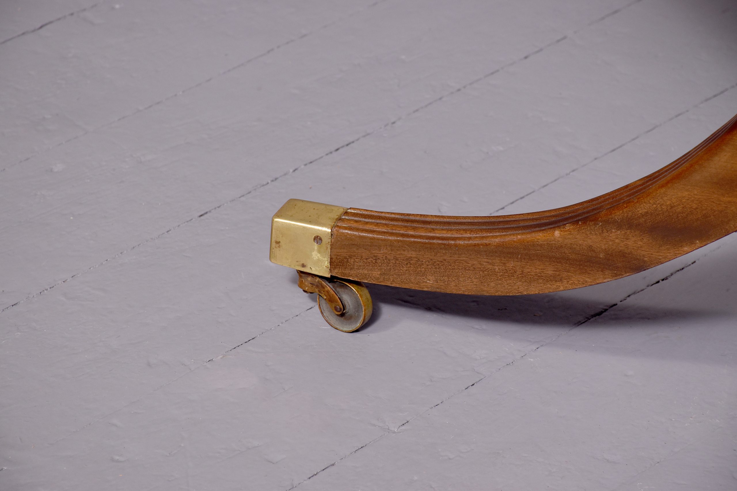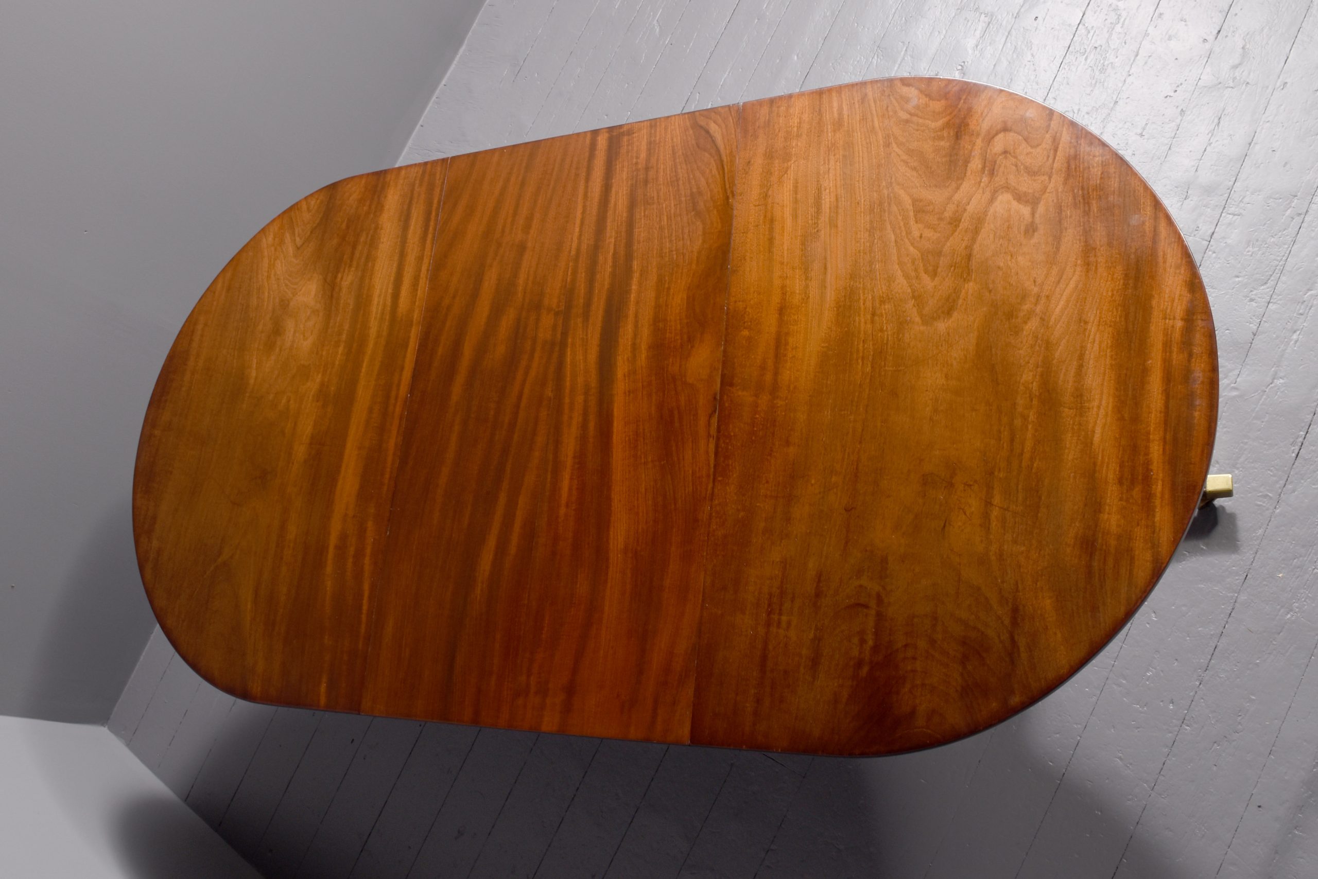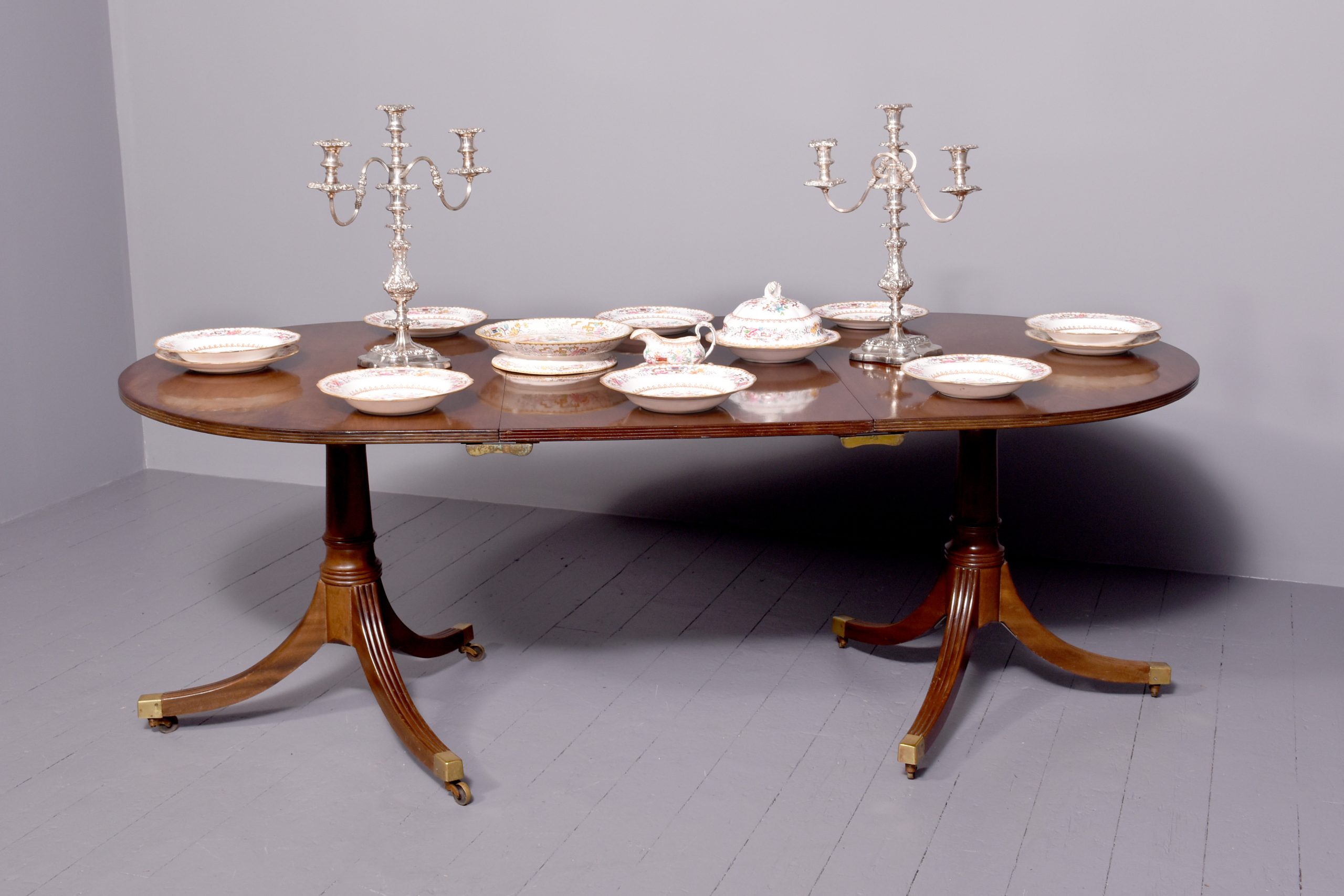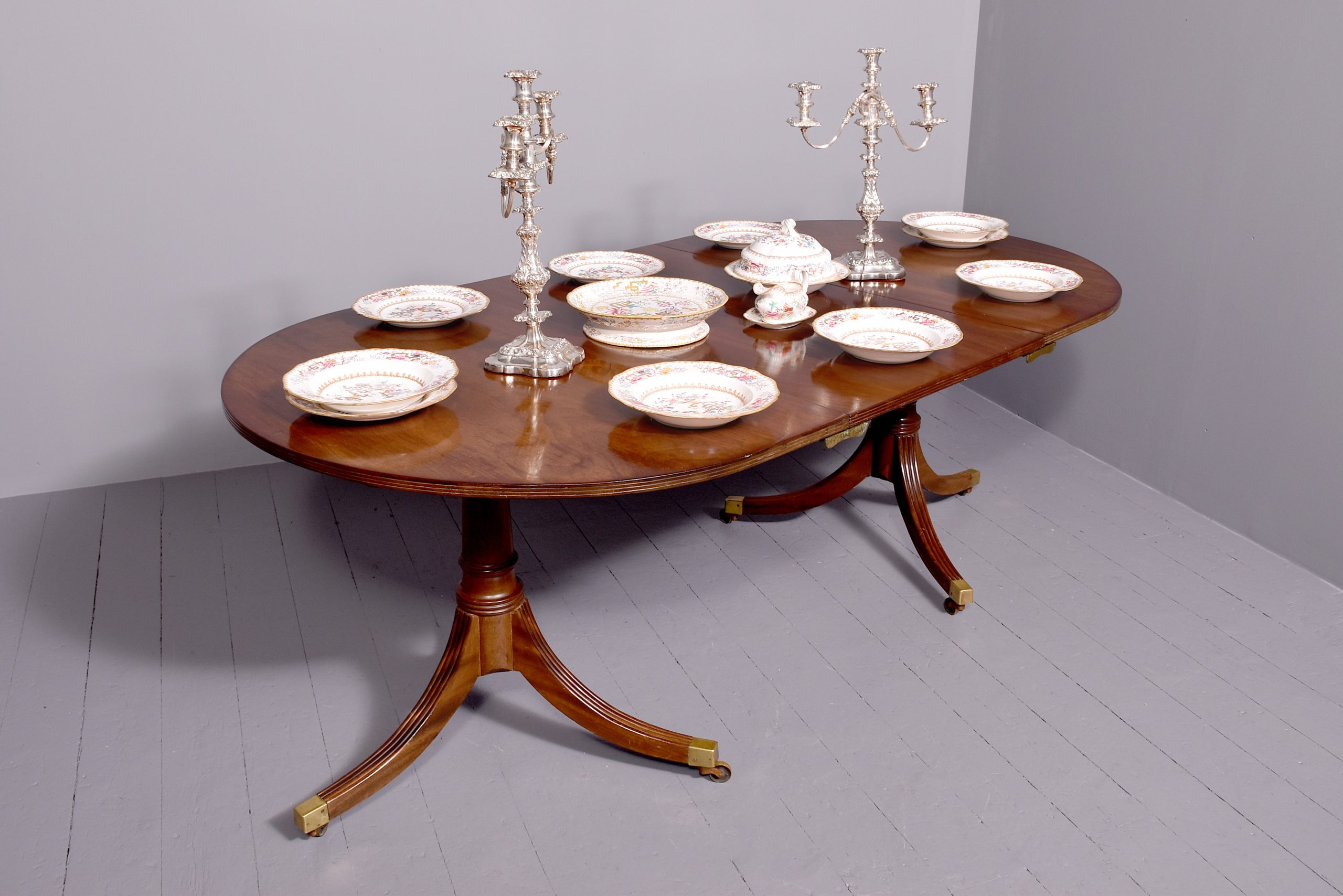 Circa 1900. A mahogany Regency style twin pillar dining table plus one extra original leaf, the tops in fine flame mahogany with ribbed fore-edge, the leaf held in place by neat size mahogany runners and four large cast brass clips and keepers, the top rest on a classic cannon barrel stem, issuing three ribbed saber legs finishing with a cast brass block with brass castors beneath, the table is clean, stylish, sturdy and functional.