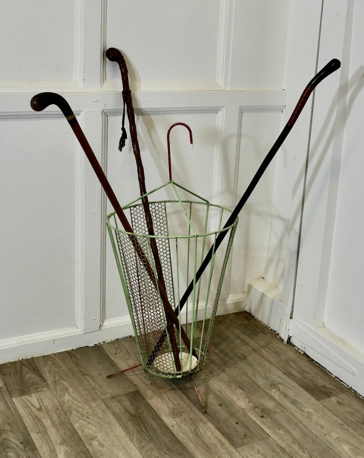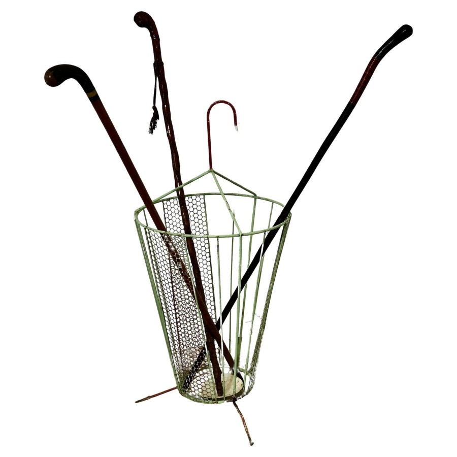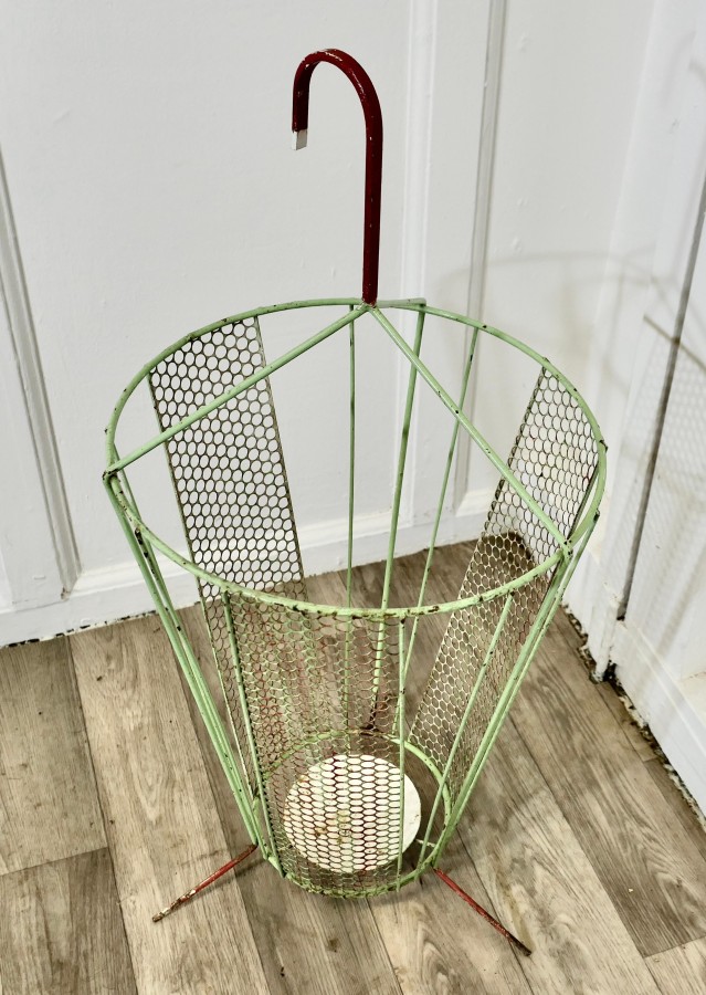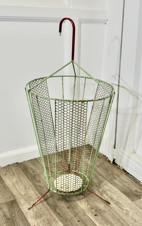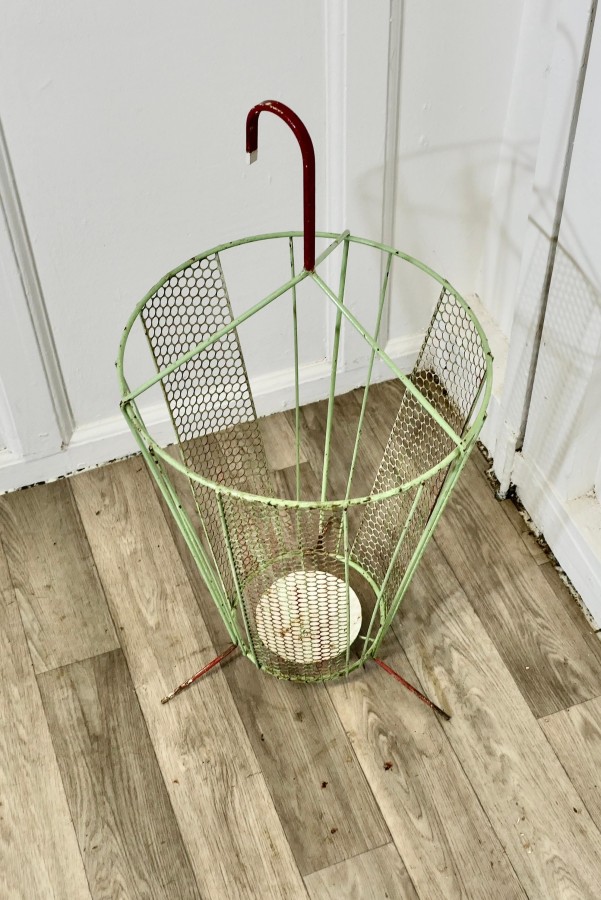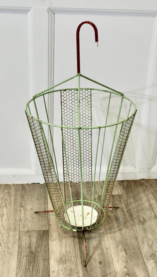 Retro Chic 50s Umbrella Shaped Umbrella Stand An unusual and attractive piece, made in wirework in the shape of a slightly open umbrella The stand has a drip tray at the bottom and a curved handle The stand is 28” tall and 13” in diameter ZX62 Manufacture Date : 1950 Materials : Metal