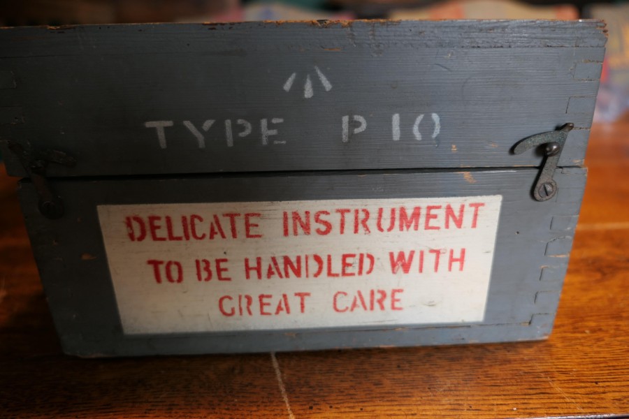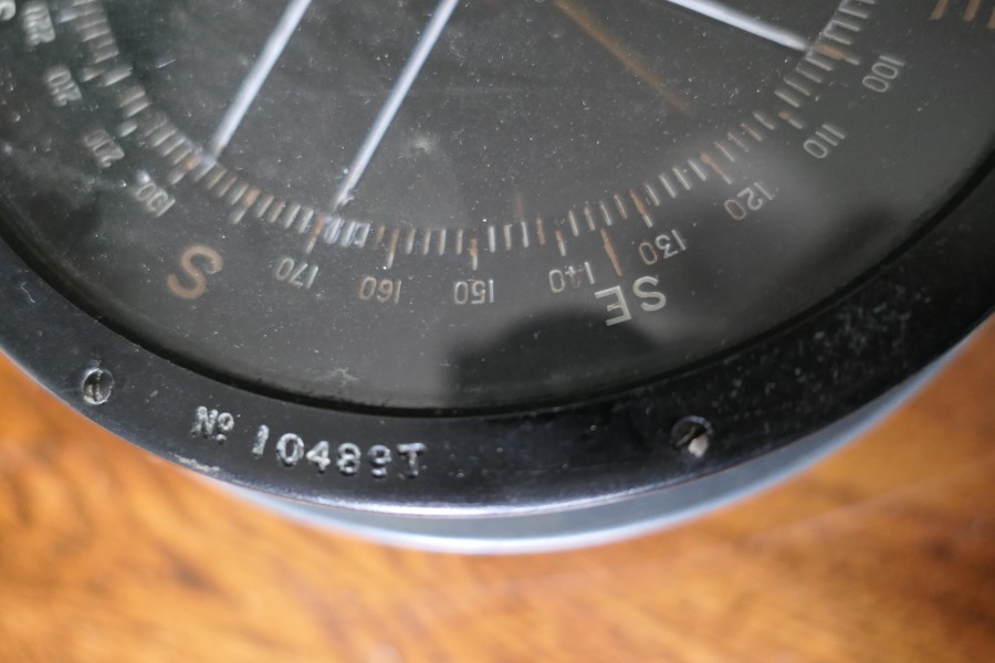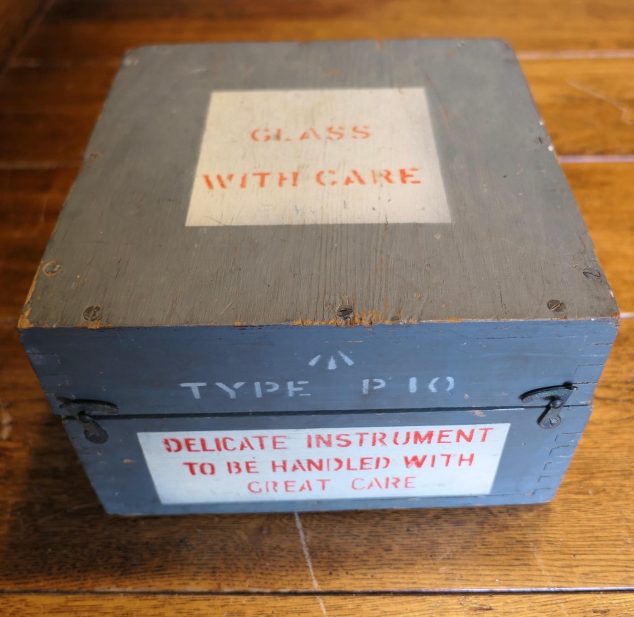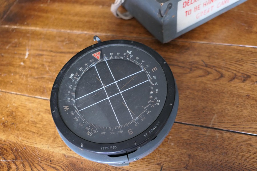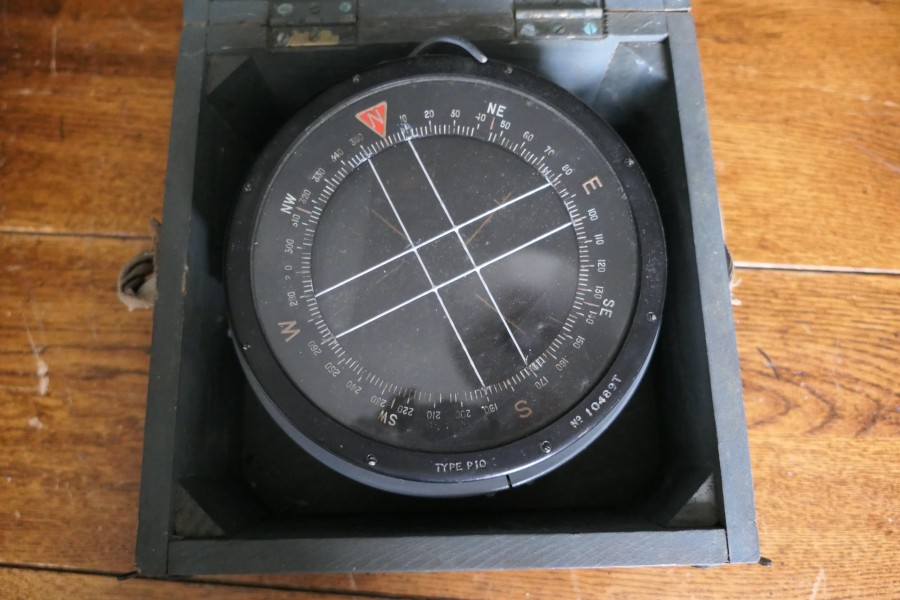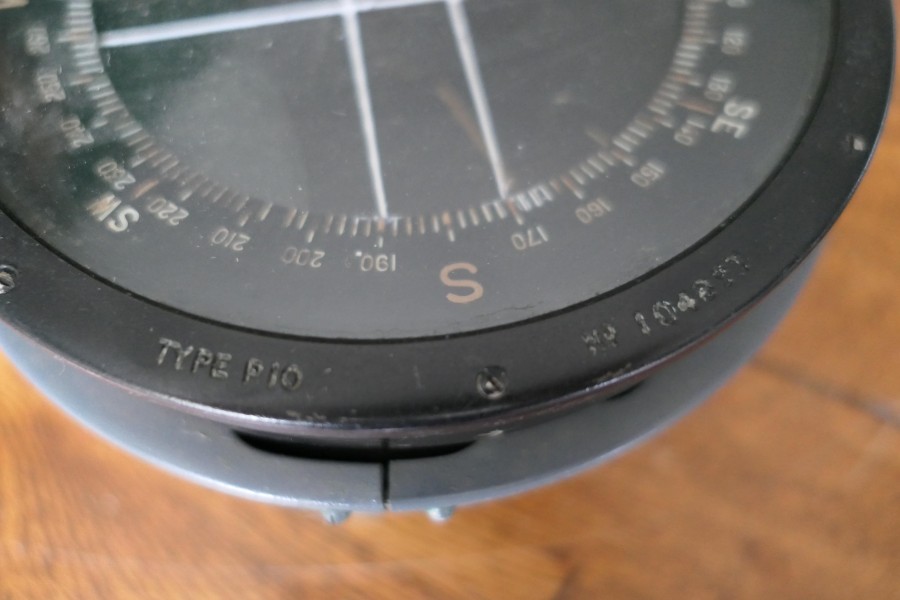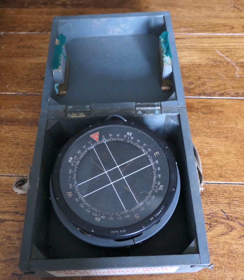 A Royal Air Force P10 aircraft compass No. 10489 T The compass has a brass body finished in black, it comes in its battleship grey painted wooden box, marked with the British Broad Arrow mark The P10 Compass was used in larger transport and bomber aircraft and was standard issue compass for the Royal Air Force during the Second World War HM100. Manufacture Date : 1930 Materials : Brass