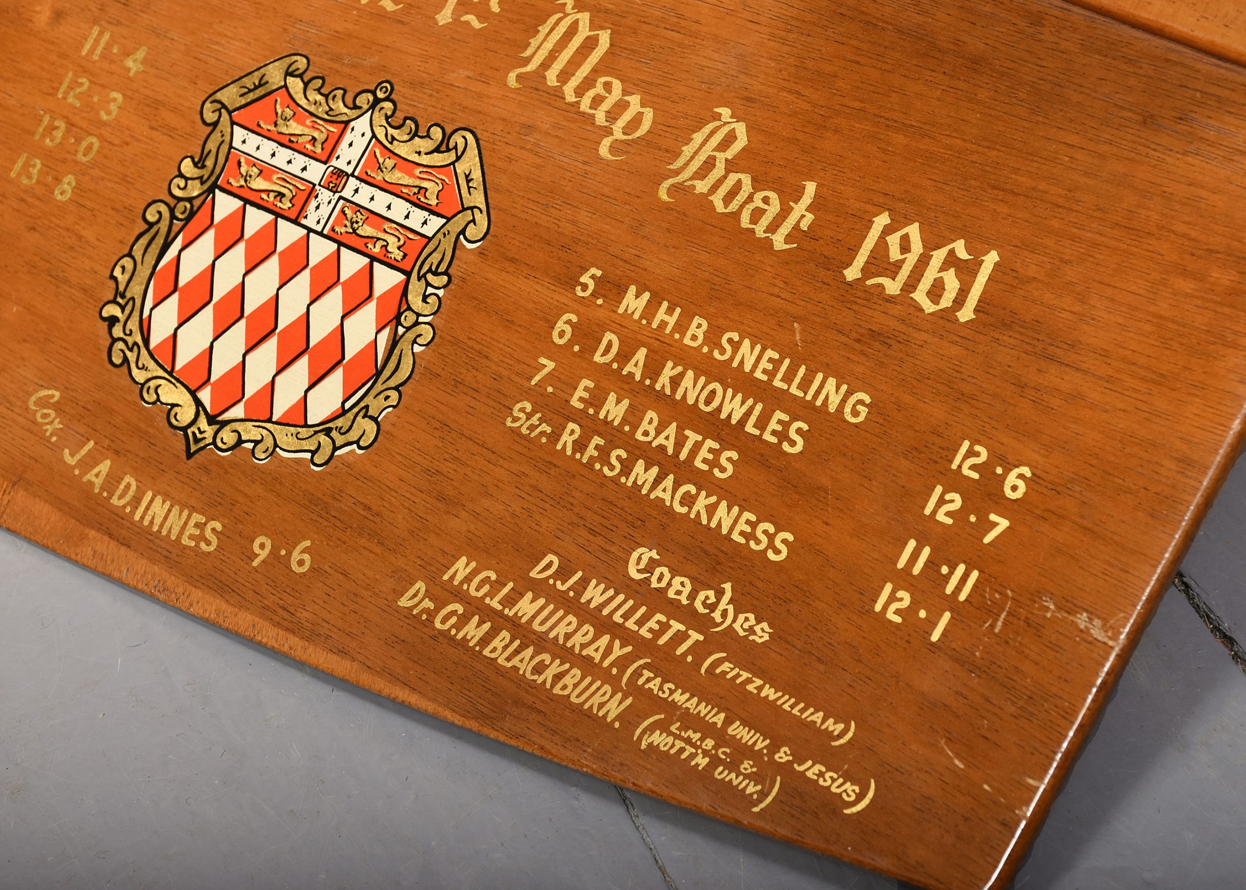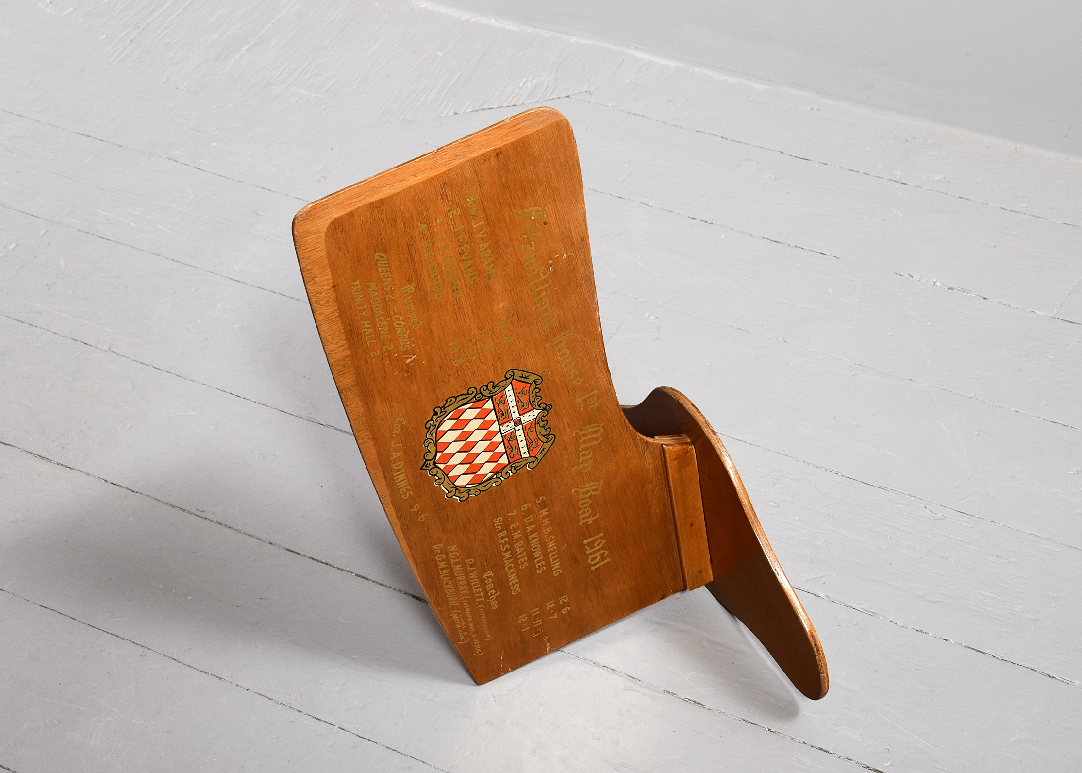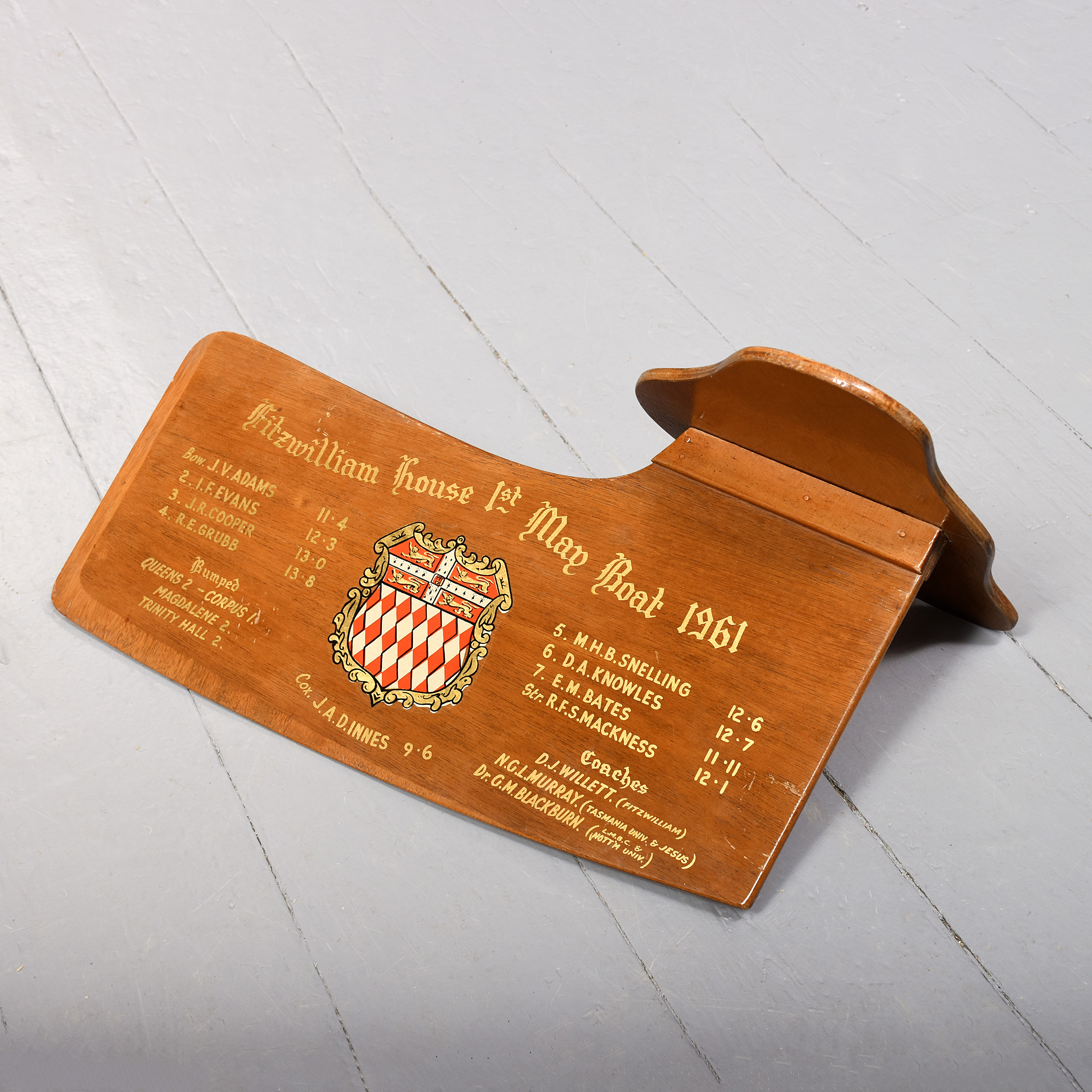 1961. Rudder from the Fitzwilliam house 1st team. May Boat Race 1961. Cox J.A.D Innes. Decorated with the Fitzwilliam house colours and all crew members’ names.