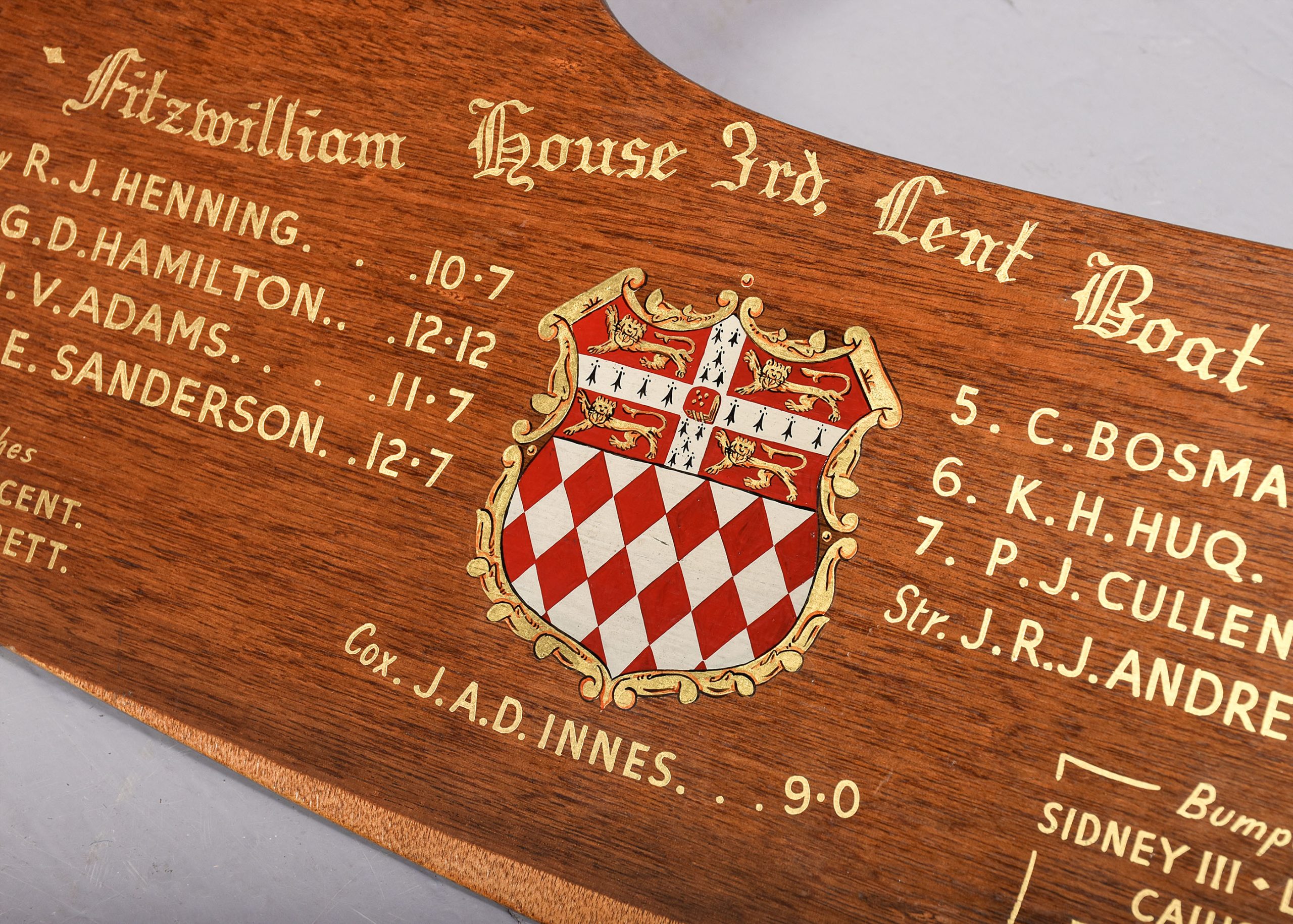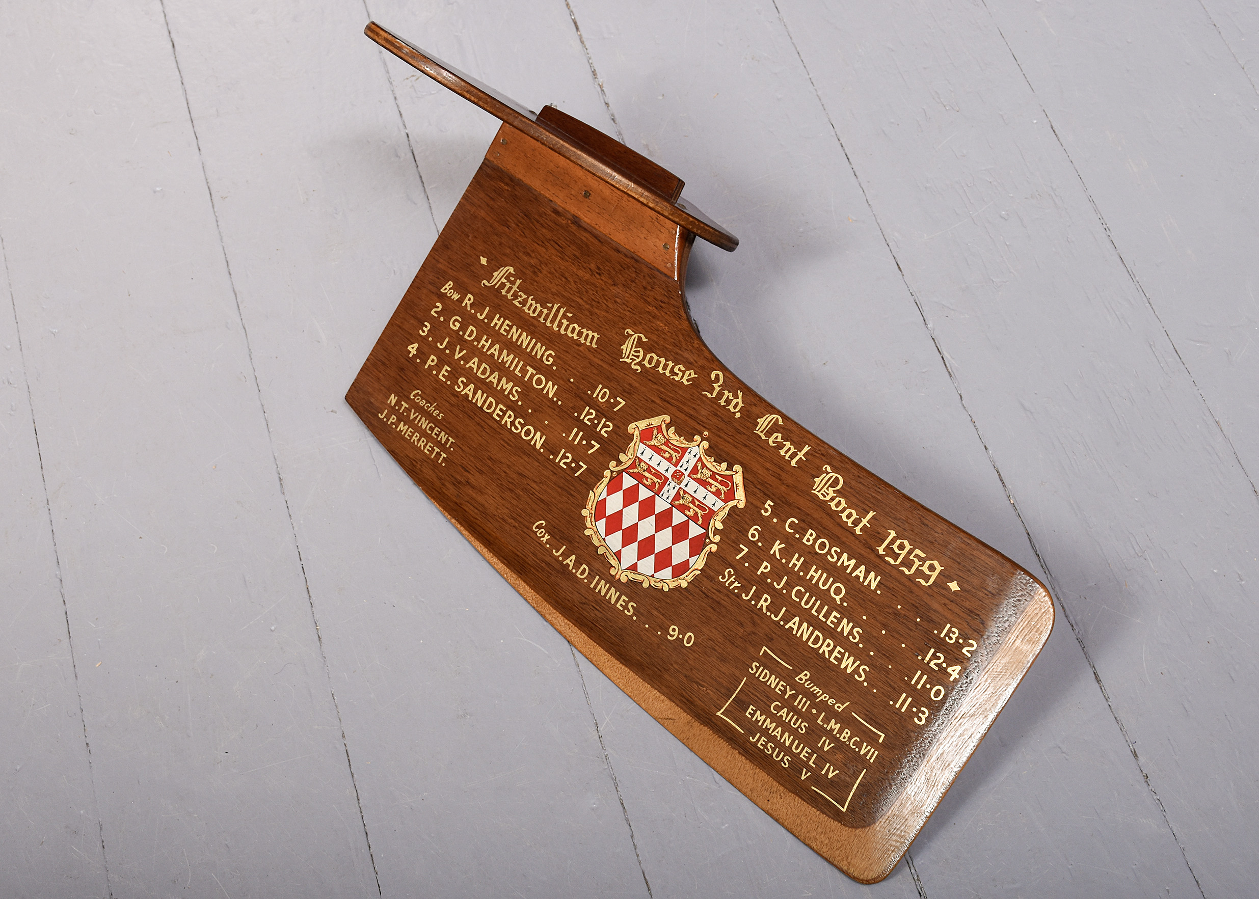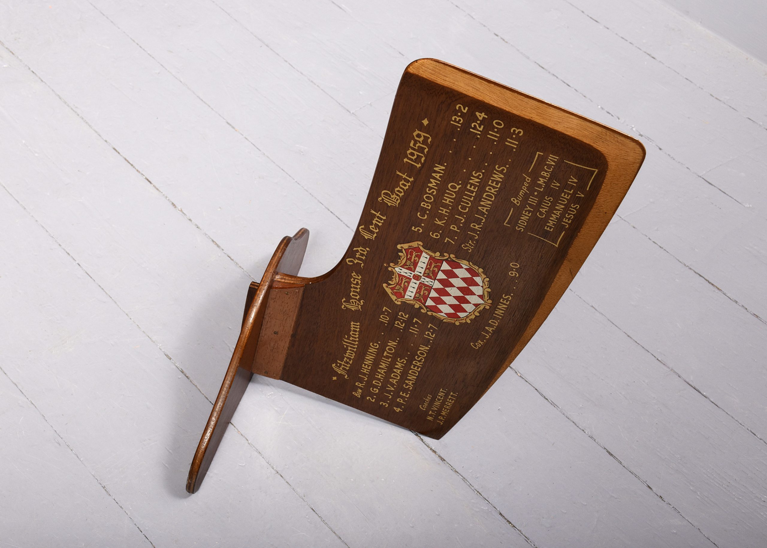 1959. Rudder from the Fitzwilliam House 3rds. Lent boat race 1959. Cox J.A.D Innes. Decorated with the Fitzwilliam house colours and all crew members’ names.