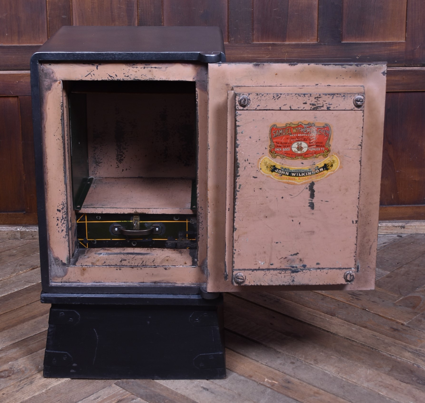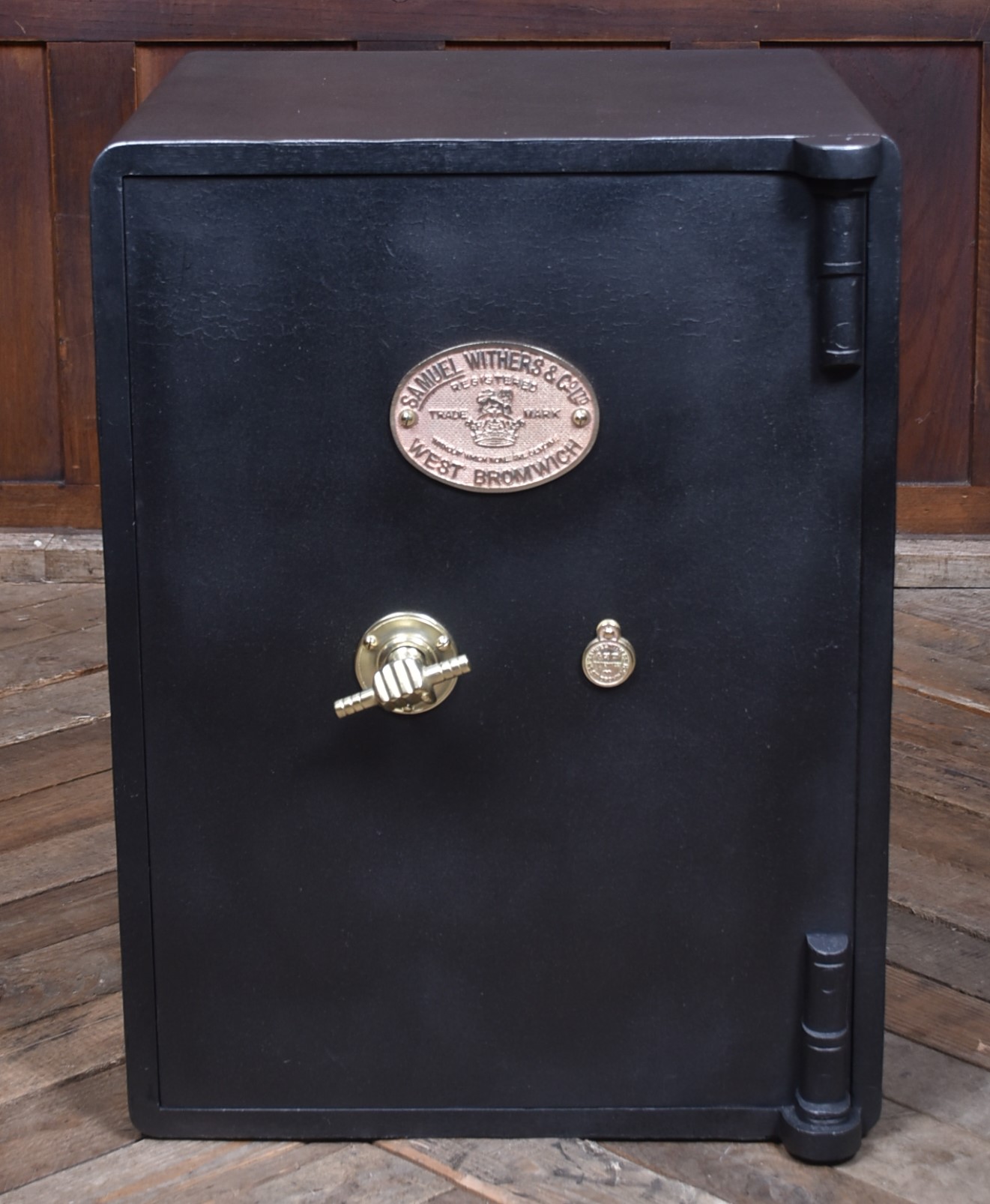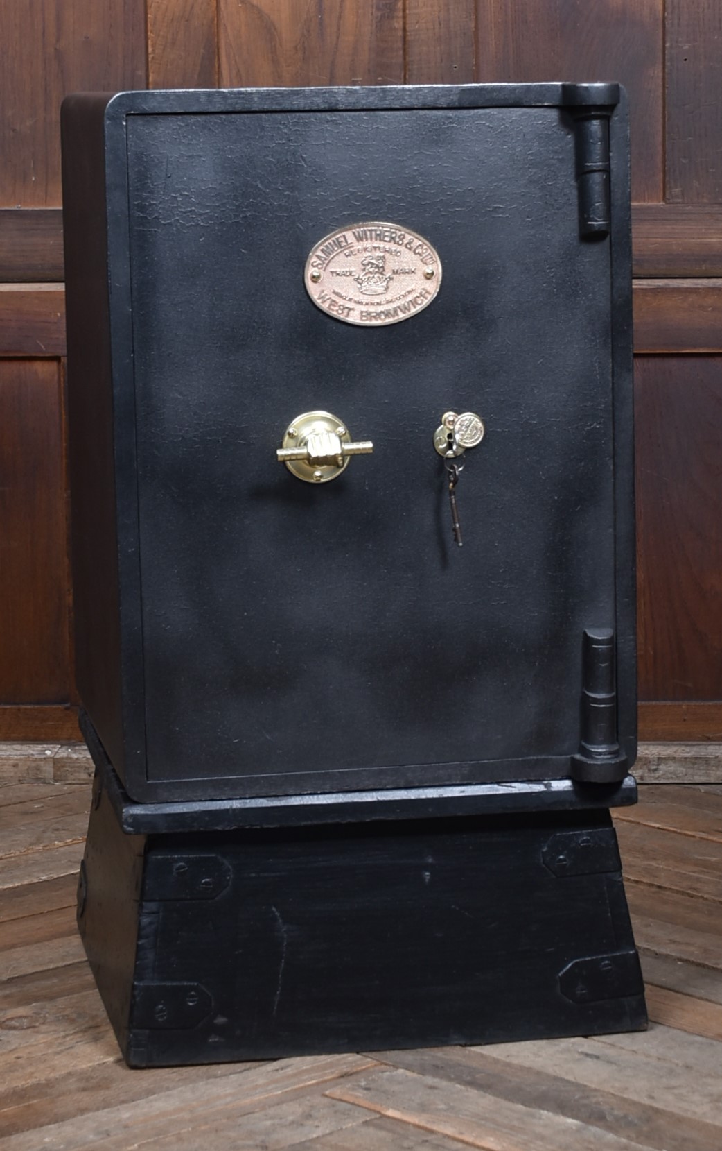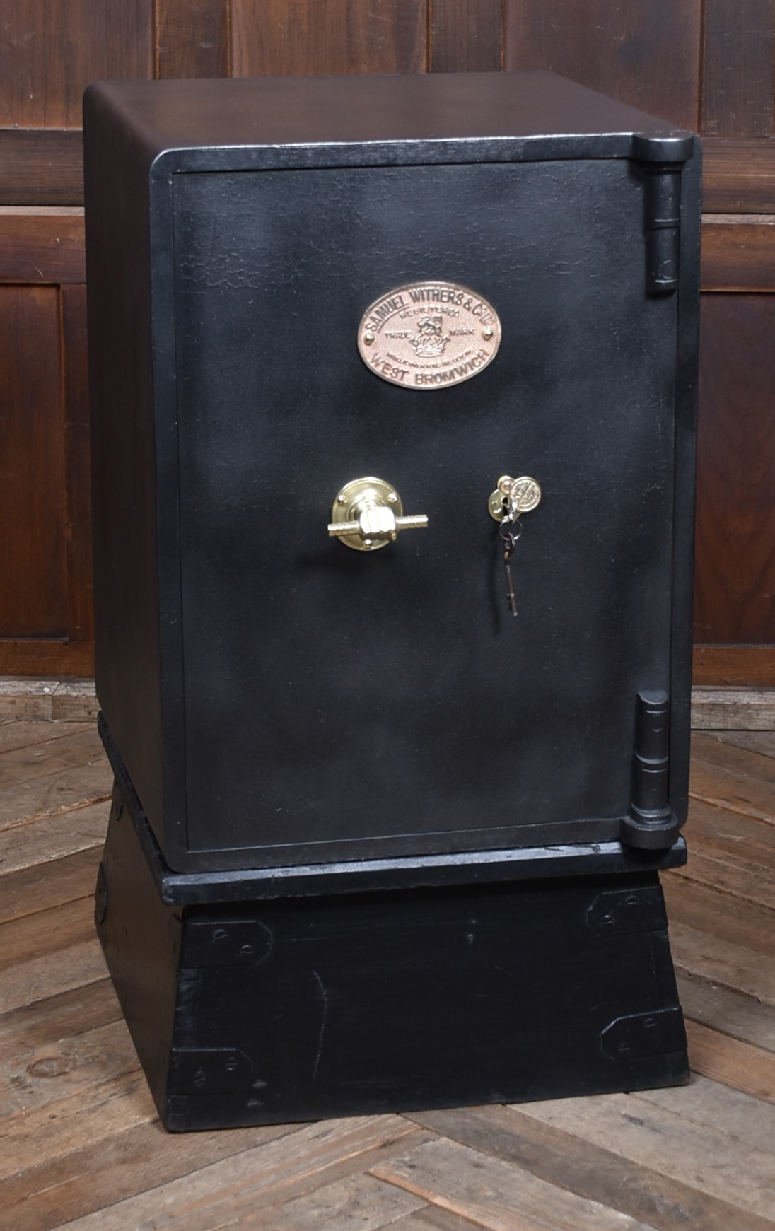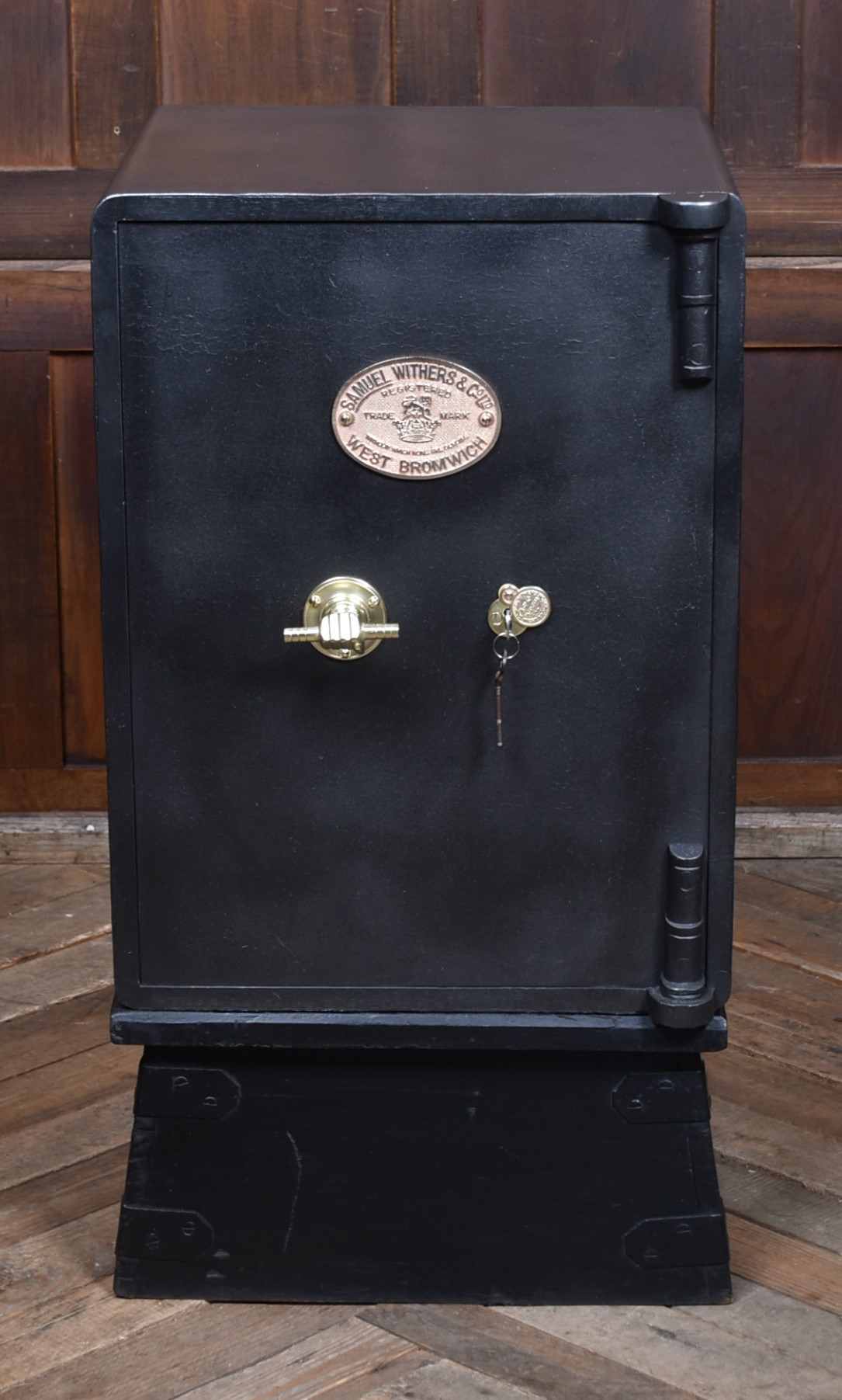 A superb Samuel Withers & Co. safe of West Bromwich, presented in excellent antique condition and retaining both original working keys for the main door. The safe stands on its purpose-made metal stand, giving it an attractive presence and a practical working height while also enhancing its industrial character. The safe has a classic black-painted exterior, enhanced by brass fittings, including a distinctive brass handle modelled as a hand gripping a baton and a matching brass keyhole plate. A prominent oval brass maker’s plaque to the front clearly states the Withers trade mark, underscoring its authenticity and historical significance. Inside, the safe remains tidy and fully functional, with surfaces showing only the gentle, honest wear expected from more than a century of use. It features a fitted lockable drawer, complete with its original working key, offering secure internal storage. The inside of the door retains its colourful Samuel Withers & Co. Ltd label, a charming and rarely surviving detail that adds both provenance and period character.