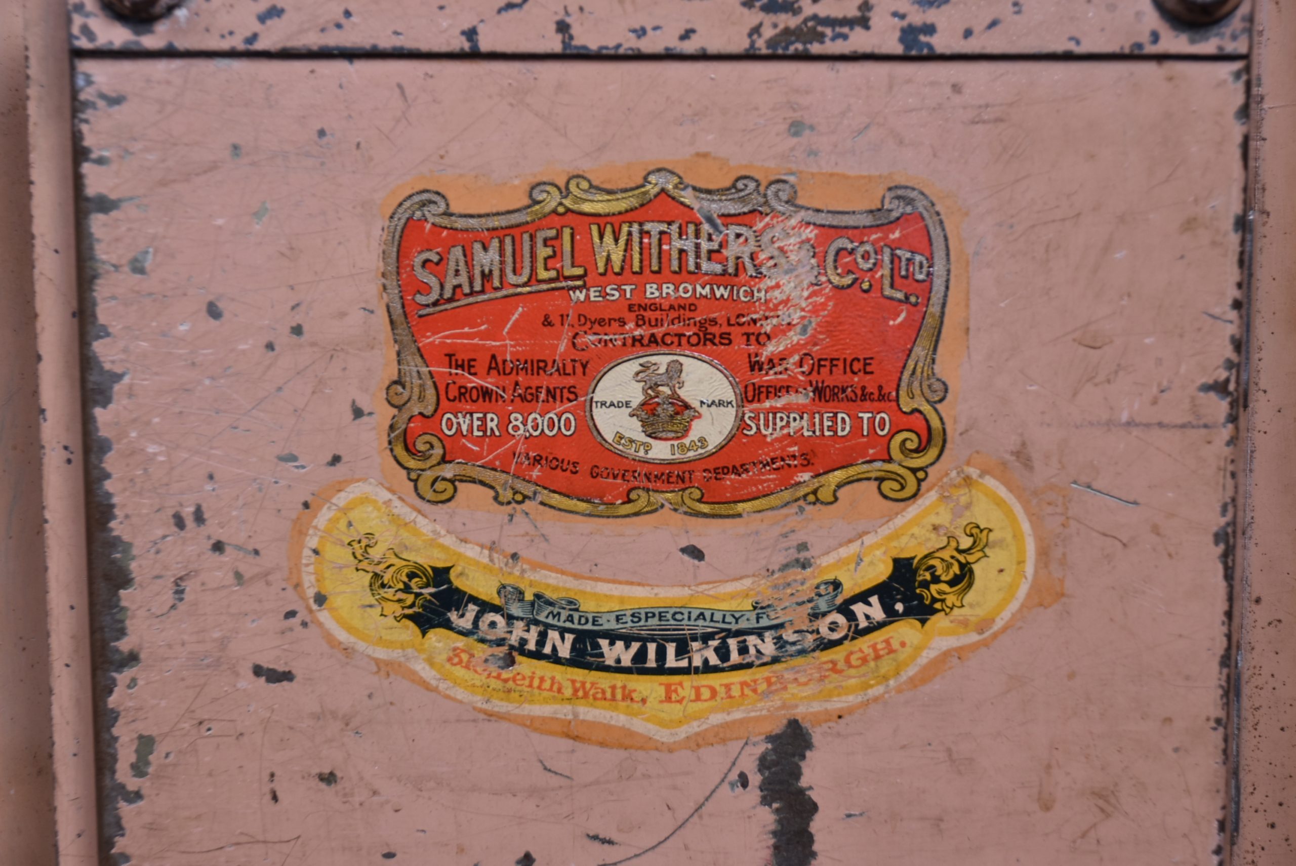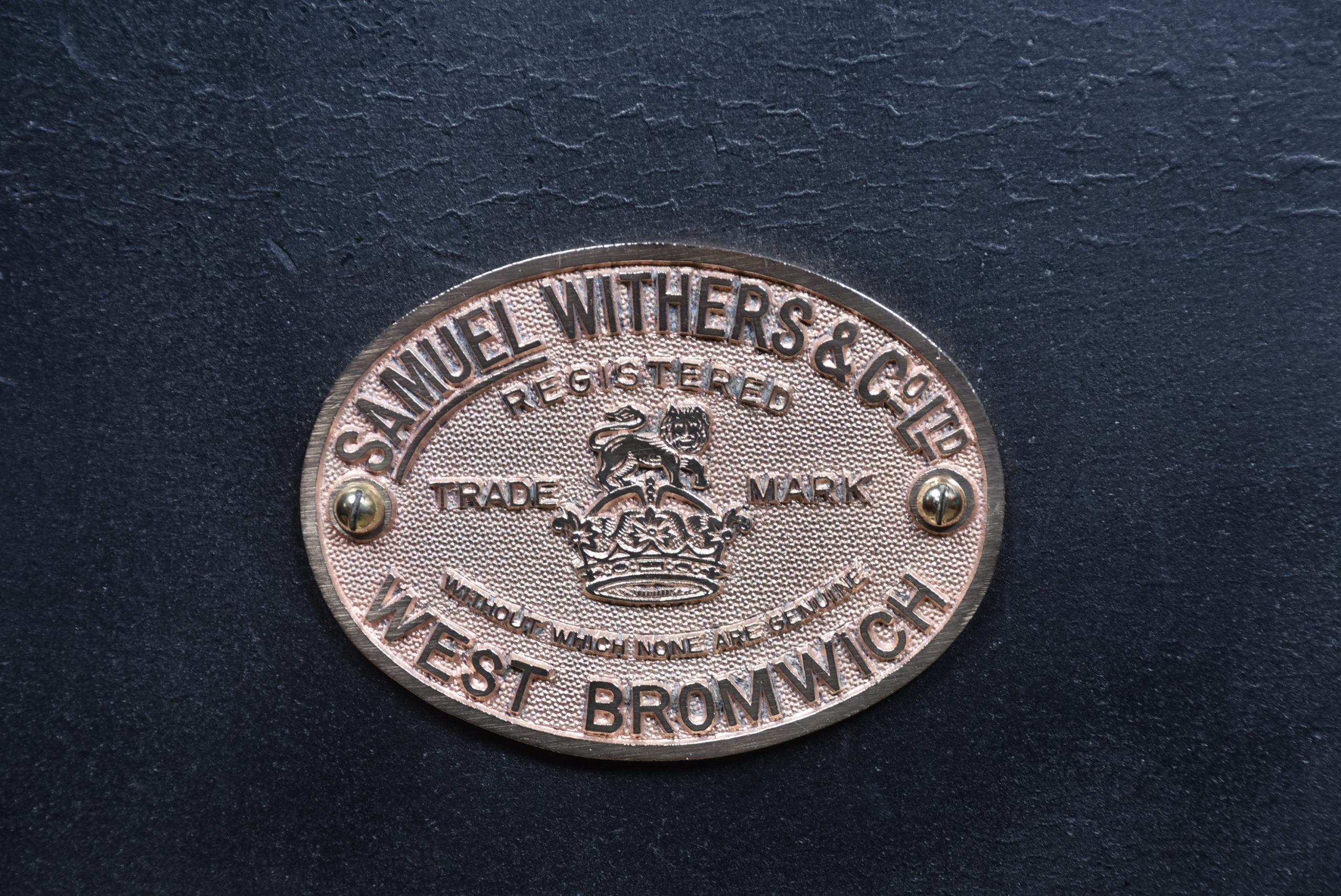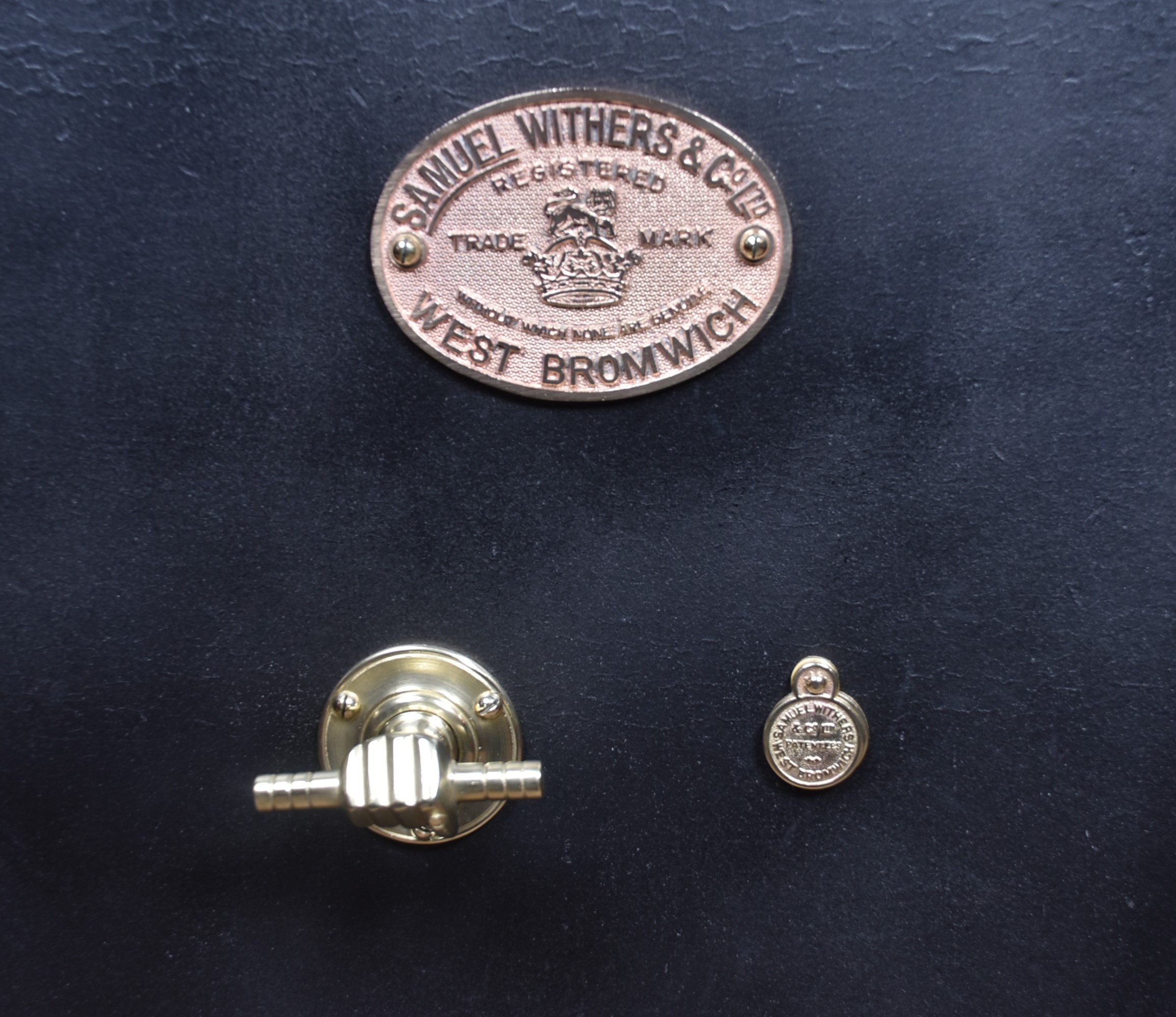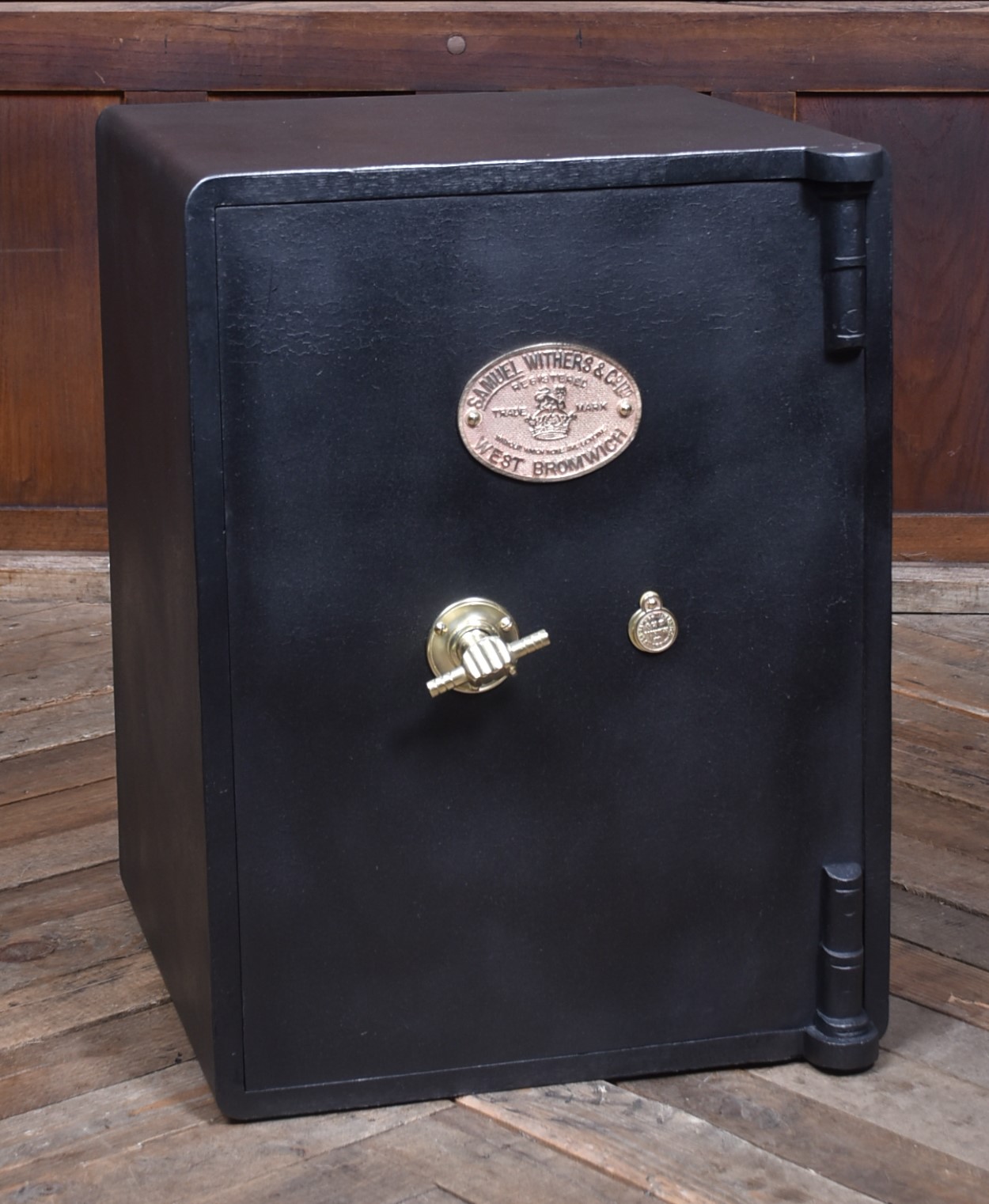 A superb Samuel Withers & Co. safe of West Bromwich, presented in excellent antique condition and retaining both original working keys for the main door. The safe stands on its purpose-made metal stand, giving it an attractive presence and a practical working height while also enhancing its industrial character. The safe has a classic black-painted exterior, enhanced by brass fittings, including a distinctive brass handle modelled as a hand gripping a baton and a matching brass keyhole plate. A prominent oval brass maker’s plaque to the front clearly states the Withers trade mark, underscoring its authenticity and historical significance. Inside, the safe remains tidy and fully functional, with surfaces showing only the gentle, honest wear expected from more than a century of use. It features a fitted lockable drawer, complete with its original working key, offering secure internal storage. The inside of the door retains its colourful Samuel Withers & Co. Ltd label, a charming and rarely surviving detail that adds both provenance and period character.