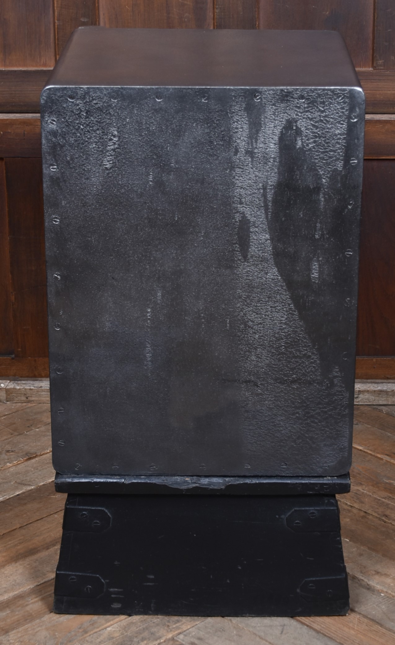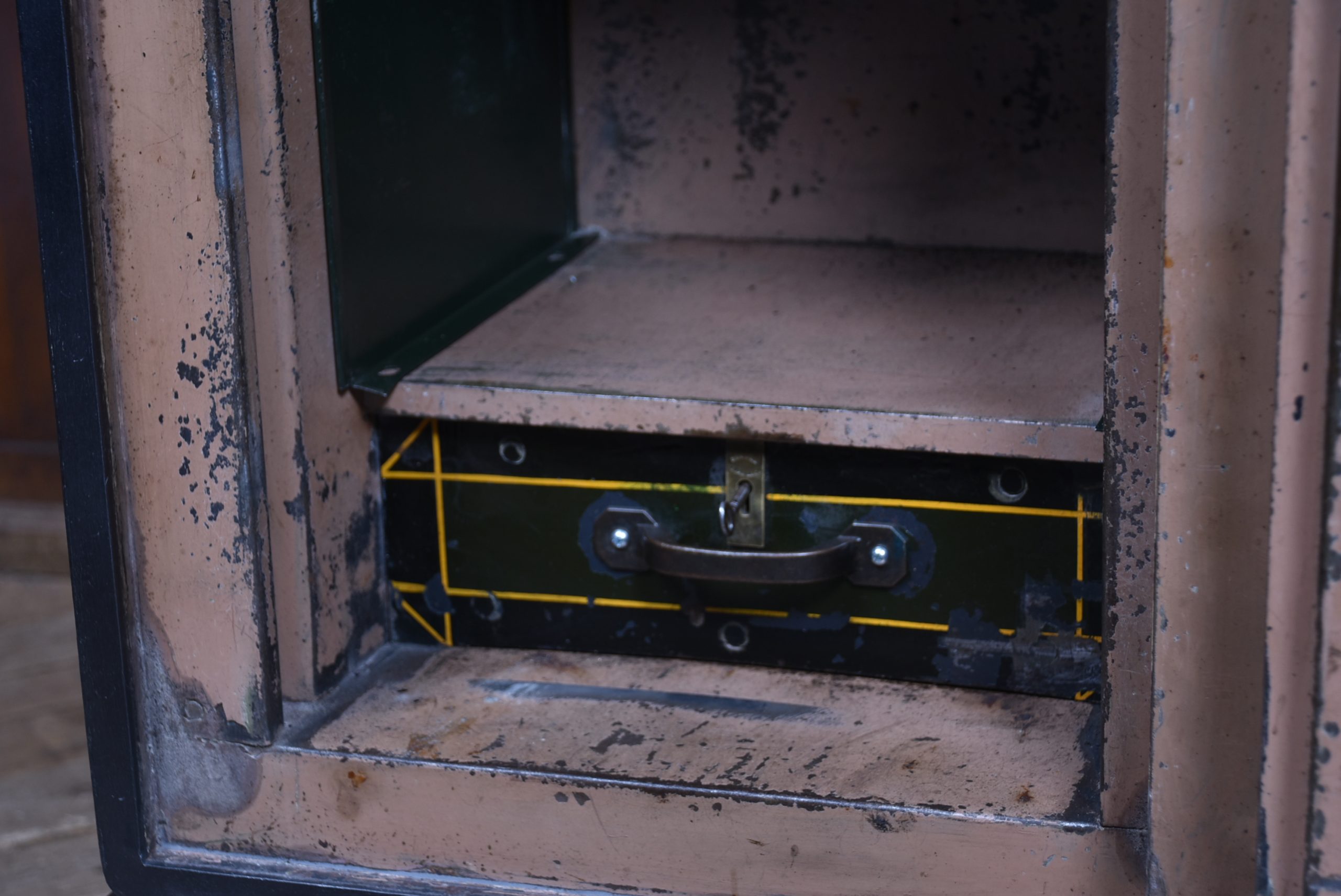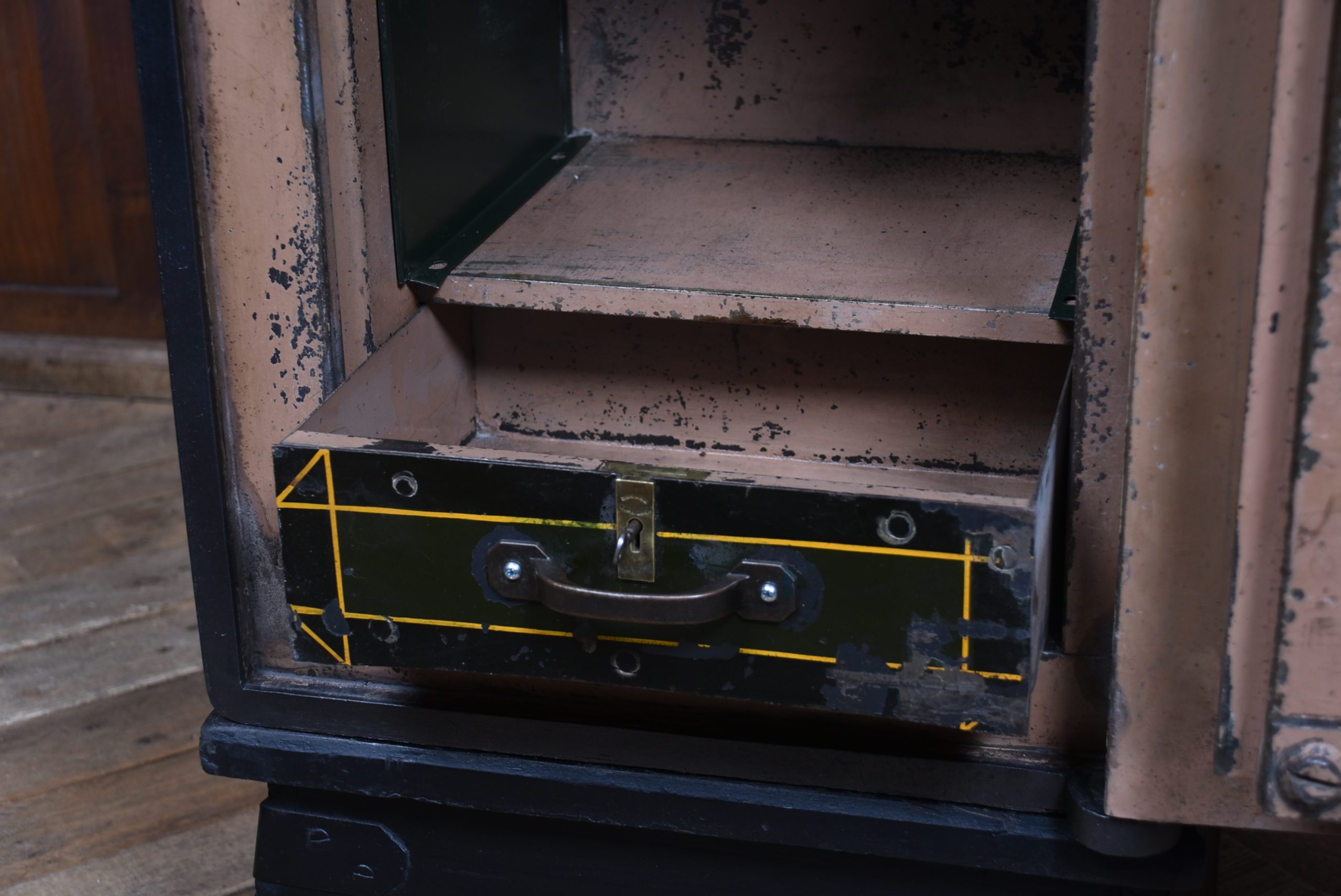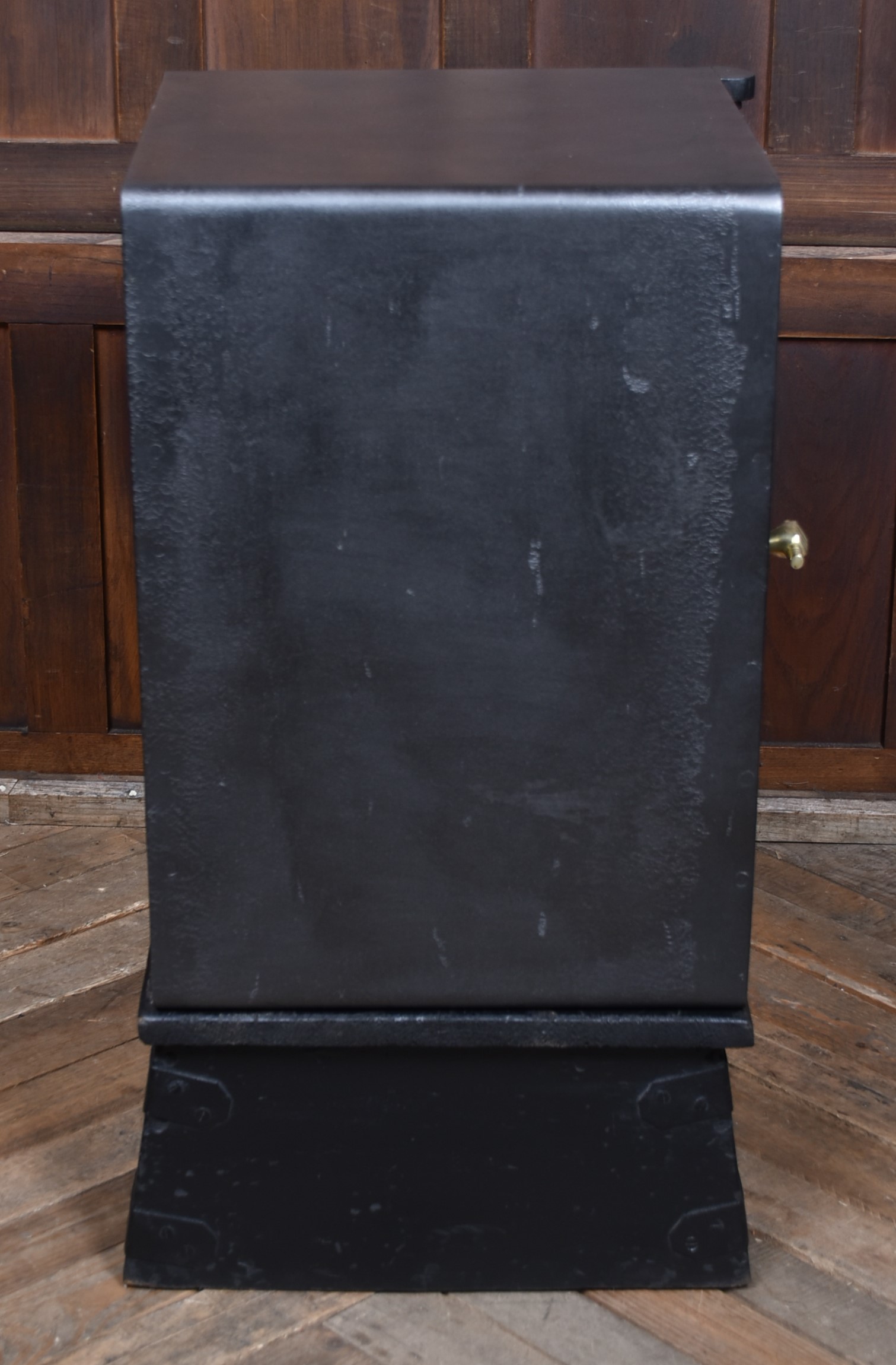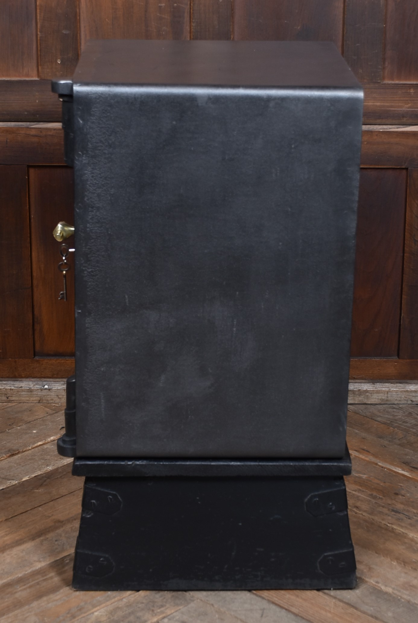 A superb Samuel Withers & Co. safe of West Bromwich, presented in excellent antique condition and retaining both original working keys for the main door. The safe stands on its purpose-made metal stand, giving it an attractive presence and a practical working height while also enhancing its industrial character. The safe has a classic black-painted exterior, enhanced by brass fittings, including a distinctive brass handle modelled as a hand gripping a baton and a matching brass keyhole plate. A prominent oval brass maker’s plaque to the front clearly states the Withers trade mark, underscoring its authenticity and historical significance. Inside, the safe remains tidy and fully functional, with surfaces showing only the gentle, honest wear expected from more than a century of use. It features a fitted lockable drawer, complete with its original working key, offering secure internal storage. The inside of the door retains its colourful Samuel Withers & Co. Ltd label, a charming and rarely surviving detail that adds both provenance and period character.
