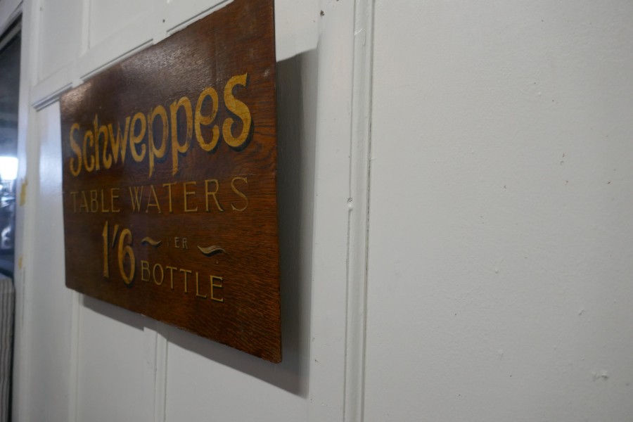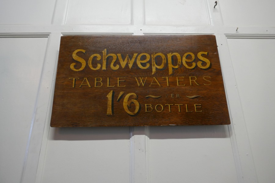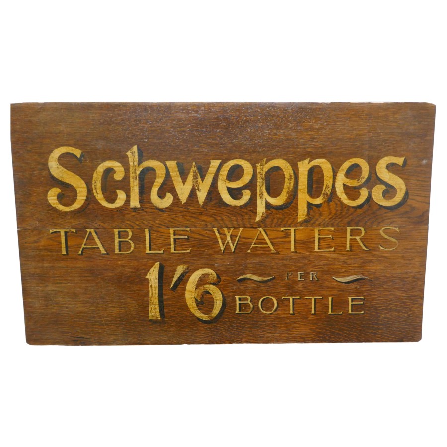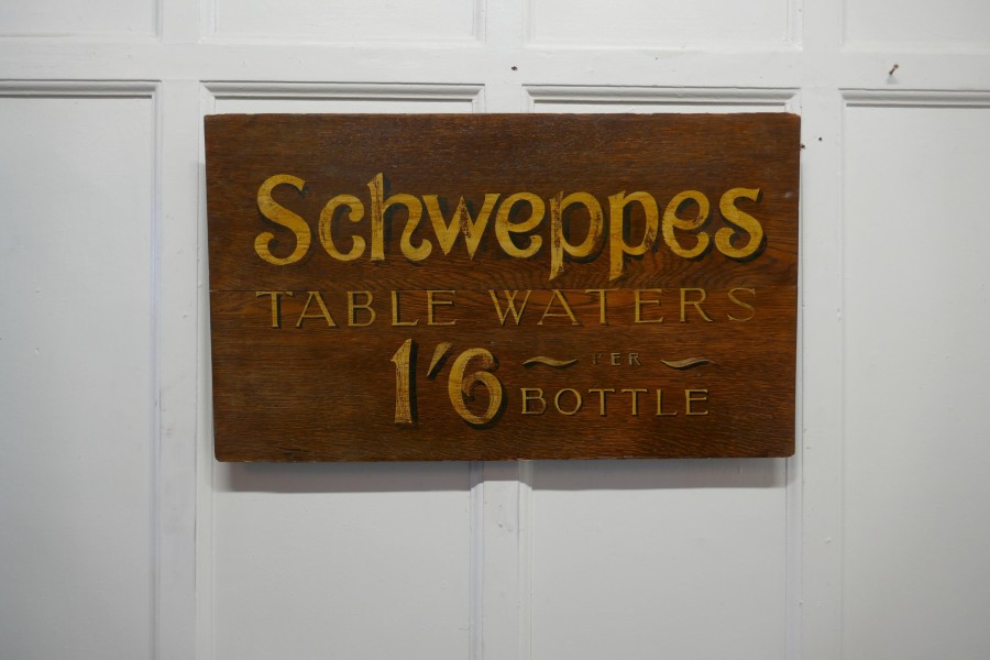 Schweppes table waters oak trade sign board This charming Oak Trade Sign would have been hung on the wall at the entrance to a hotel or bar, it has gold Shadow Writing announcing the price of Schweppes Table Waters as 1 shilling and six pence per bottle Measures: The Sign is 31” wide, 18” high and 2” deep TAC76. Manufacture Date : 1960 Materials : Oak