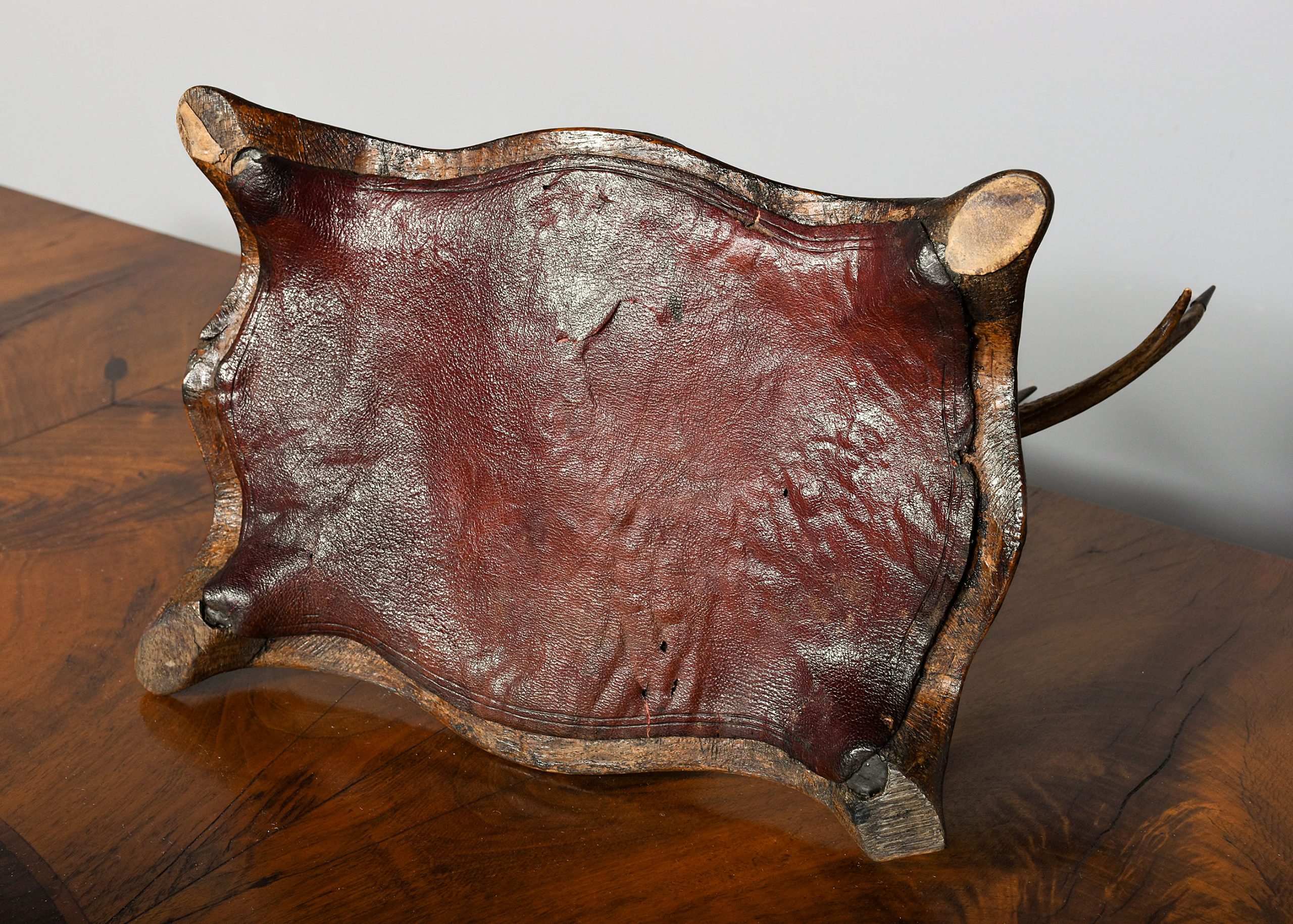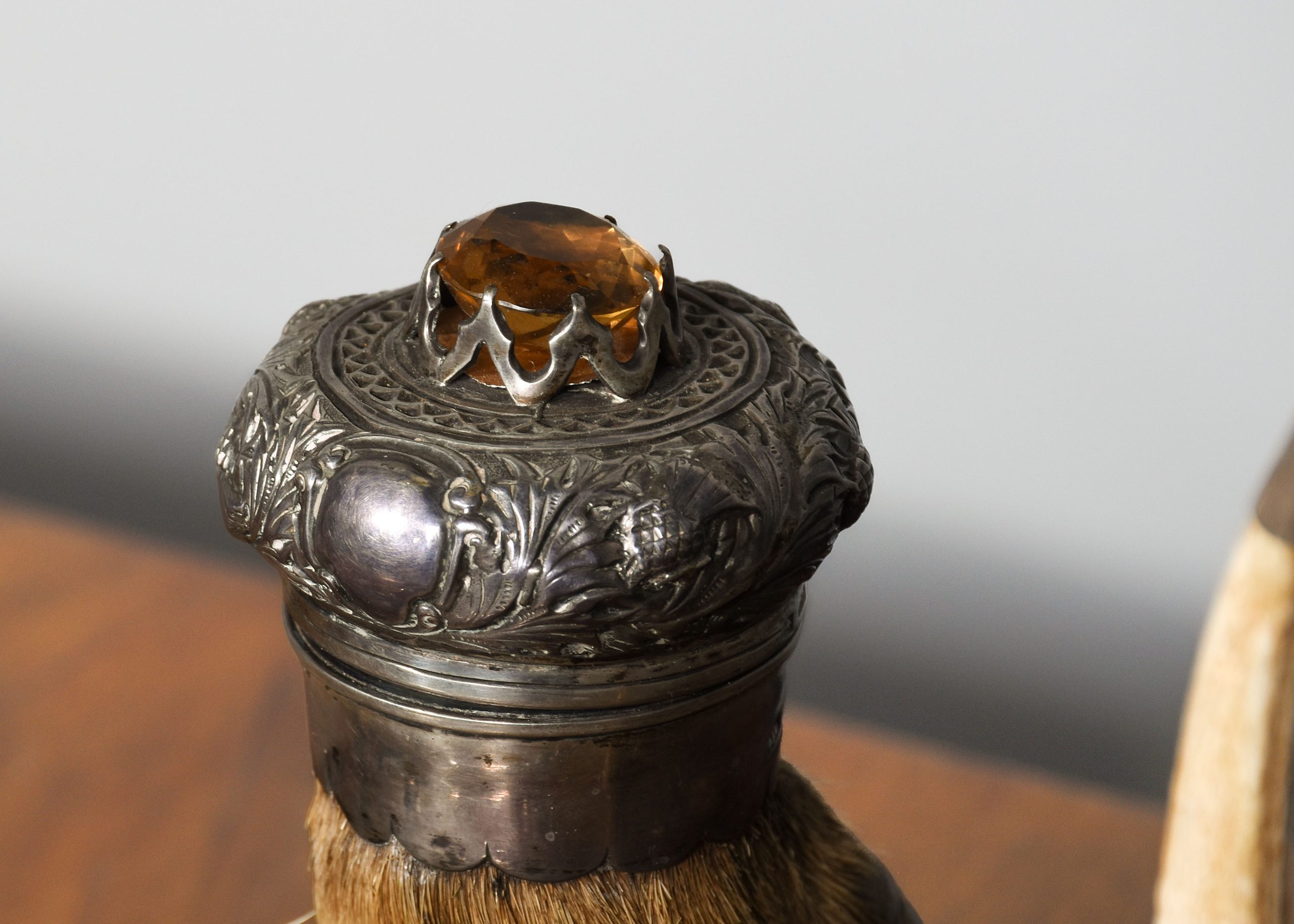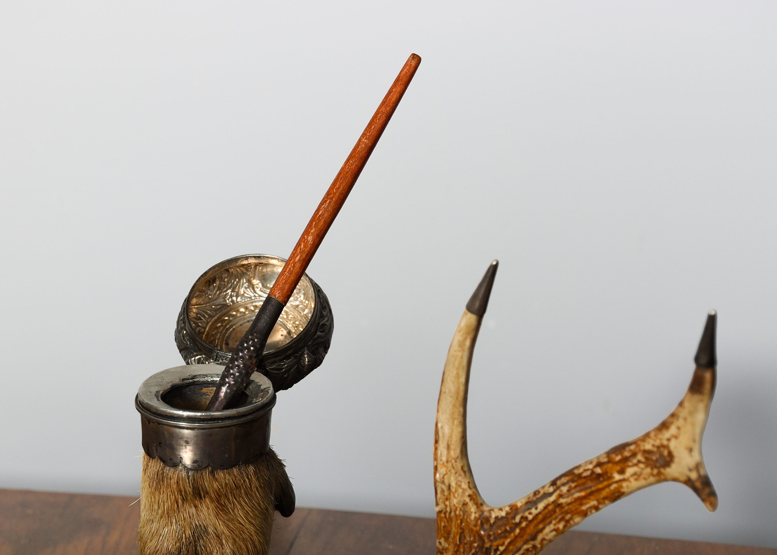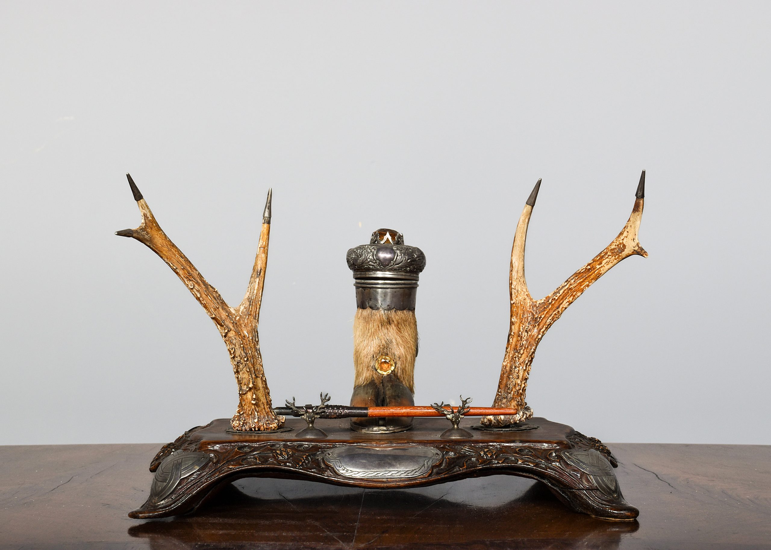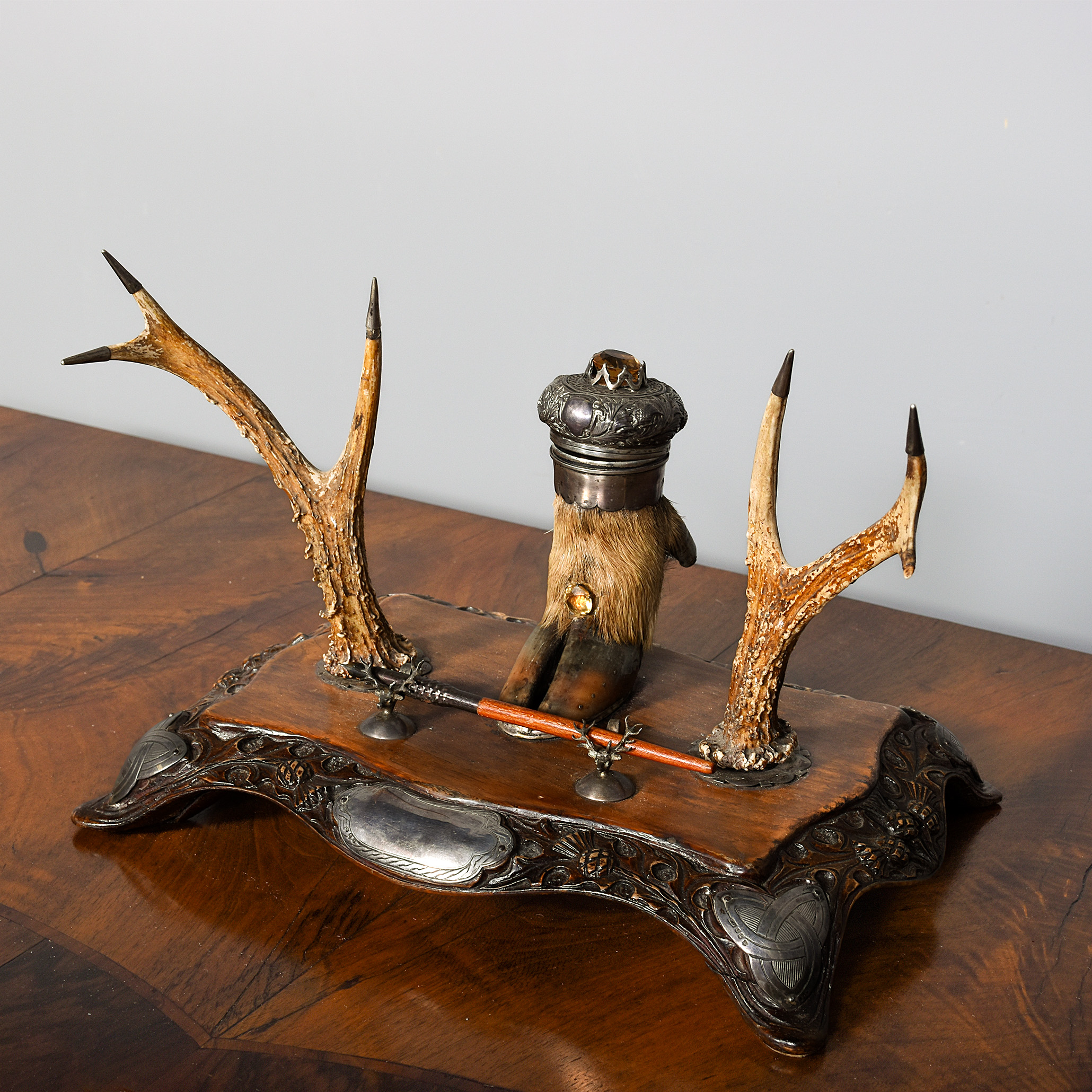 Dated 1859. A mid-Victorian oak and silver-mounted desk set. The center with a deer foot mounted in silver with cut stones, and a hallmarked lidded ink well, with two small antlers with silver mounts on the tips, and a small pair of metal deer heads holding a pen, all resting on a shaped carved base with thistle carving on all sides and five various silver mounts with Celtic patterns, resting on stylish feet, the underside covered in leather. One of the hallmarks is for Edinburgh in 1859.