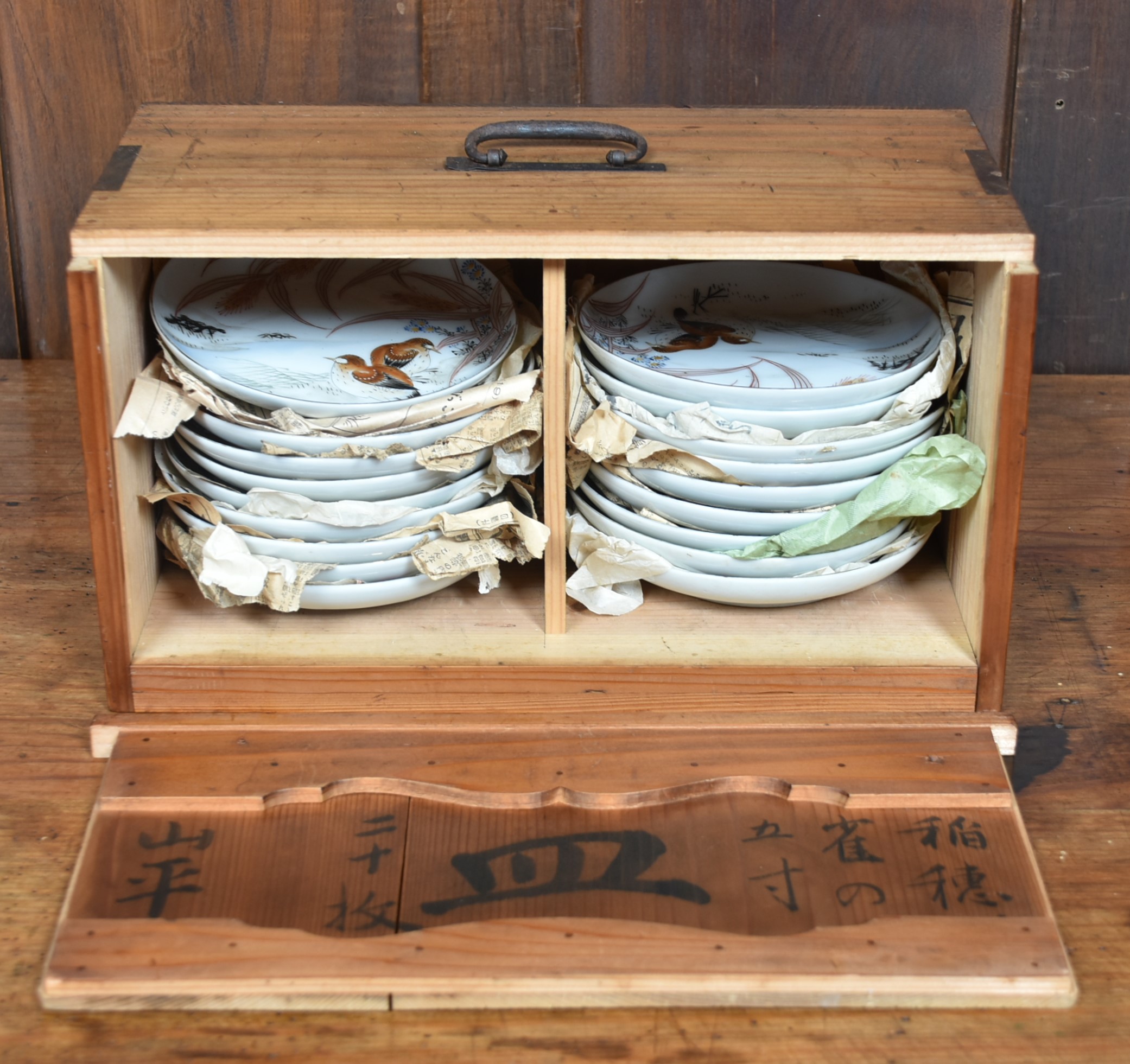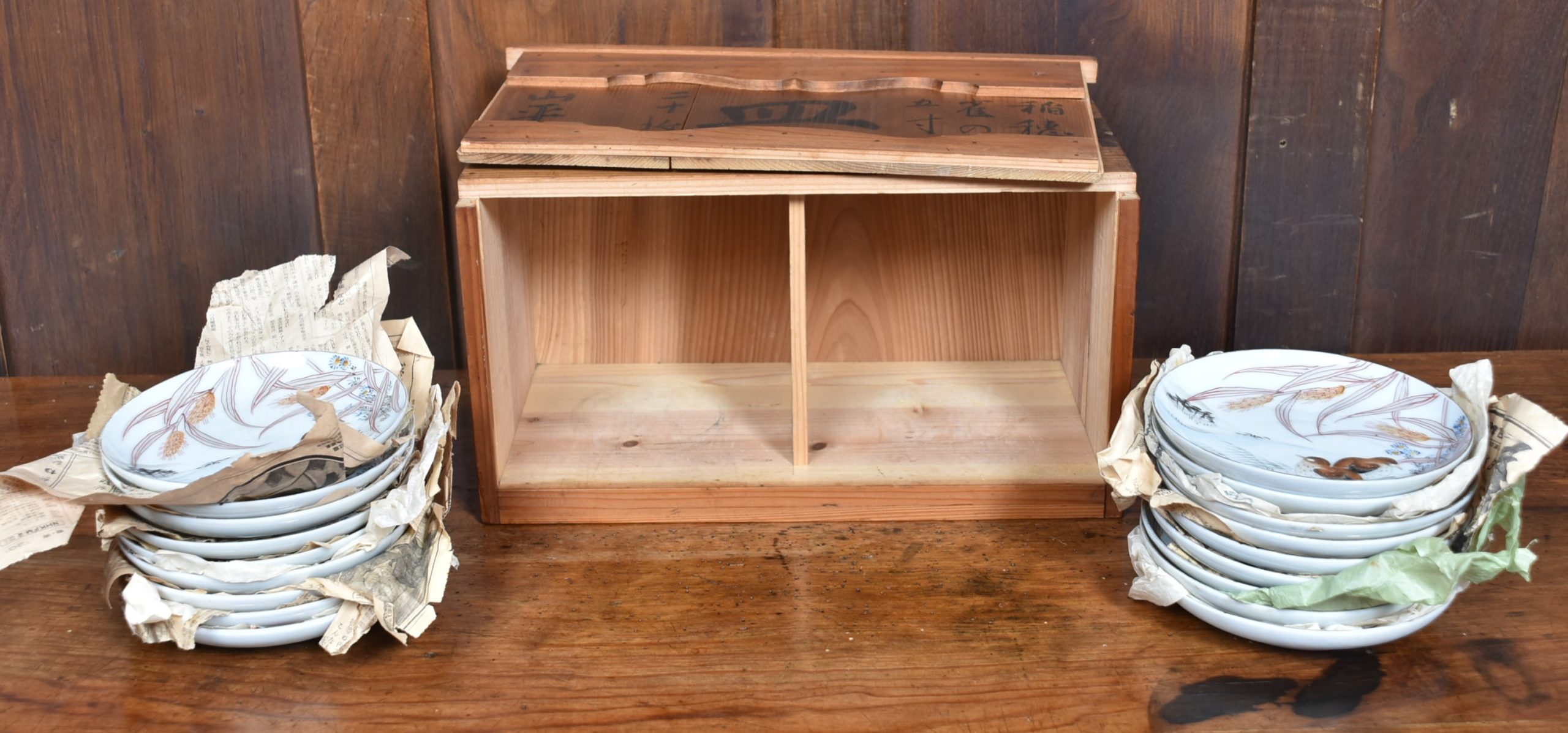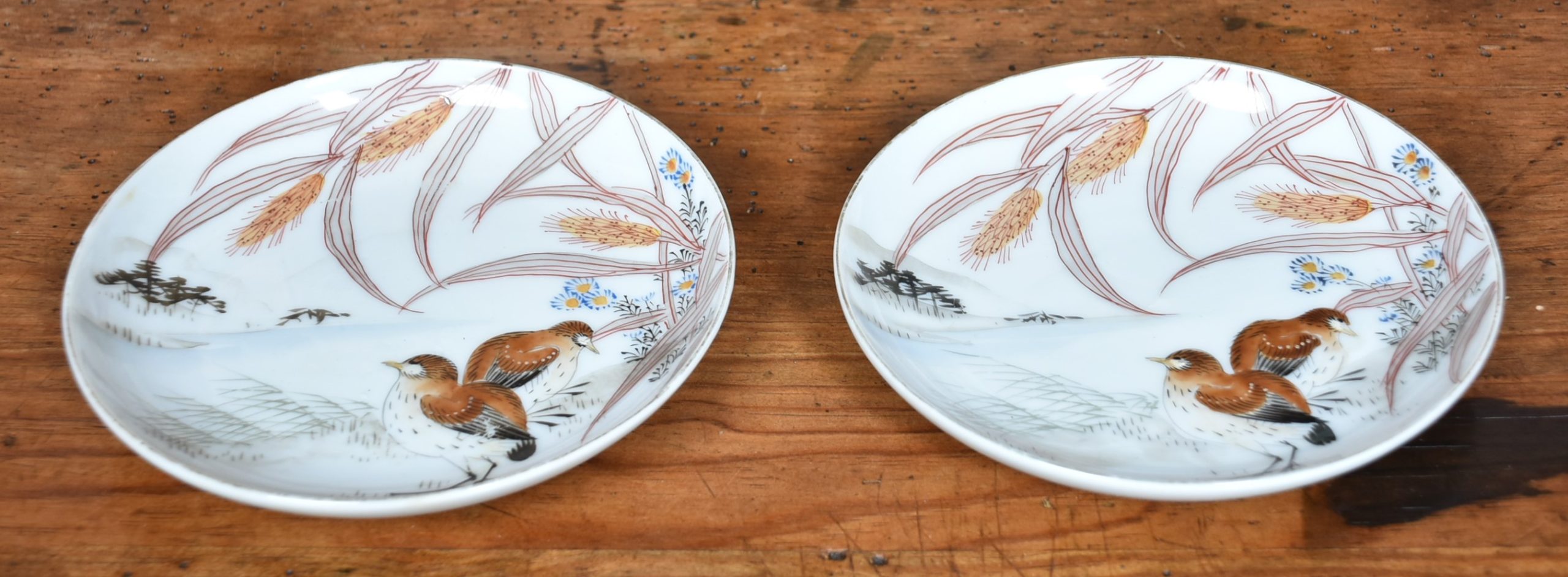 A beautifully presented set of eighteen Japanese porcelain plates, each measuring 15cm in diameter and housed in their original compartmentalised wooden storage box. The plates are delicately hand-painted with serene scenes of birds among grasses and wheat stalks, rendered in soft earthy tones with fine brushwork and subtle shading. The imagery evokes a quiet harmony with nature, typical of traditional Japanese aesthetics. The box itself bears calligraphic inscriptions and is divided into two protective compartments, with each plate carefully wrapped for preservation. A rare and complete ensemble that combines artistry, functionality, and cultural resonance—ideal for collectors or those seeking refined tableware with a story.
