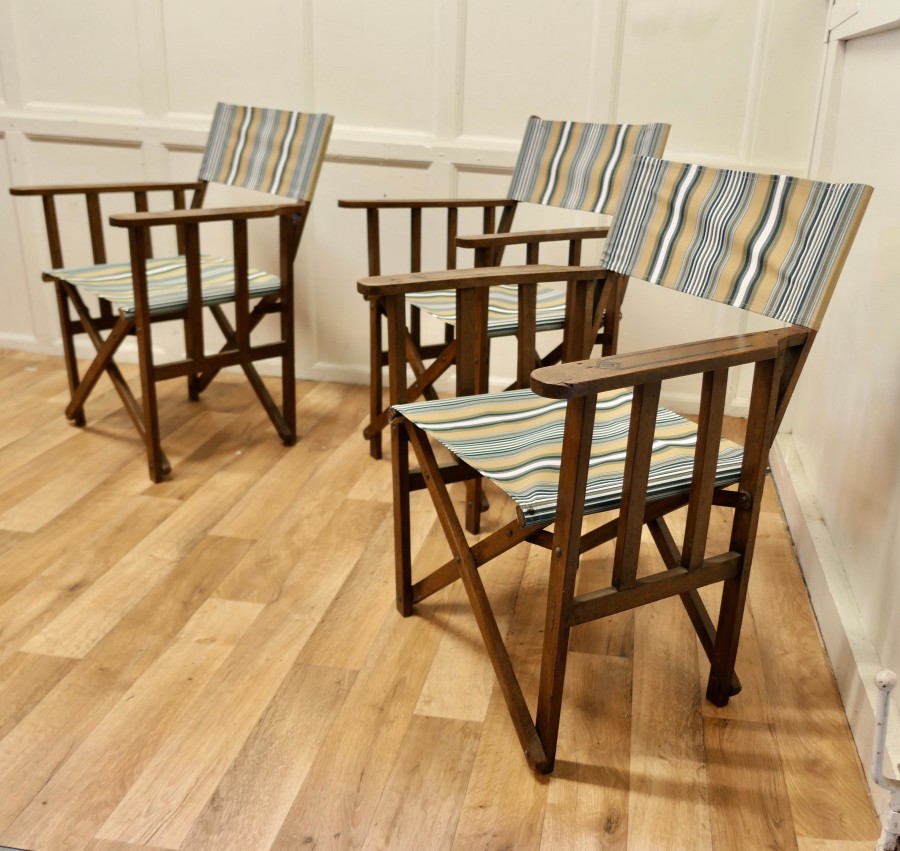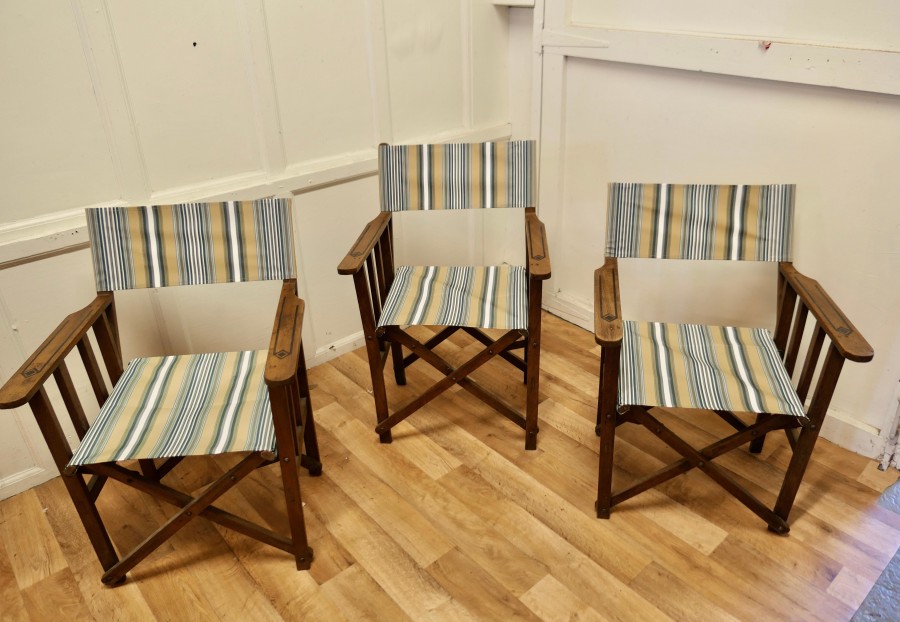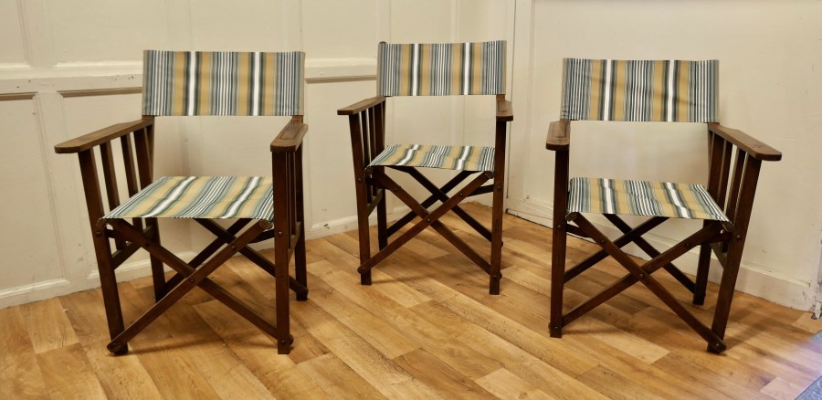 Set of 3 Edwardian Canvas Directors Chairs, Loft and Garden Style Chairs A great set of lounging chairs, these would work very well both indoor and out, the chairs are made in beech with broad arm rests, and new heavy canvas upholstery The chairs are in good sound condition, great for easy storage as they fold flat and are easy to carry The Chairs are 33” high, 24” wide and 21” deep WD194 Manufacture Date : 1900 Materials : Beech