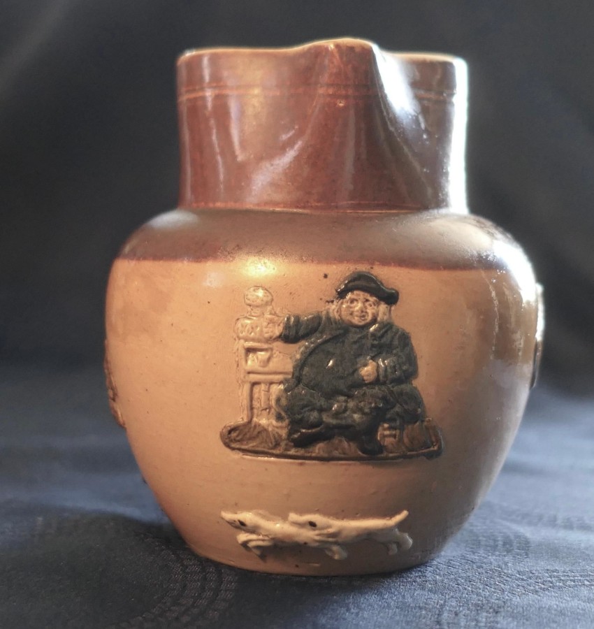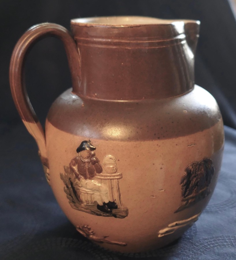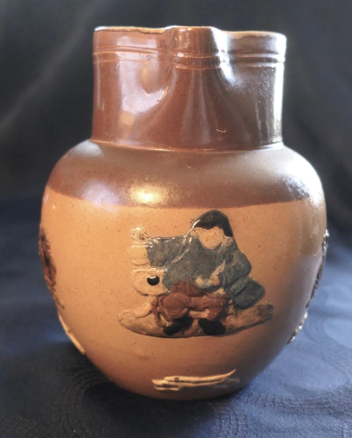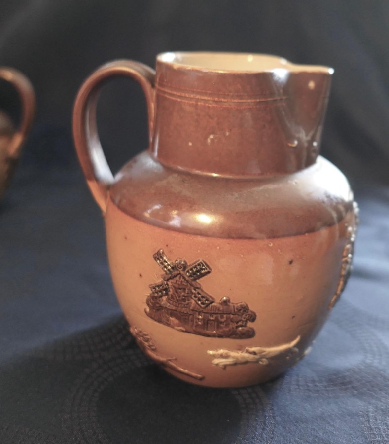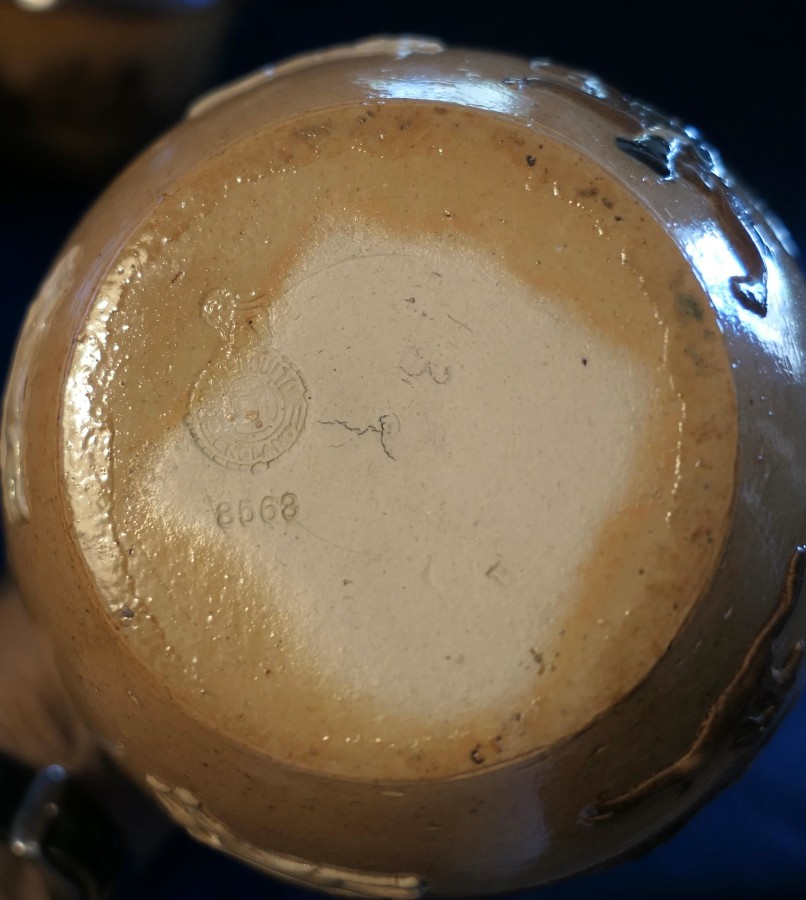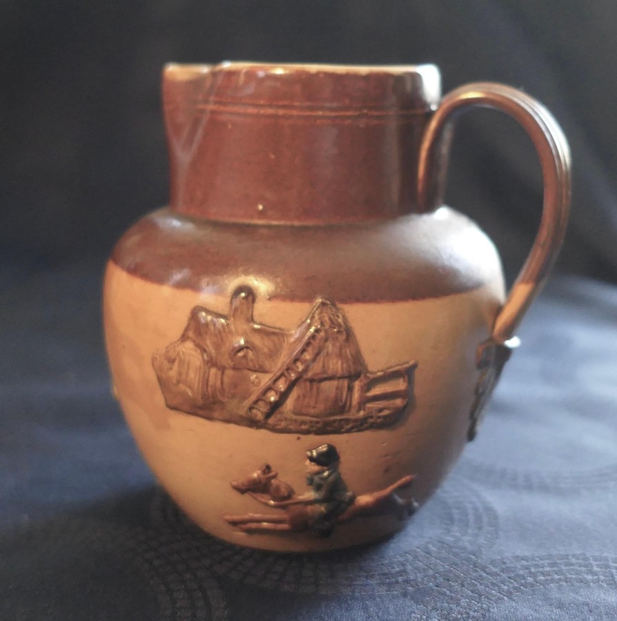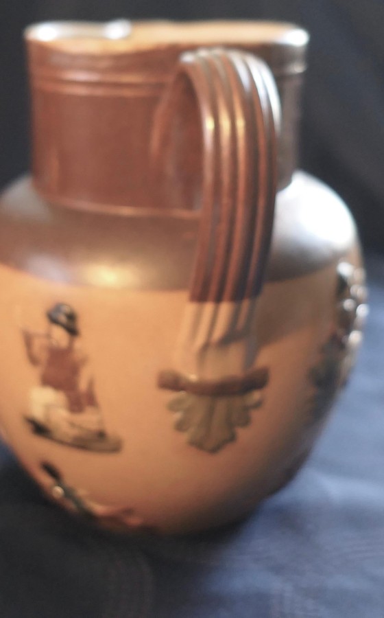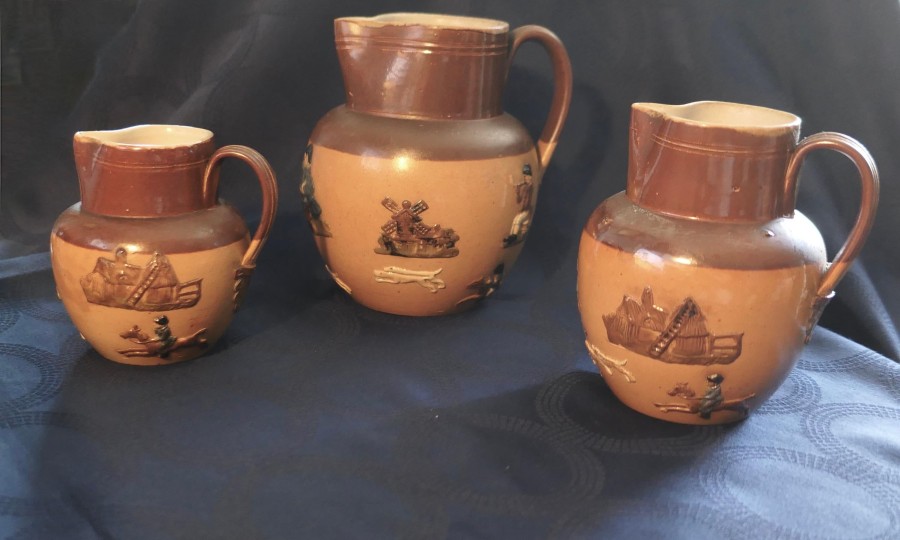 Set of 3 Rare Coloured Royal Doulton Stoneware Harvest Jugs The set has the Royal Doulton Lambeth stamp, the product number 8568 on each jug The jugs are a two tone brown background with hunting scenes and hand detailed coloured decoration to the figures and objects The jugs have a reeded handle with a decorative leaf design at the base, all the jugs are in good used condition with no noticeable faults The tallest Jug is 5.5” in diameter, it is 7” tall, the medium jug is 6” tall and the smallest is 5” tall SW176 Manufacture Date : 1910 Materials : Stoneware
