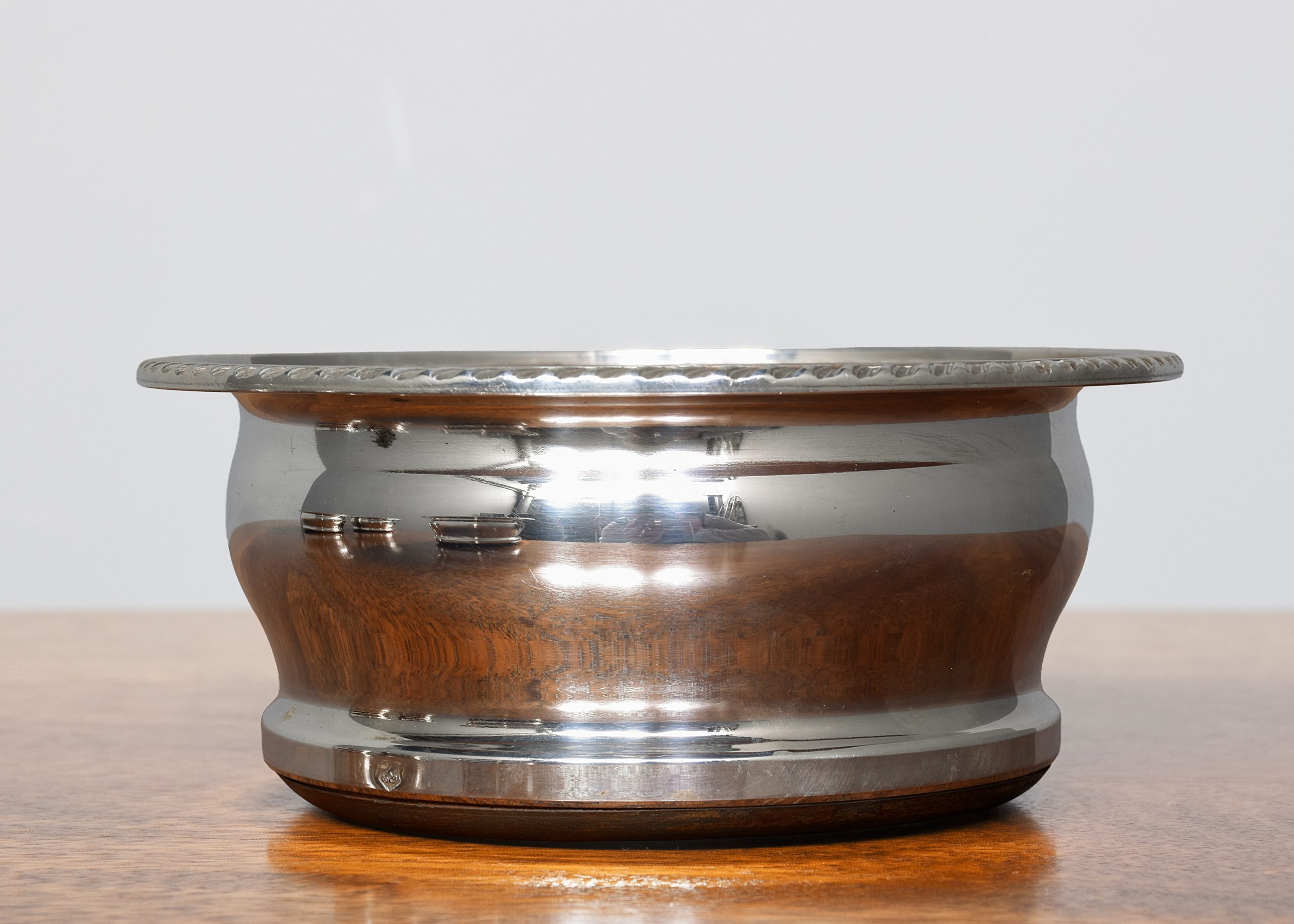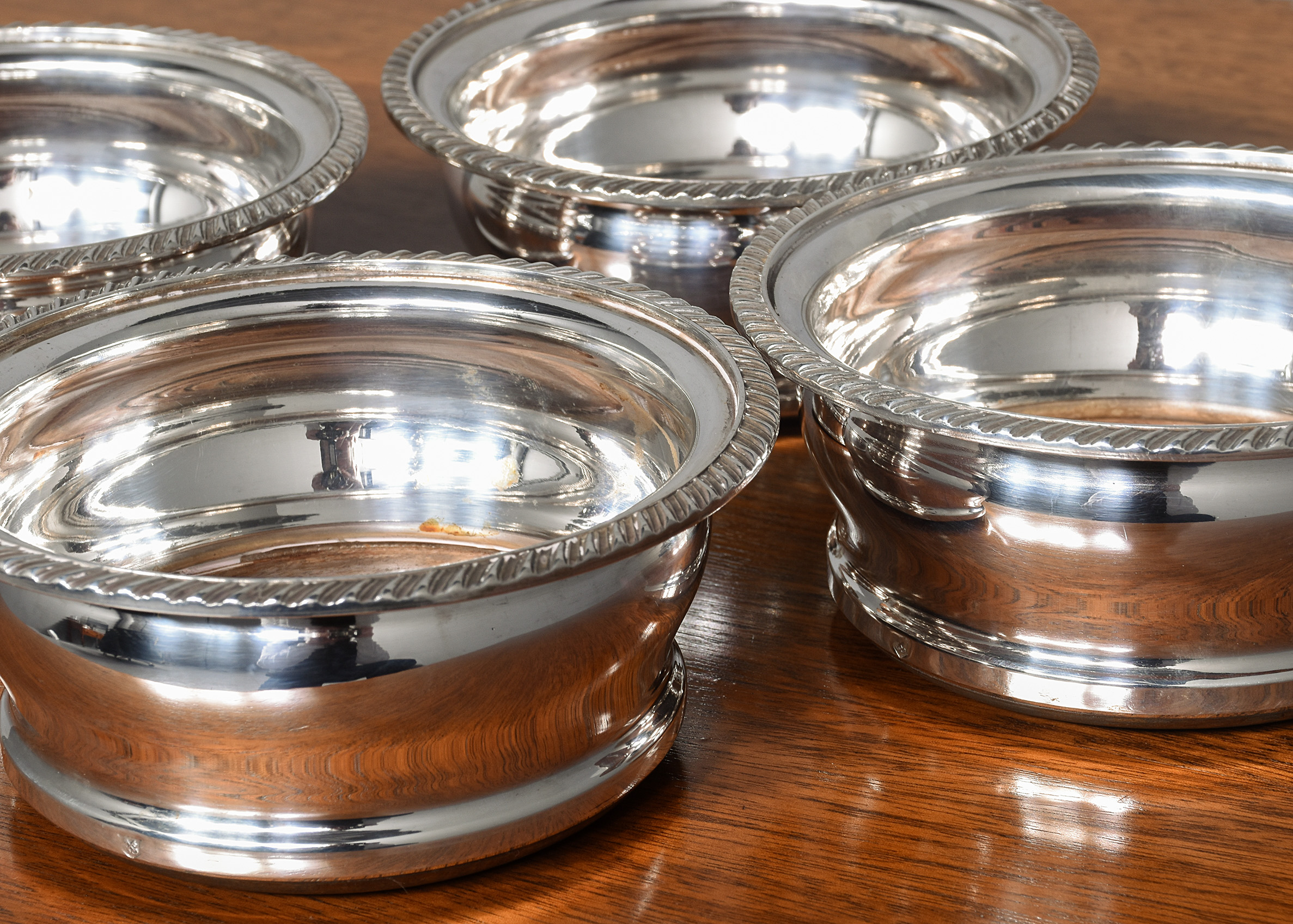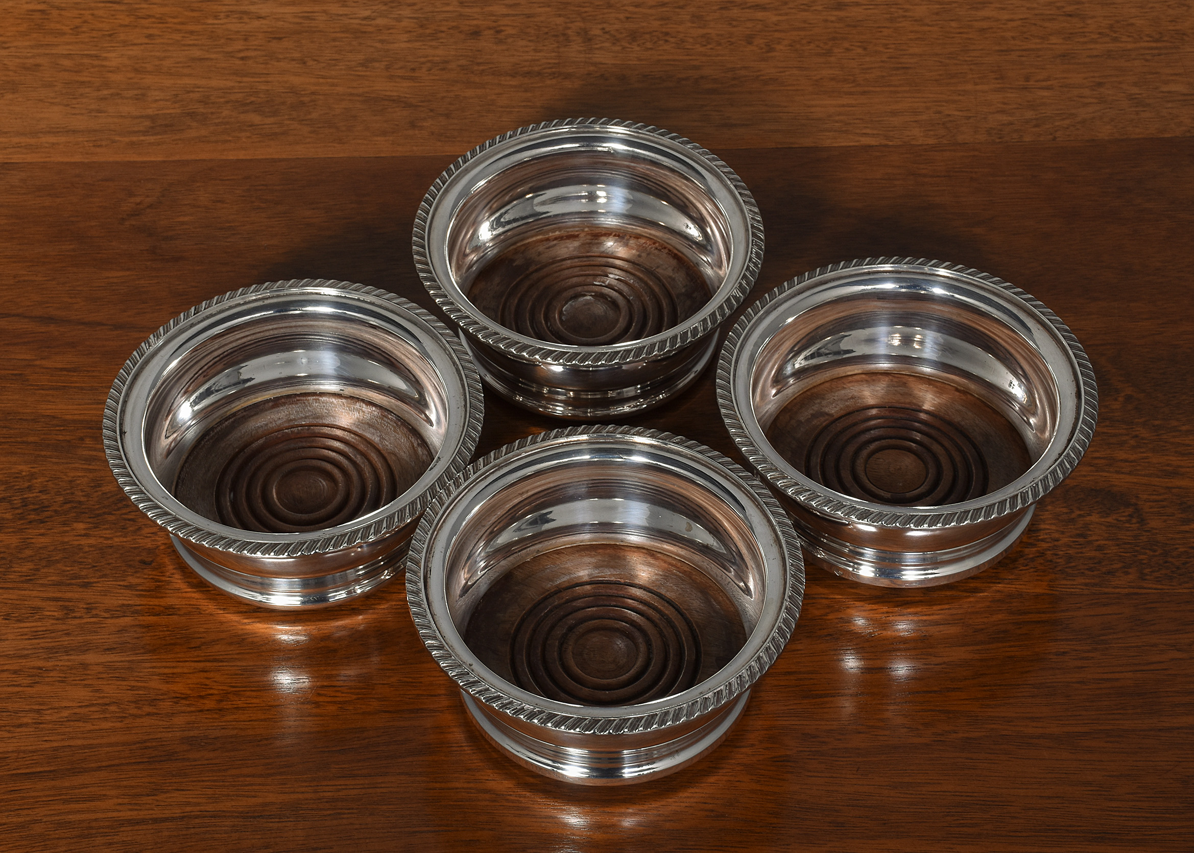 Circa 1900. Quality set of four large EPNS mahogany wine coasters, the circular coasters with a dragooned top edge and with curvaceous body, the insert mahogany base with concentric patterns on the inside and baize lined on the outside, all four coasters are in excellent condition with no blushing or damage.