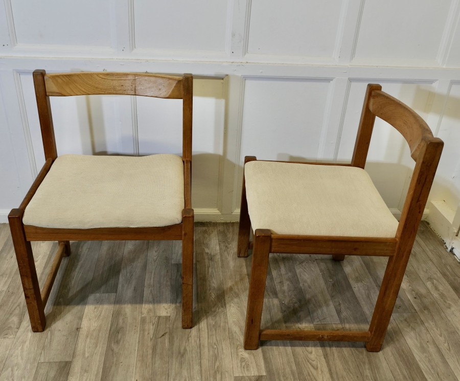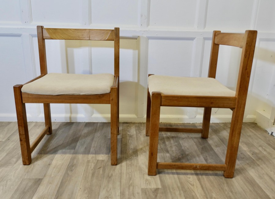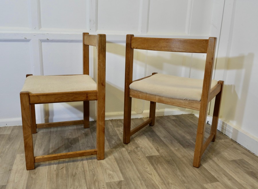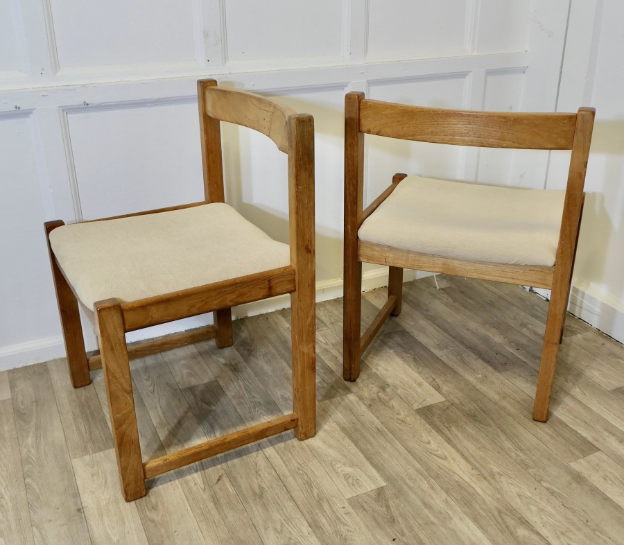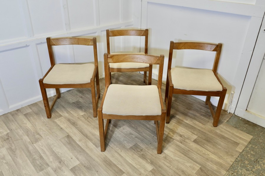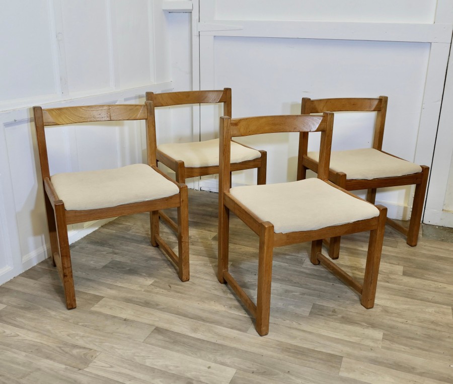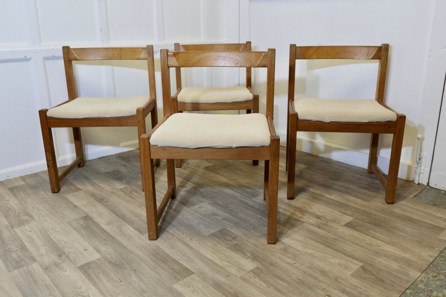 Set of 4 Mid Century Danish Cube Dining Chairs These are a large size, very roomy and comfortable Heavy Golden Elm Dining Chairs, good modernist design and very good quality The chairs have loose covers, these are clean and would be very easy to replace with your own choice of fabric The seat height of the chairs is 17.5”, the chairs are 21” wide, 18” back to front and 30” high ay the back TNG217 Manufacture Date : 1970 Materials : Elm
