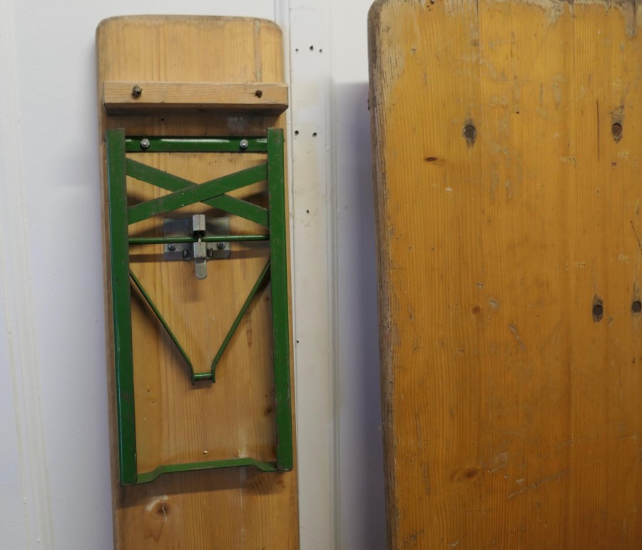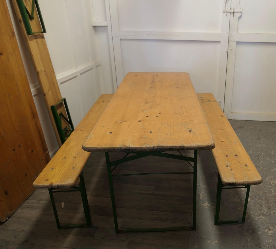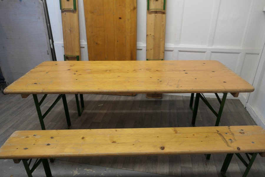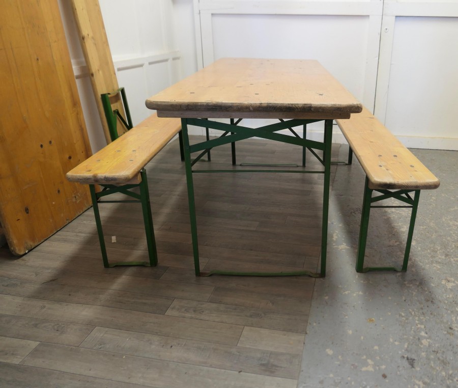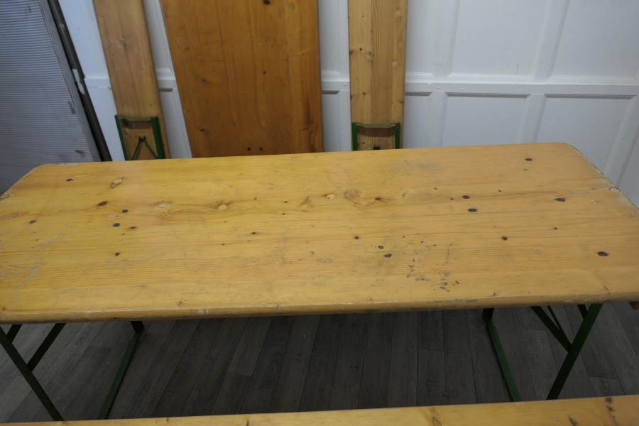 Set of 6ft pine picnic table and benches. We have 2 of these available if required This is a 6ft Long Picnic Table, the table top is made with 1” thick pine planks as are the 2 benches, they all have sturdy iron legs, painted in green tucked underneath and are easy to open out All in good sturdy condition, with signs of use, 2 sets are available and they all store away in little amount of space The tables are 71” long, 27” wide and it is 30” high The Benches are 19” high, 71” long and 10” wide TJK282. Manufacture Date : 1960 Materials : Pine