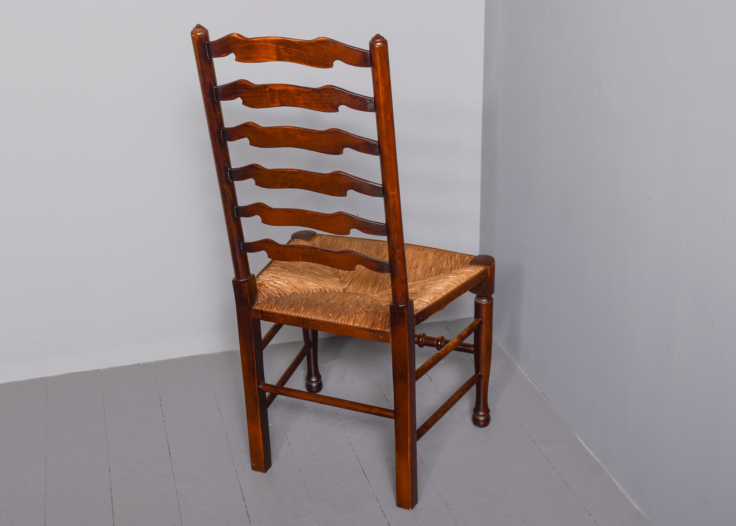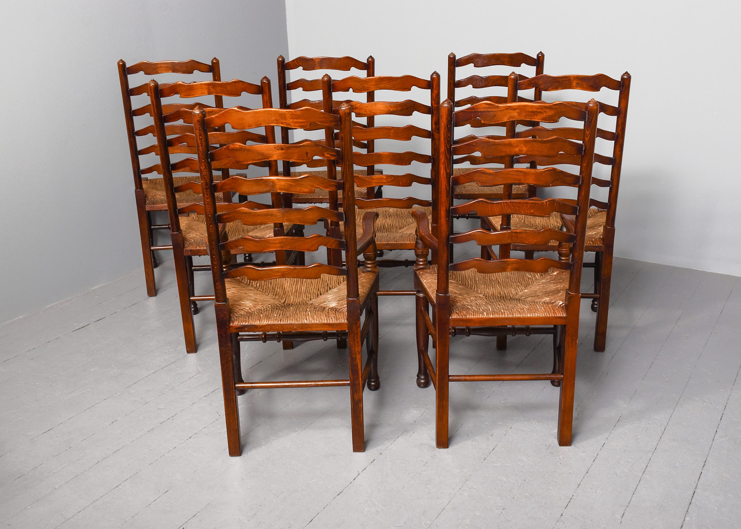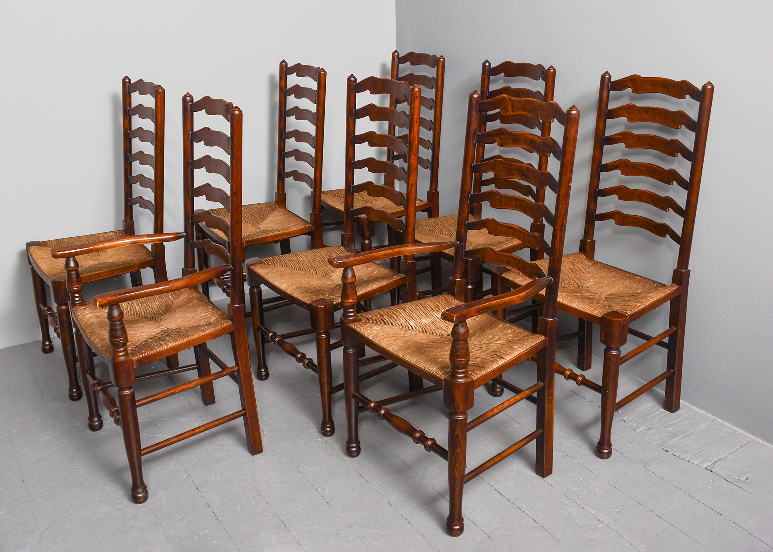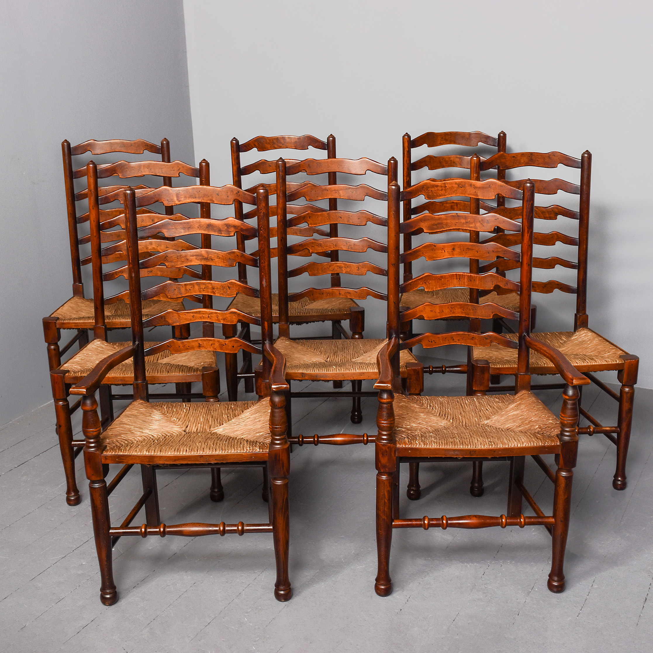 Circa 1970s. A quality set of 8 oak ladder back chairs, consisting of 6 side chairs and a pair of armchairs, each with a classic shaped rails forming the ladder back, supported on turned uprights with a simple finial, the shaped arms supported on bulbous balustrades, each with a handmade woven rush seat, the back legs are square, front legs are turned and ring turned, finishing on a bulbous foot, all are braced by multiple turned stretchers.