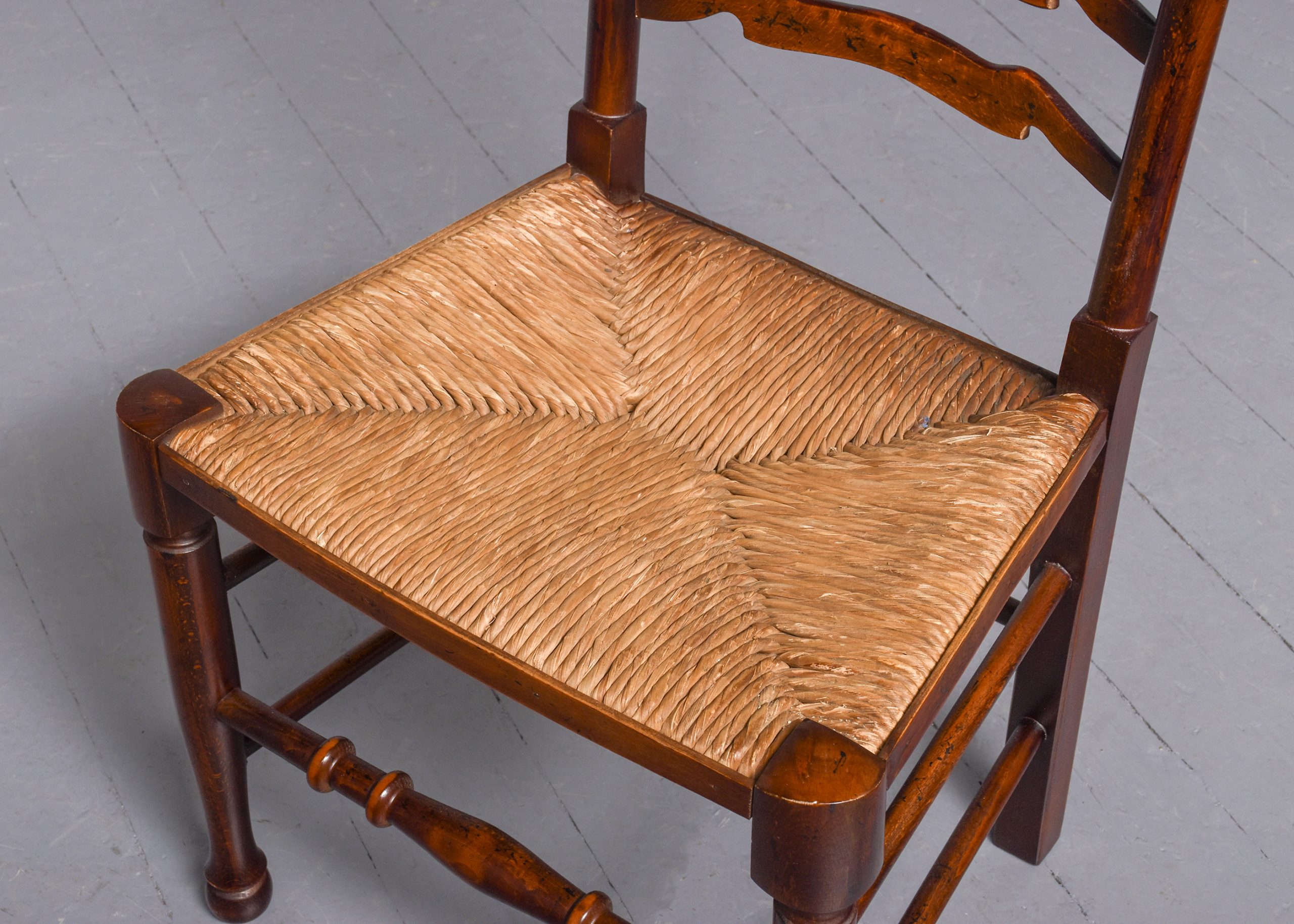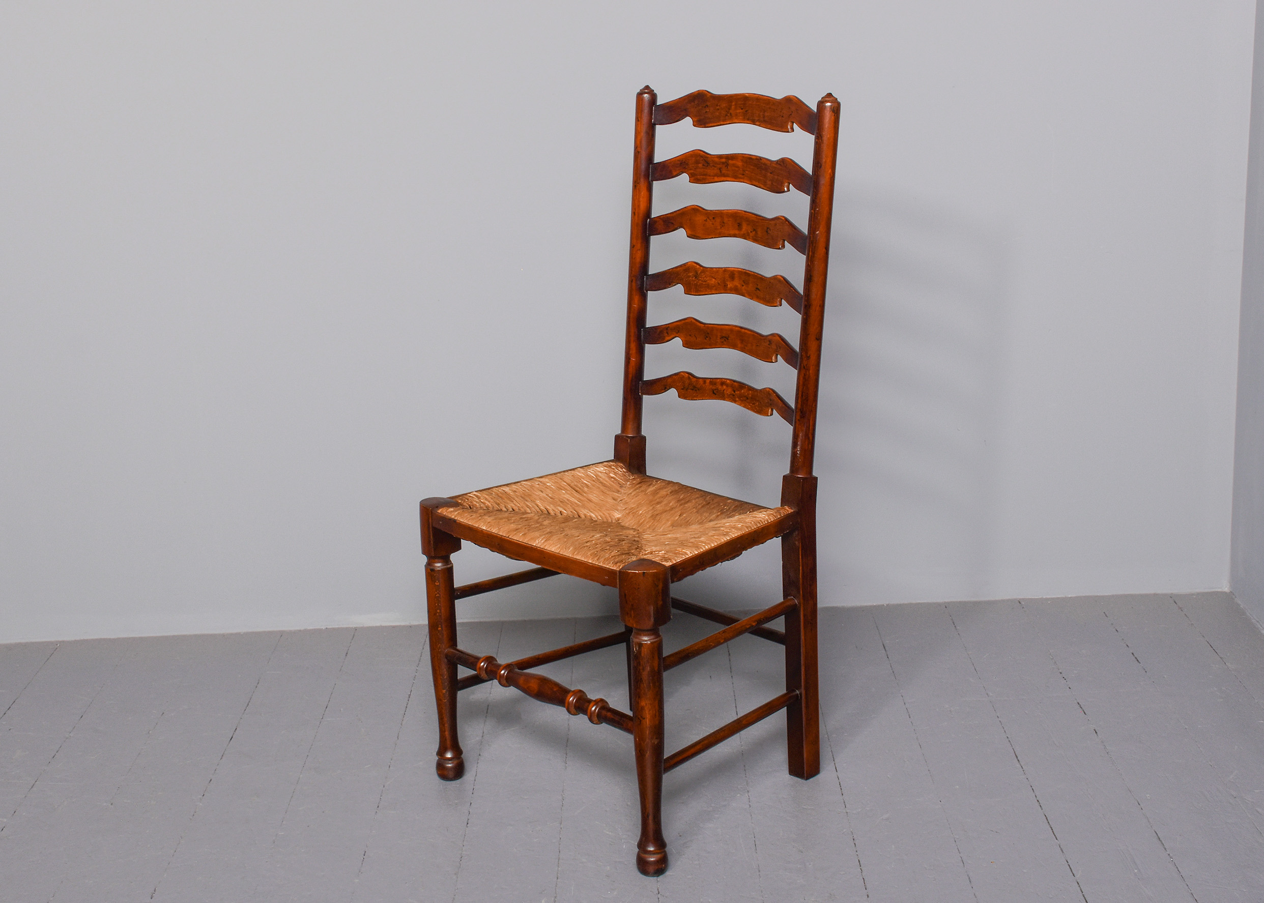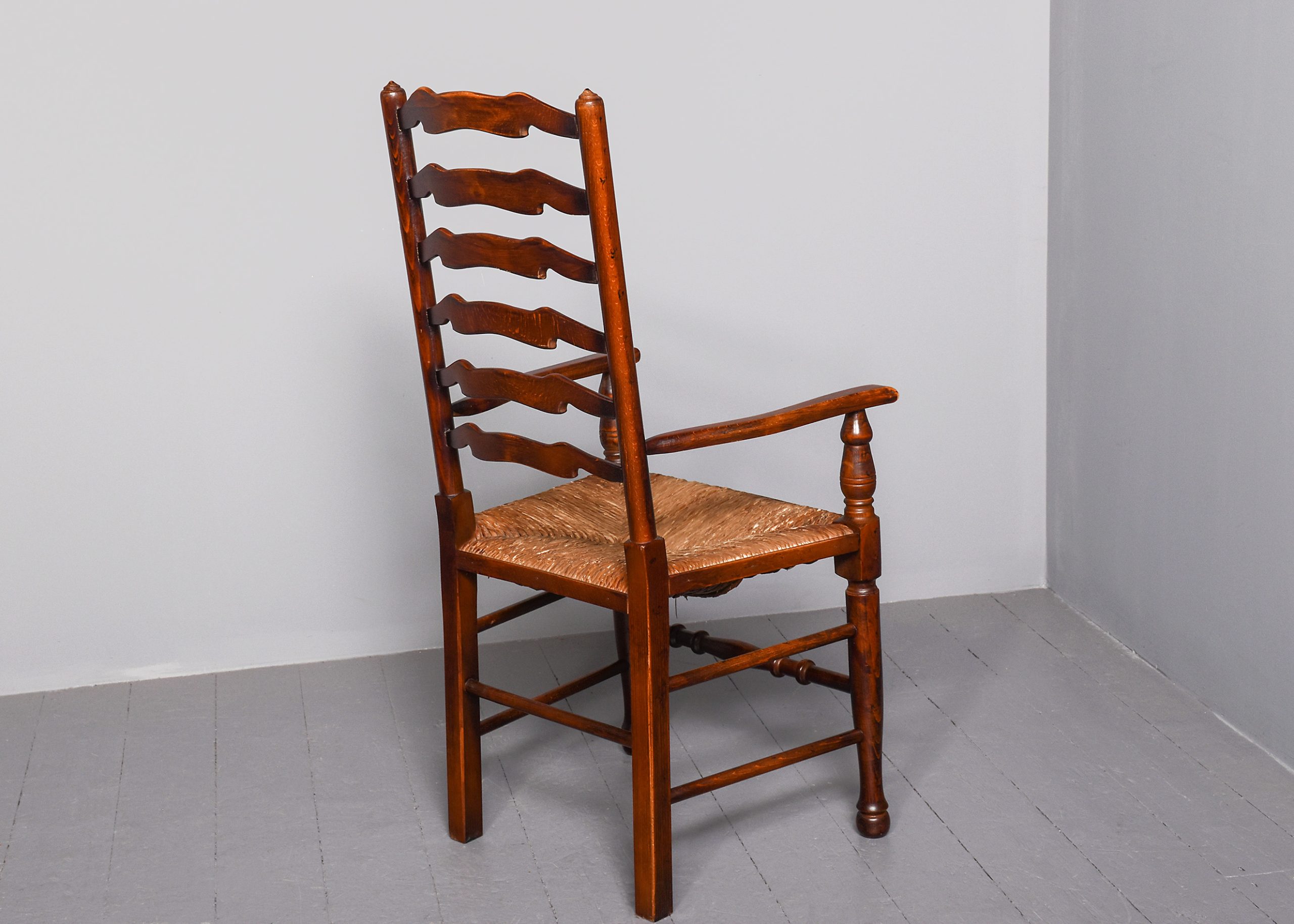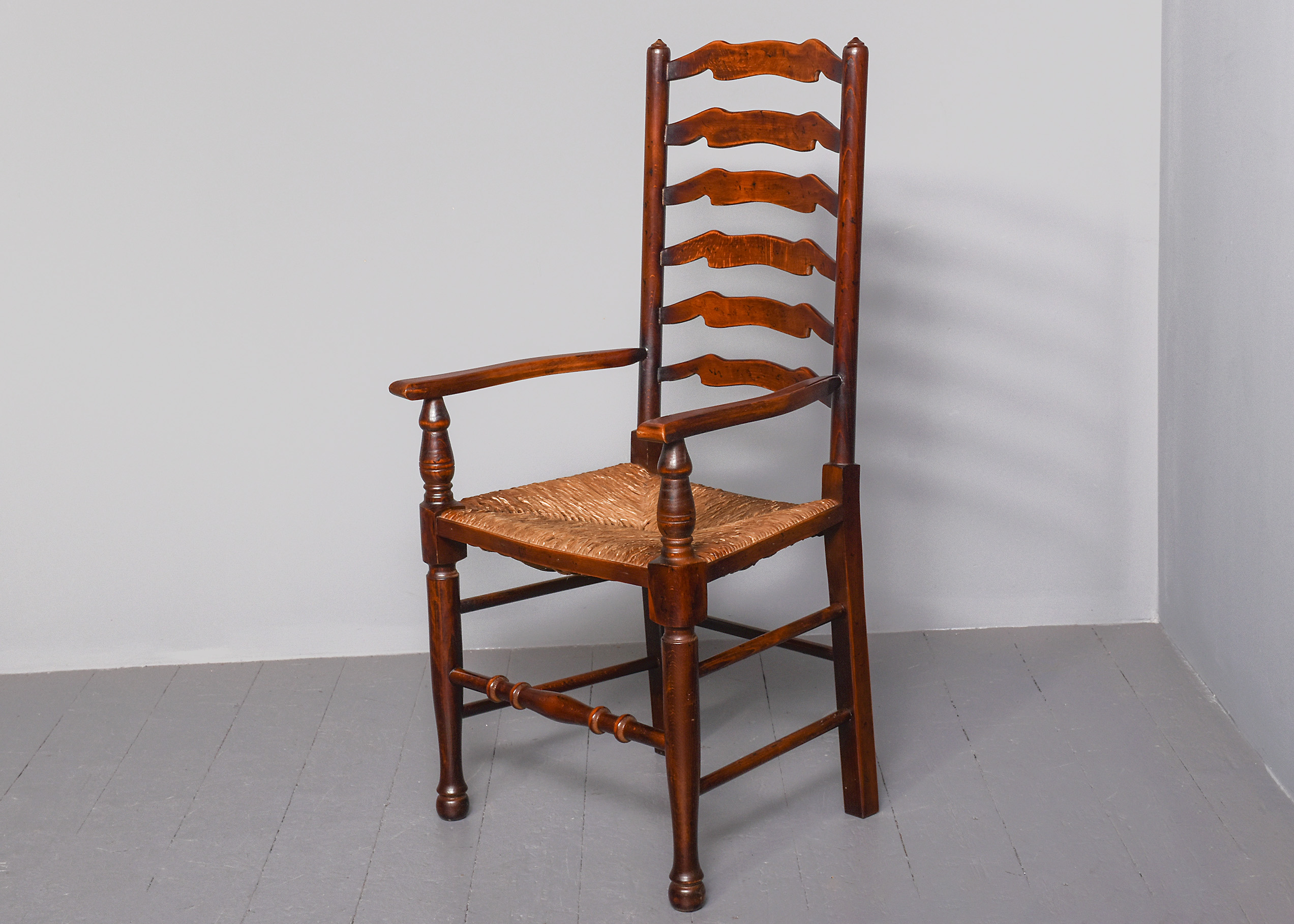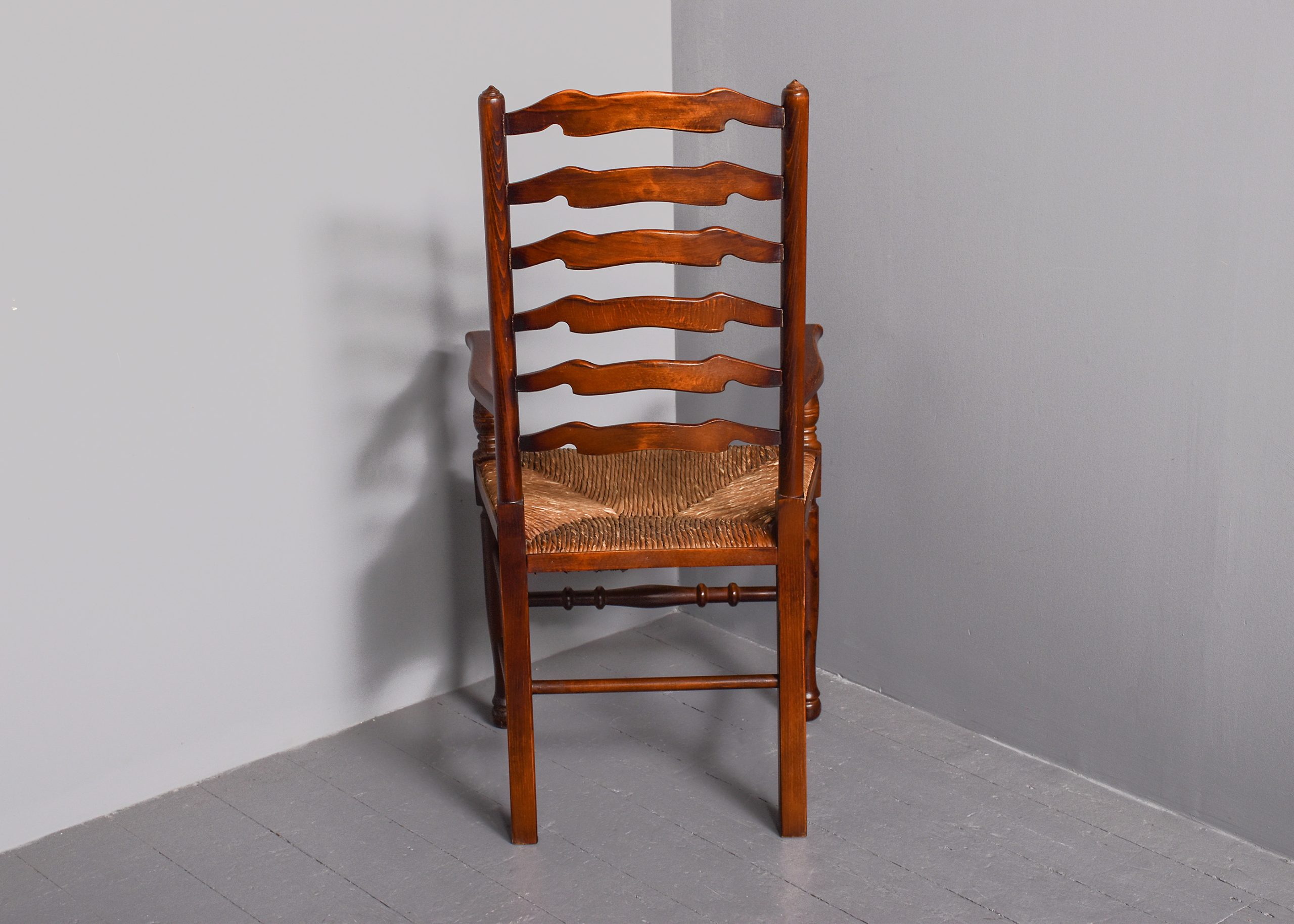 Circa 1970s. A quality set of 8 oak ladder back chairs, consisting of 6 side chairs and a pair of armchairs, each with a classic shaped rails forming the ladder back, supported on turned uprights with a simple finial, the shaped arms supported on bulbous balustrades, each with a handmade woven rush seat, the back legs are square, front legs are turned and ring turned, finishing on a bulbous foot, all are braced by multiple turned stretchers.