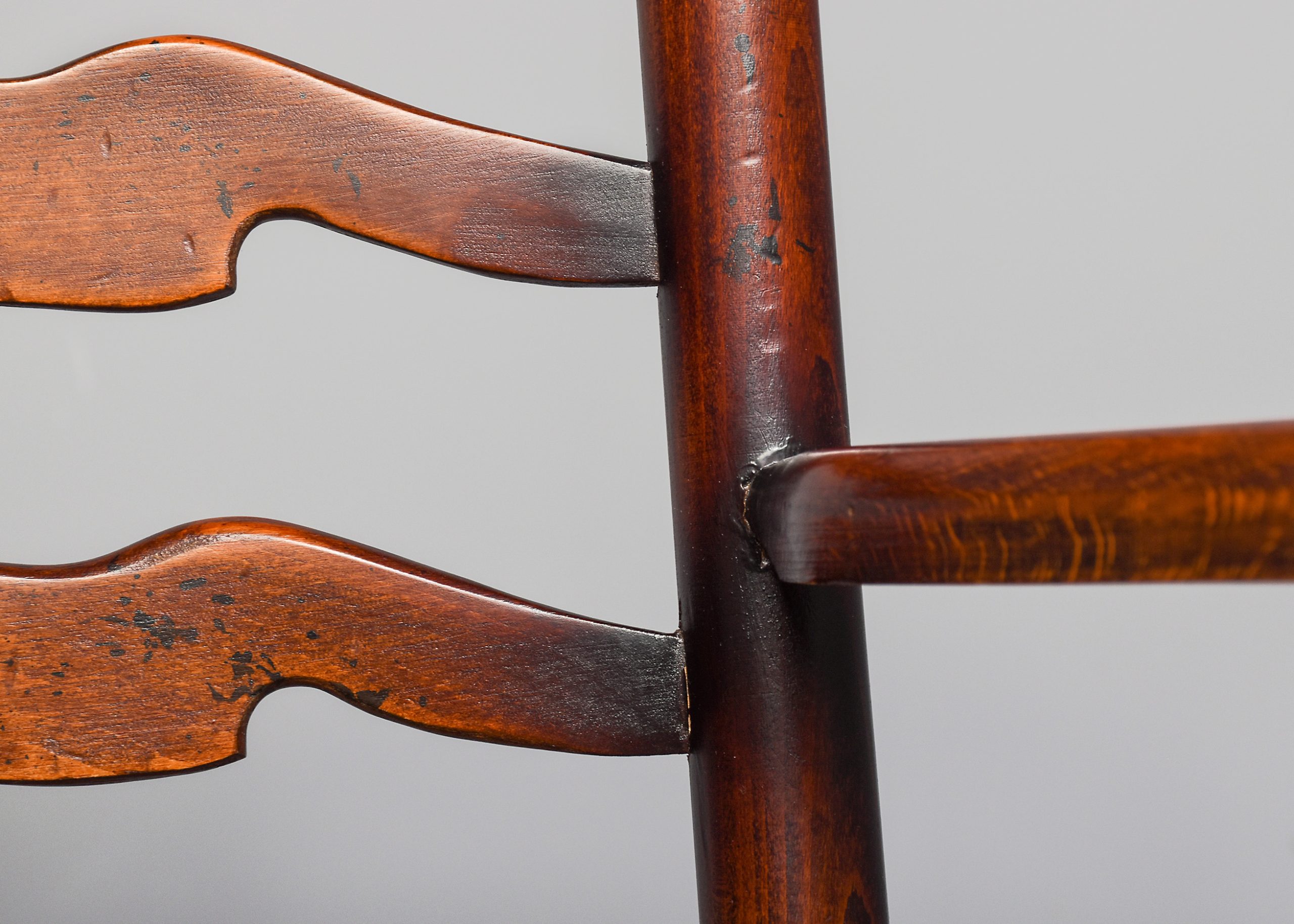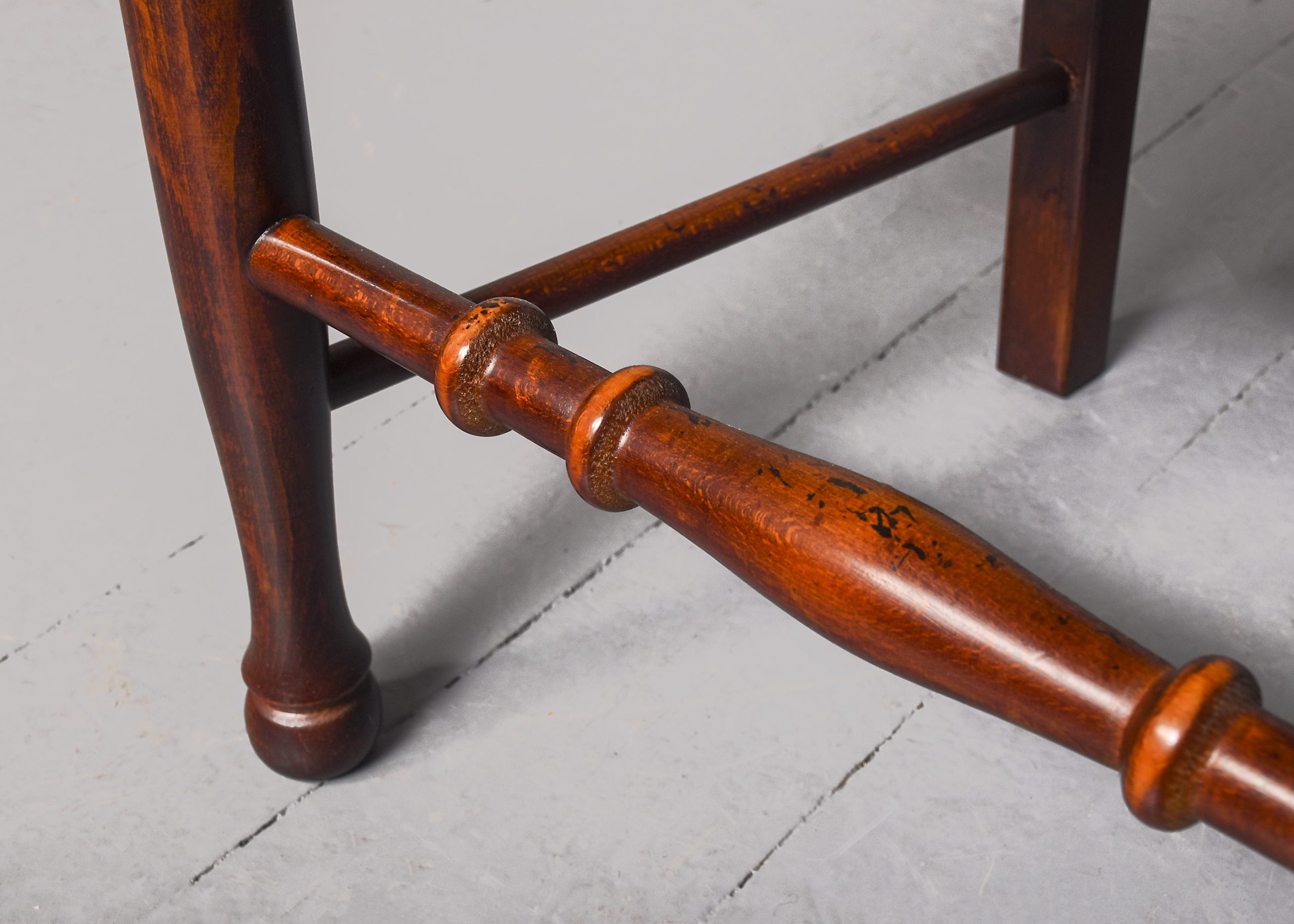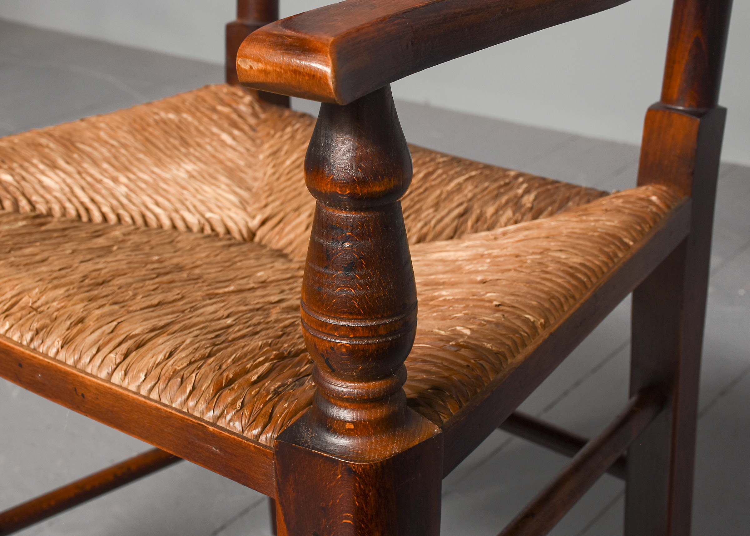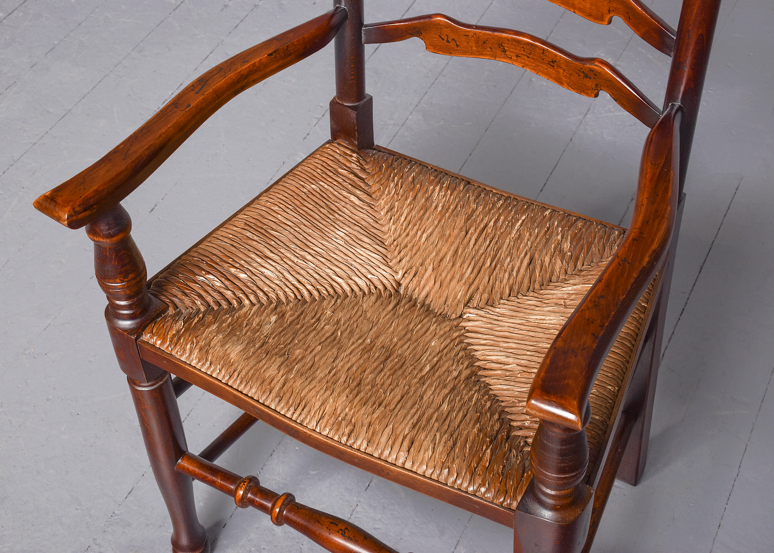 Circa 1970s. A quality set of 8 oak ladder back chairs, consisting of 6 side chairs and a pair of armchairs, each with a classic shaped rails forming the ladder back, supported on turned uprights with a simple finial, the shaped arms supported on bulbous balustrades, each with a handmade woven rush seat, the back legs are square, front legs are turned and ring turned, finishing on a bulbous foot, all are braced by multiple turned stretchers.