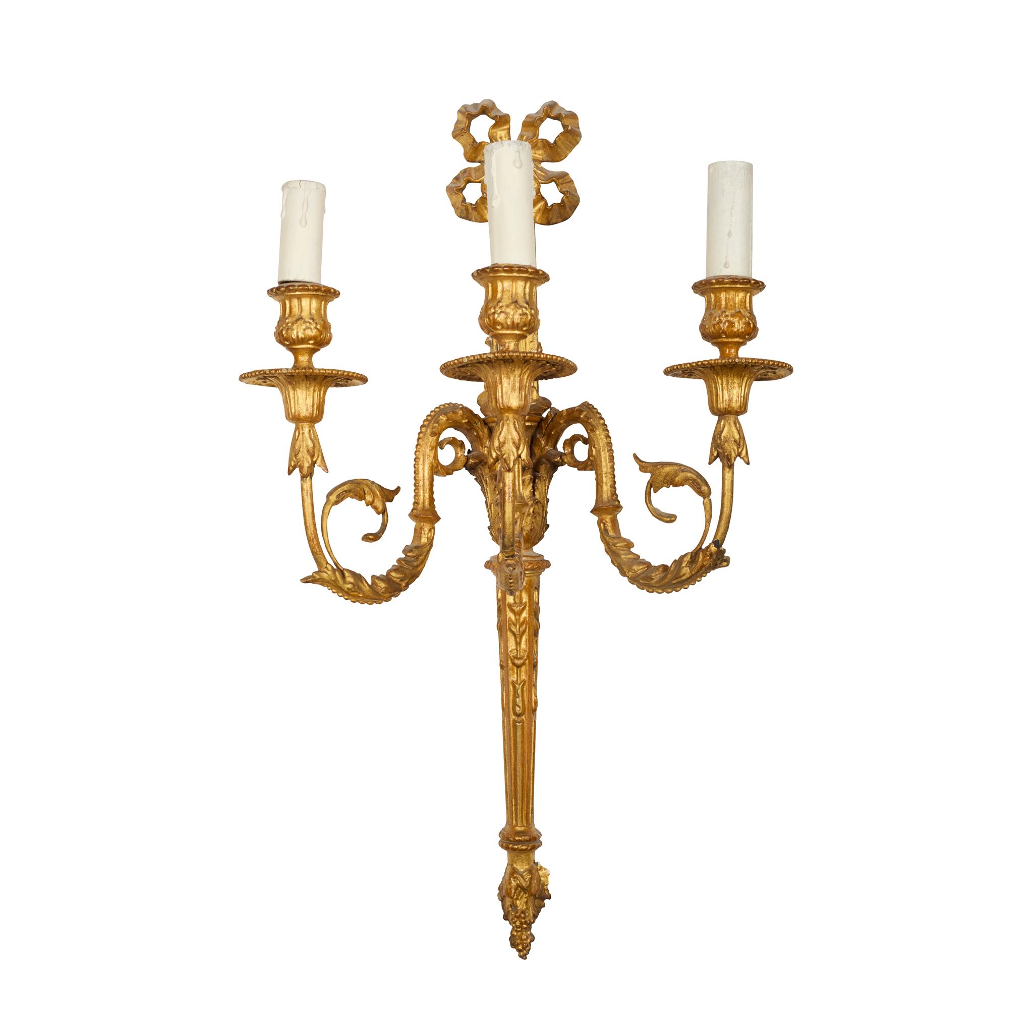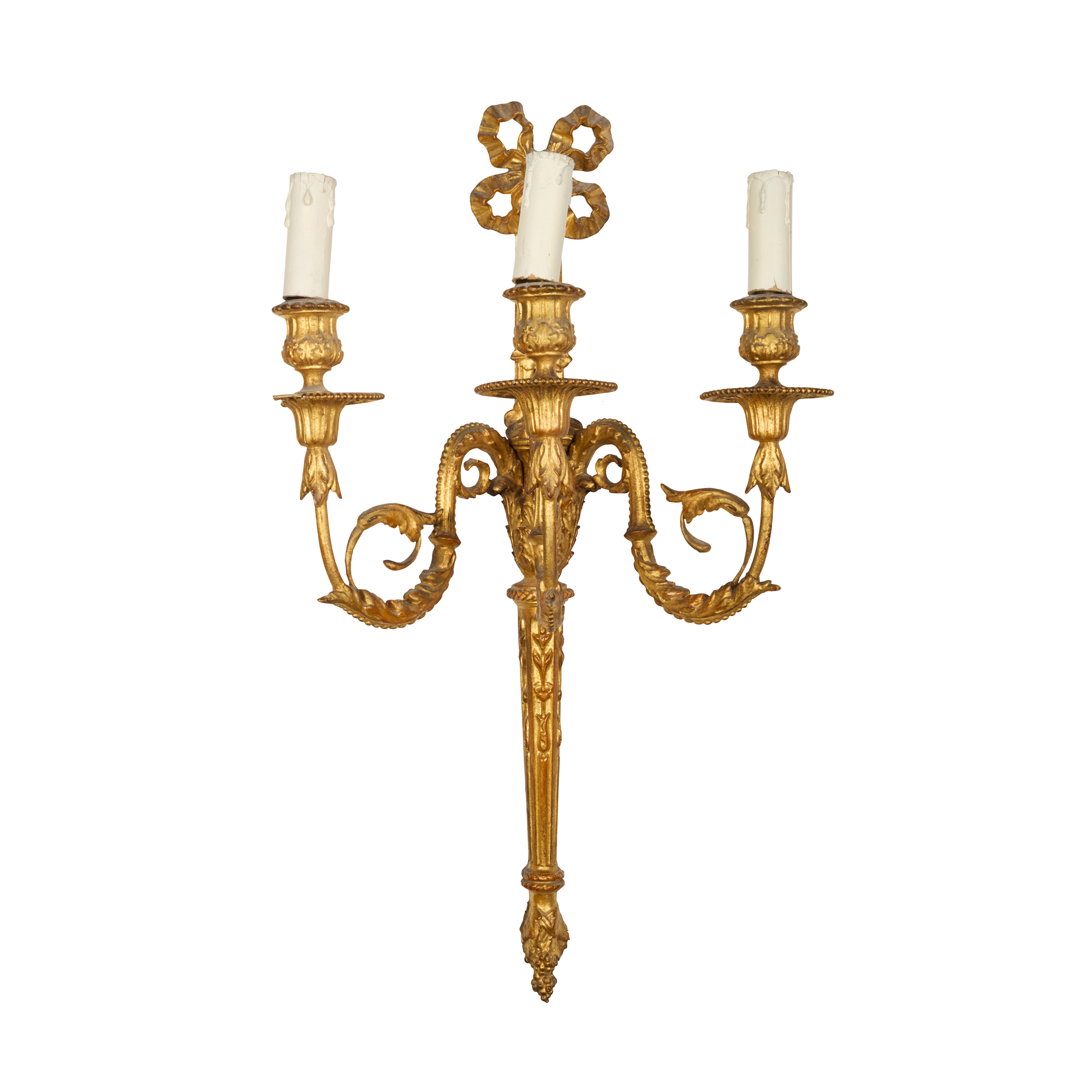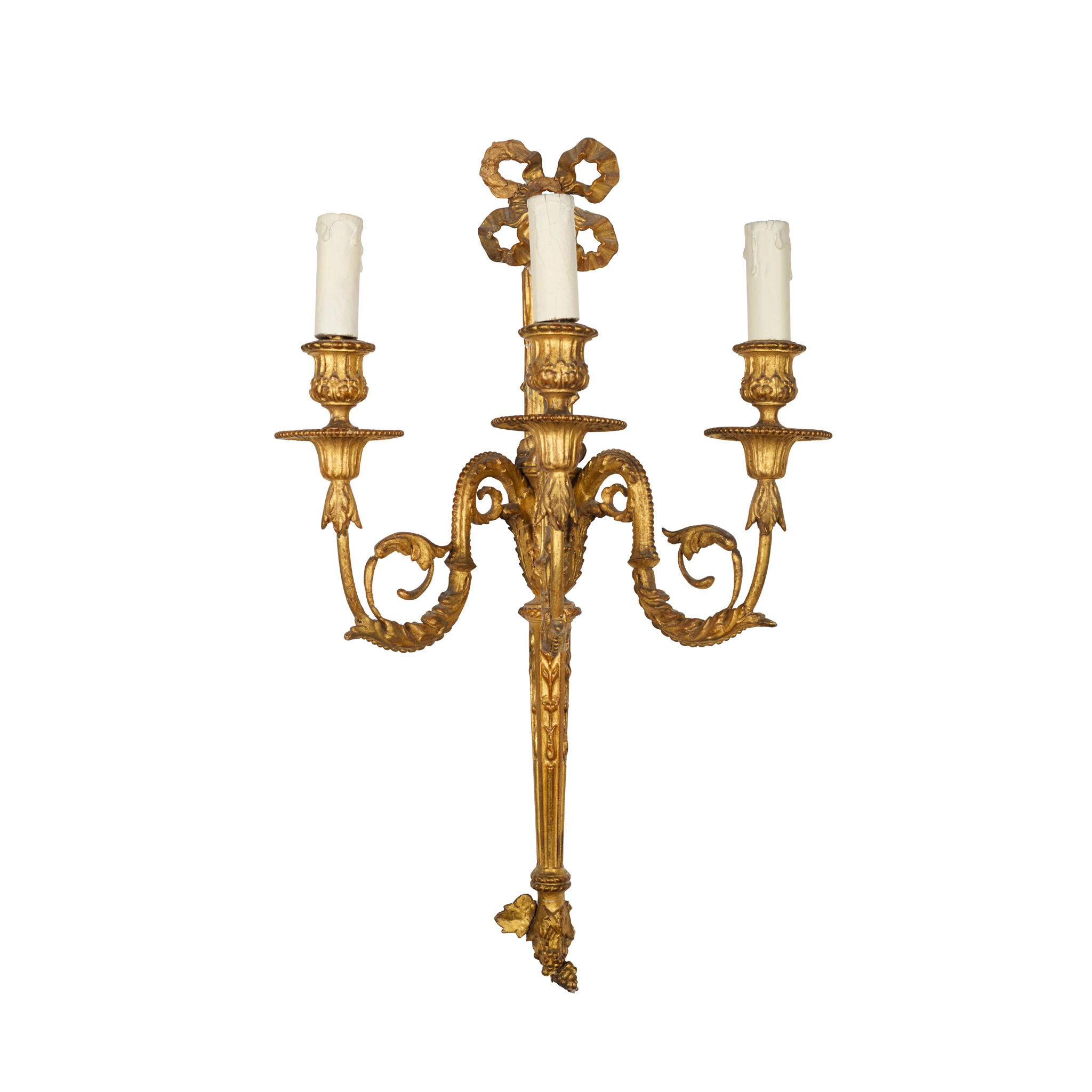 Circa 1900. A set of 4 very stylish carved, gilded wood and gesso Adam style wall sconces surmounted by a pierced gilded carved ribbon, the back plate with foliate carving on the top, the base section fluted with foliate carving and finishing with a downward-facing bunch of grapes, the backplate issues three shaped and gilded stylish arms with beading and foliate carving, the large circular fluted drip trays with the nozzles in the form