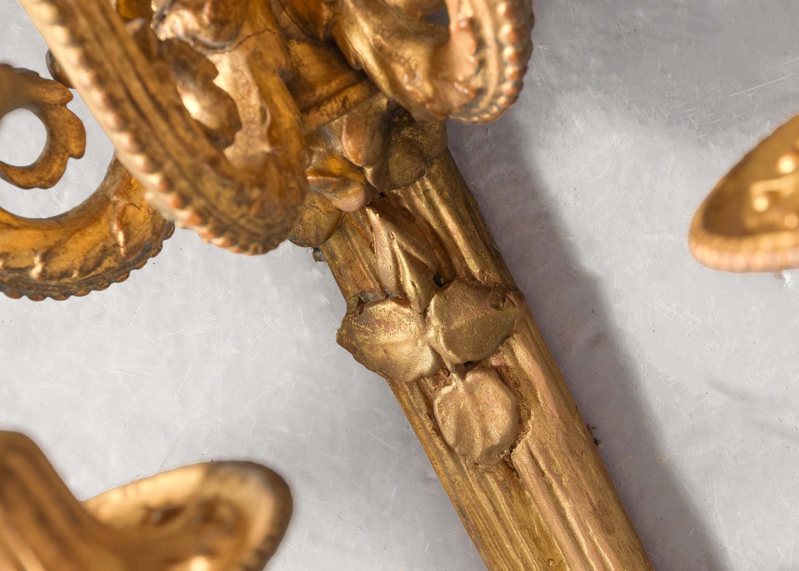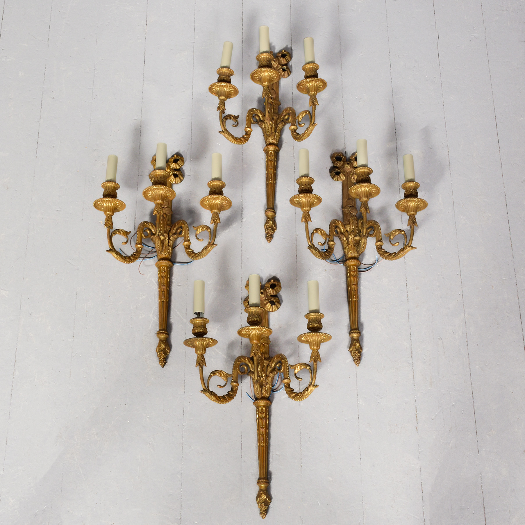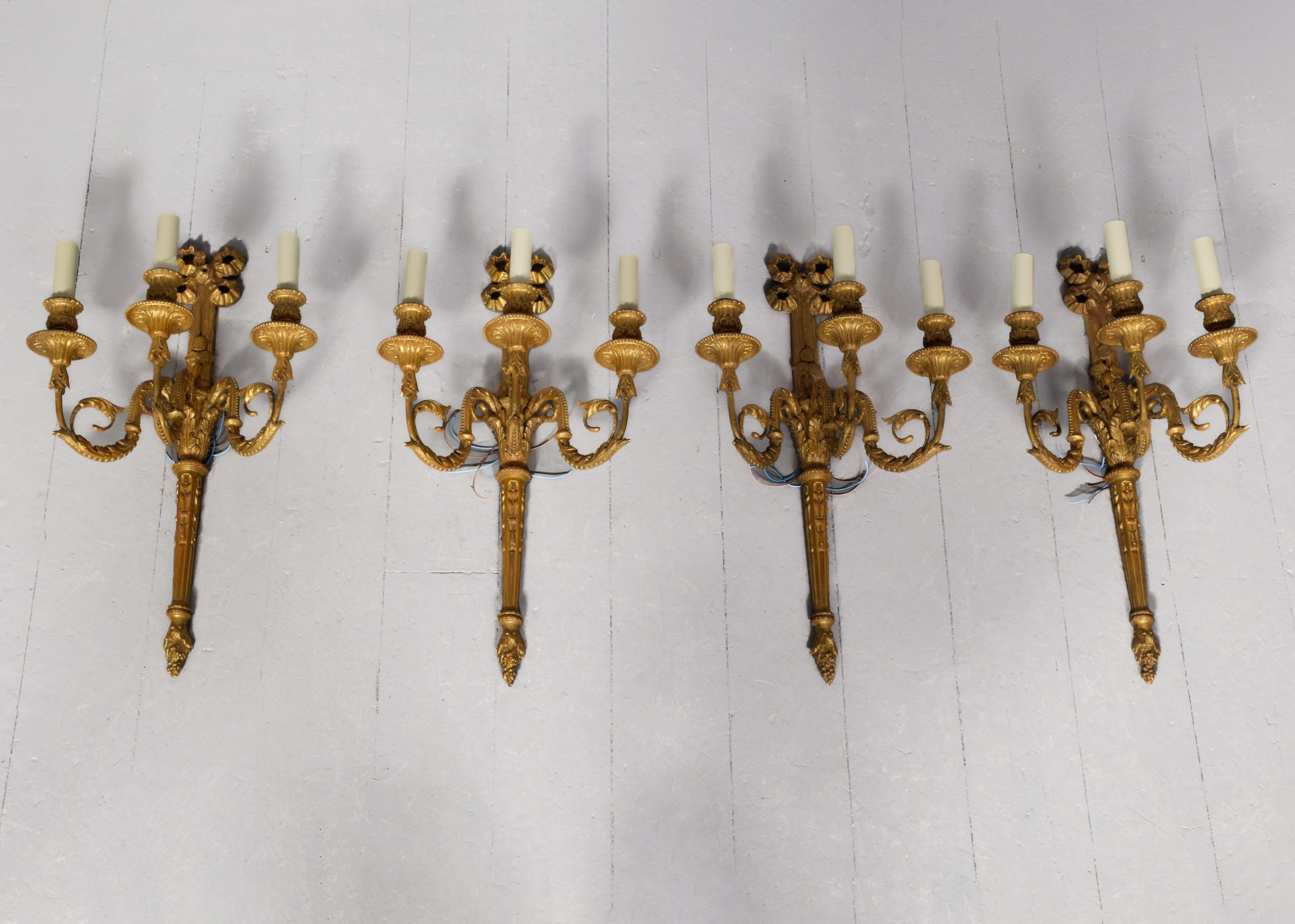 Circa 1900. A set of 4 very stylish carved, gilded wood and gesso Adam style wall sconces surmounted by a pierced gilded carved ribbon, the back plate with foliate carving on the top, the base section fluted with foliate carving and finishing with a downward-facing bunch of grapes, the backplate issues three shaped and gilded stylish arms with beading and foliate carving, the large circular fluted drip trays with the nozzles in the form