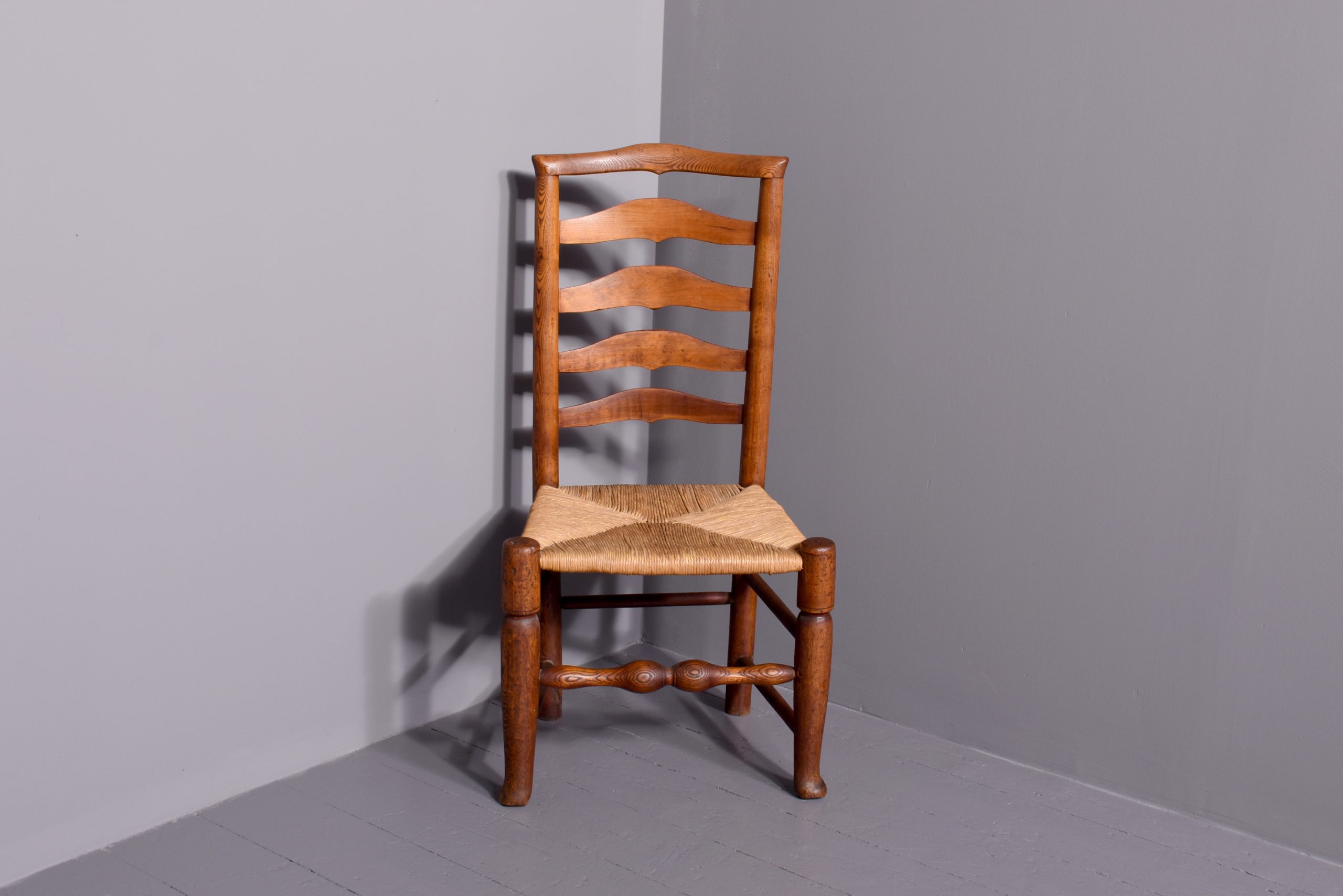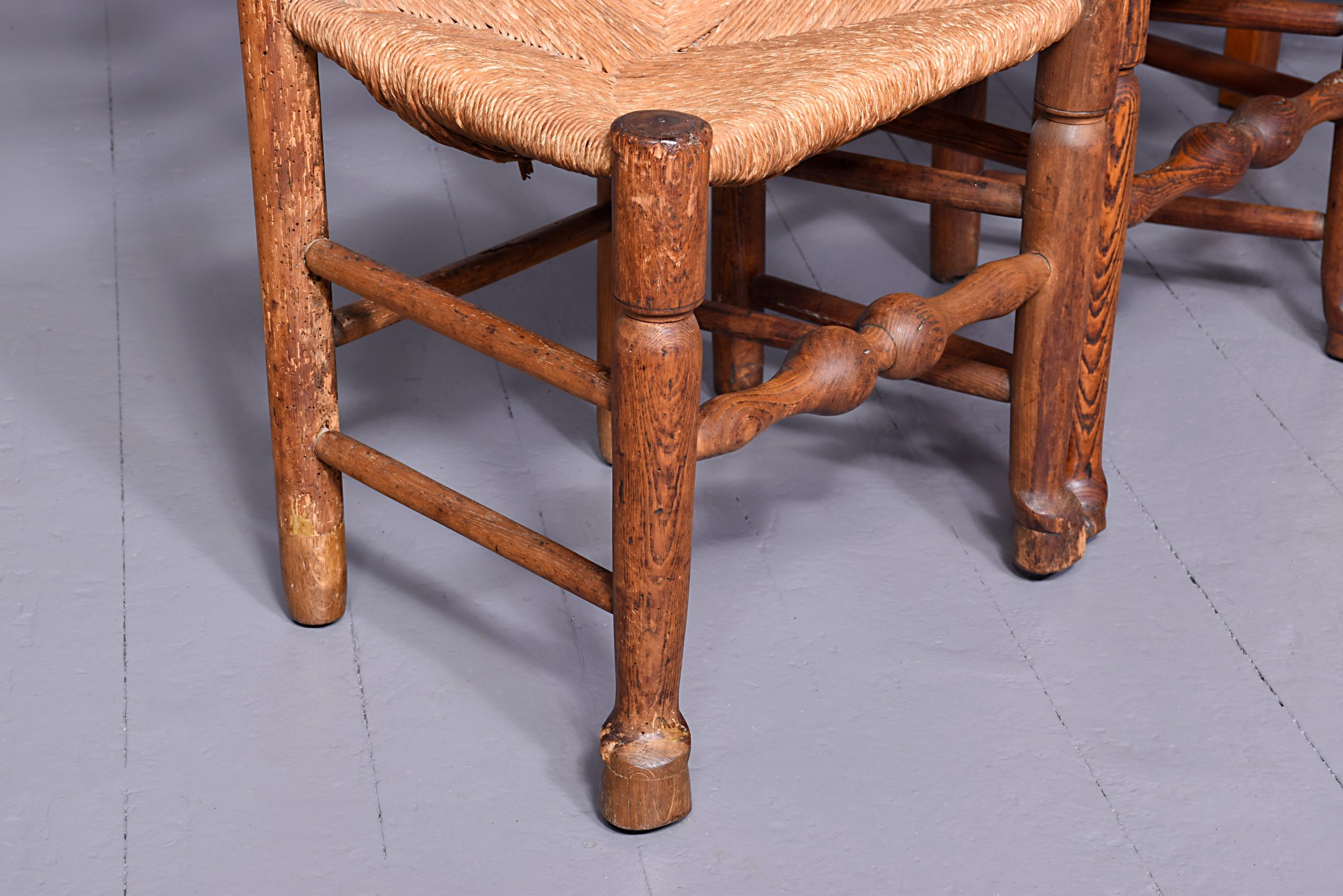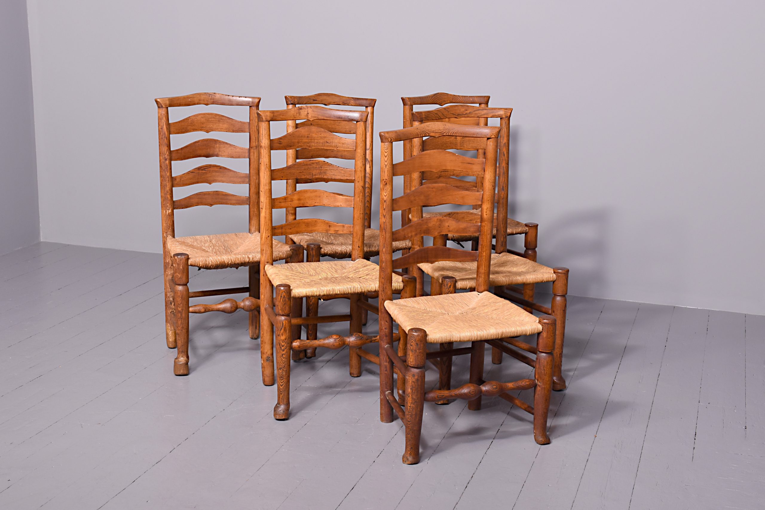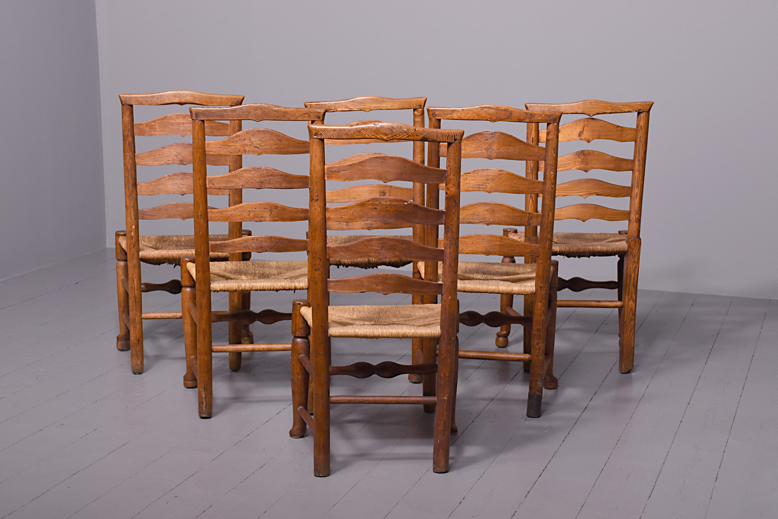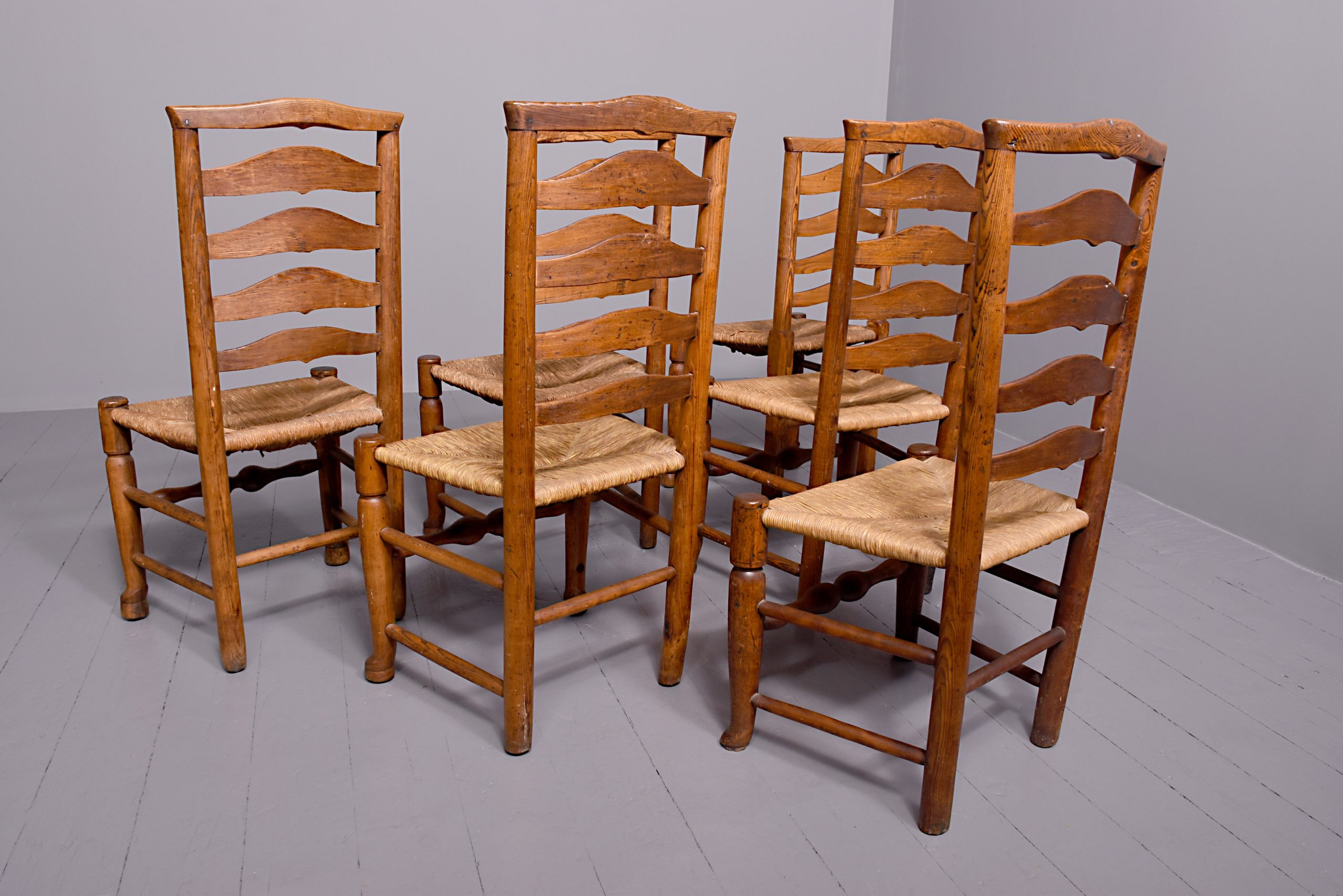 Circa 1830. A set of 6 ash ladder back dining chairs, with a shaped and curved cresting rail, the shaped backs with 4 tapering rail, with woven marram grass seats, the upright at the back form the back legs, with the turned front legs finishing on a simple pad foot, all legs are braced by turned stretchers to the sides and the back with stylish bulbous stretchers to the front.