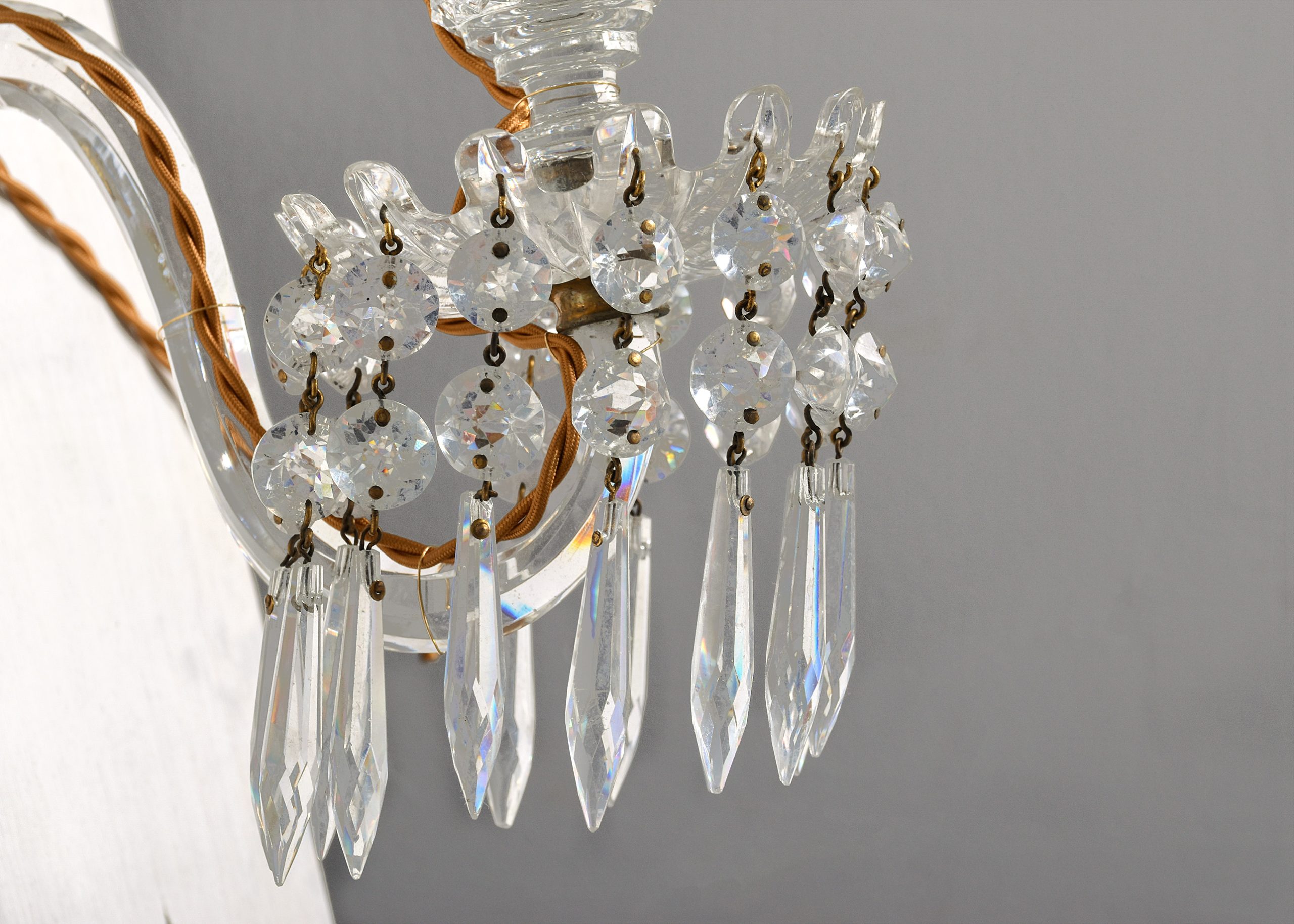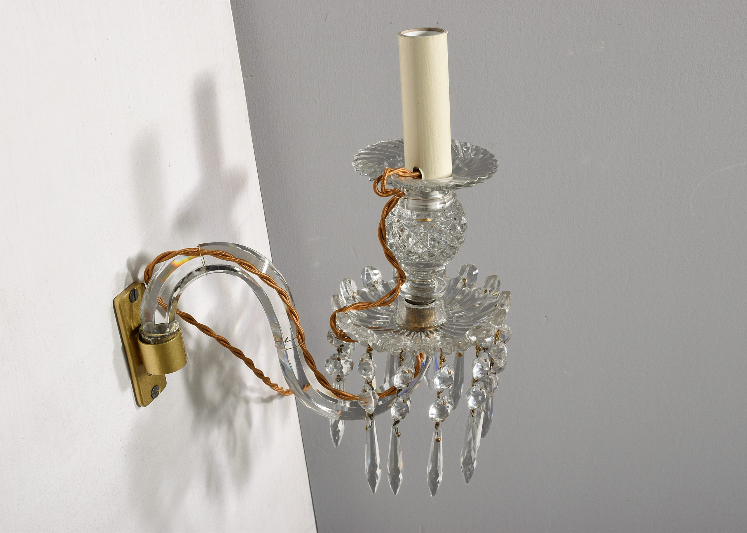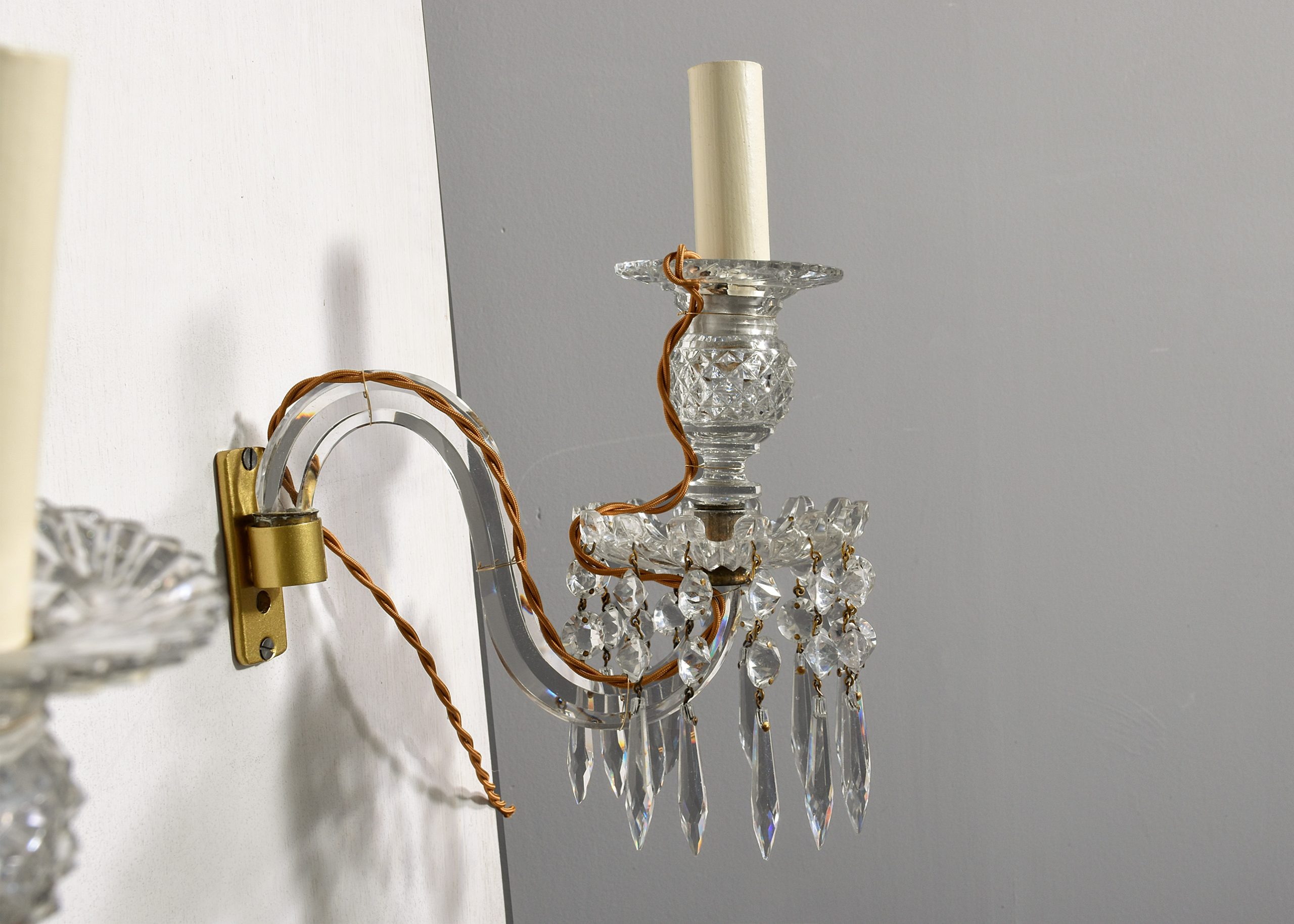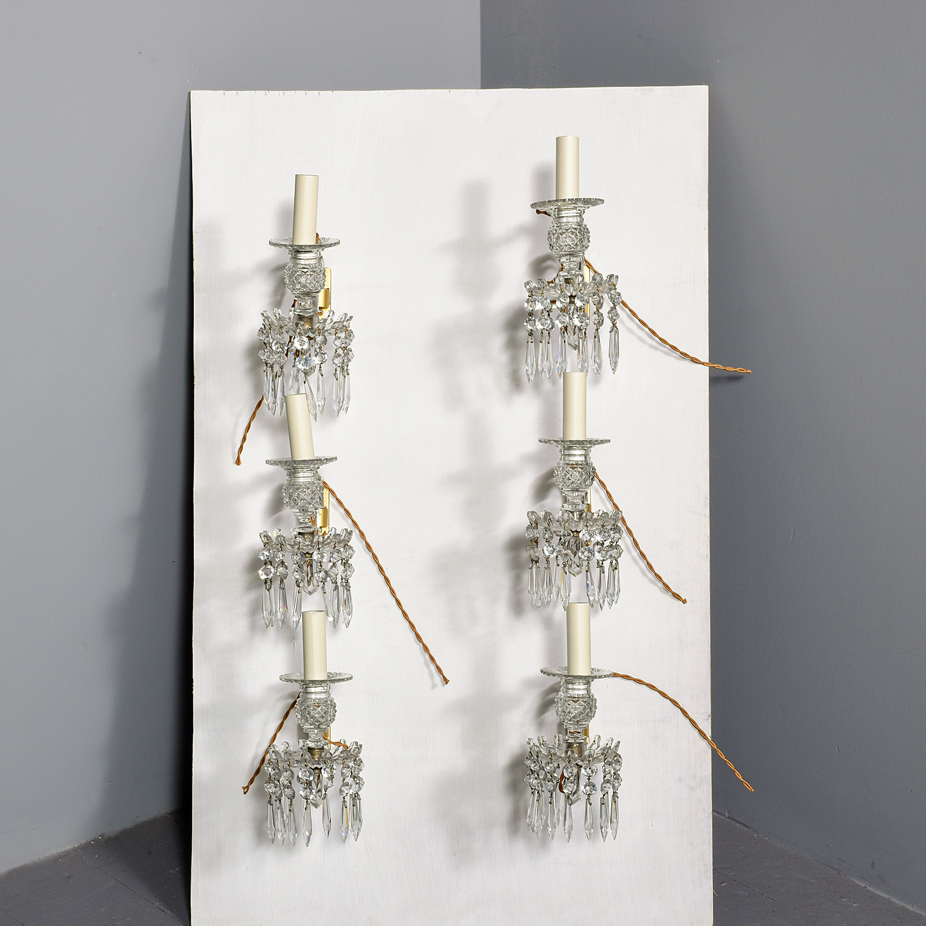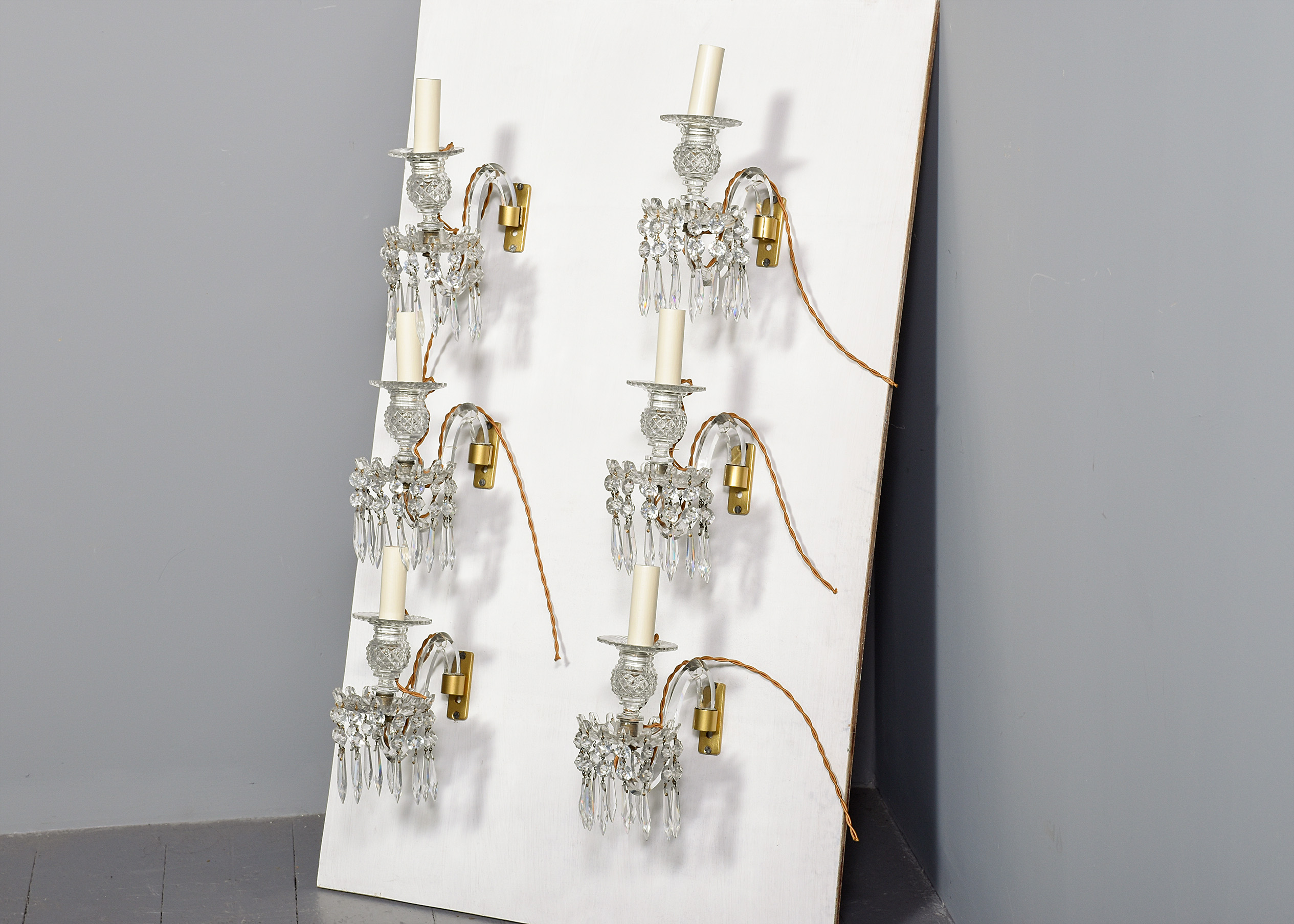Circa 1860 and later. A set of 6 cut crystal wall sconces (recently converted to electricity), the tops surmounted by a faux candle resting on a twisted glass nozzle with a bulbus section beneath in the form of a thistle head, the elaborate drip tray with reeding on the underside all hanging with elongated crystal drops, supported on a shaped glass arm which sits in a brass wall bracket.