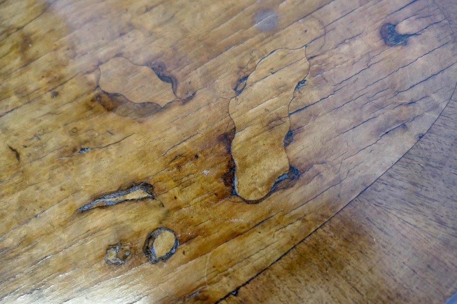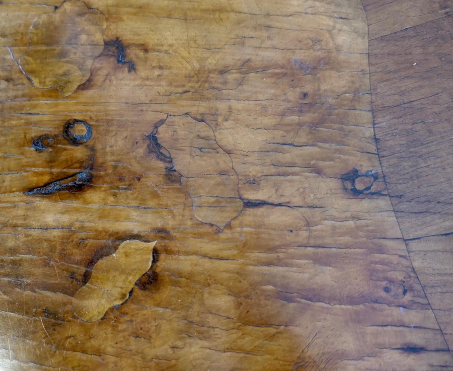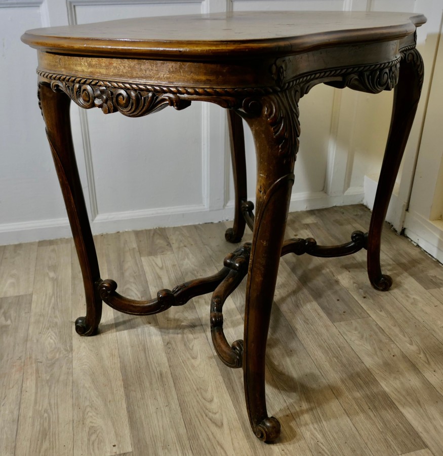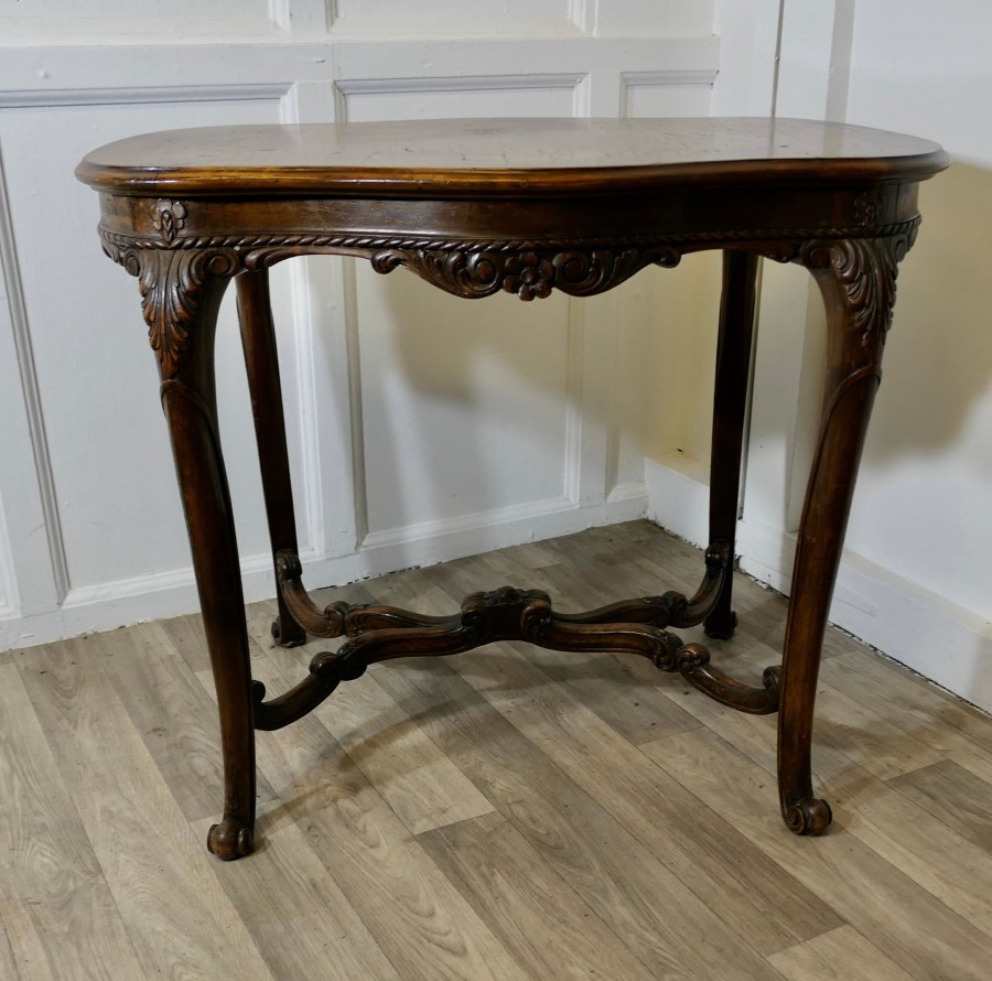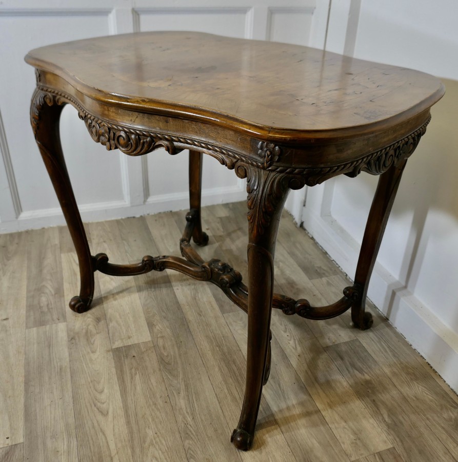 Shaped Walnut Occasional Table This useful little table has a very pretty shape, it has a scalloped edge with carved cabriole legs and carvings to the base, the top has a very unusual patchwork displayed on the upper surface This is a very attractive piece, it is in good condition for its age and would work well was a side or lamp table The Table stands 26” high, 32” x 24” TZX132 Manufacture Date : 19th Century Materials : Walnut