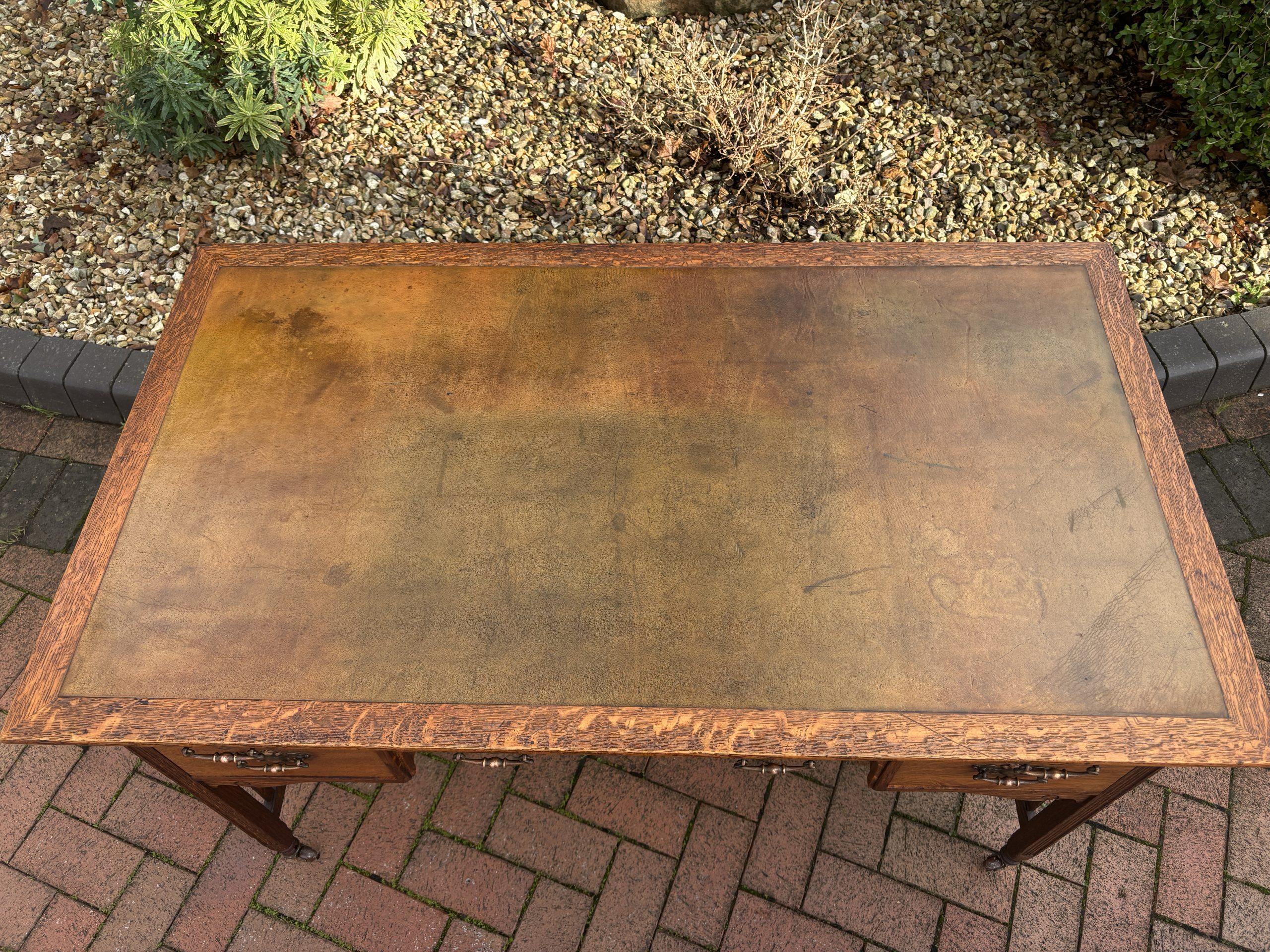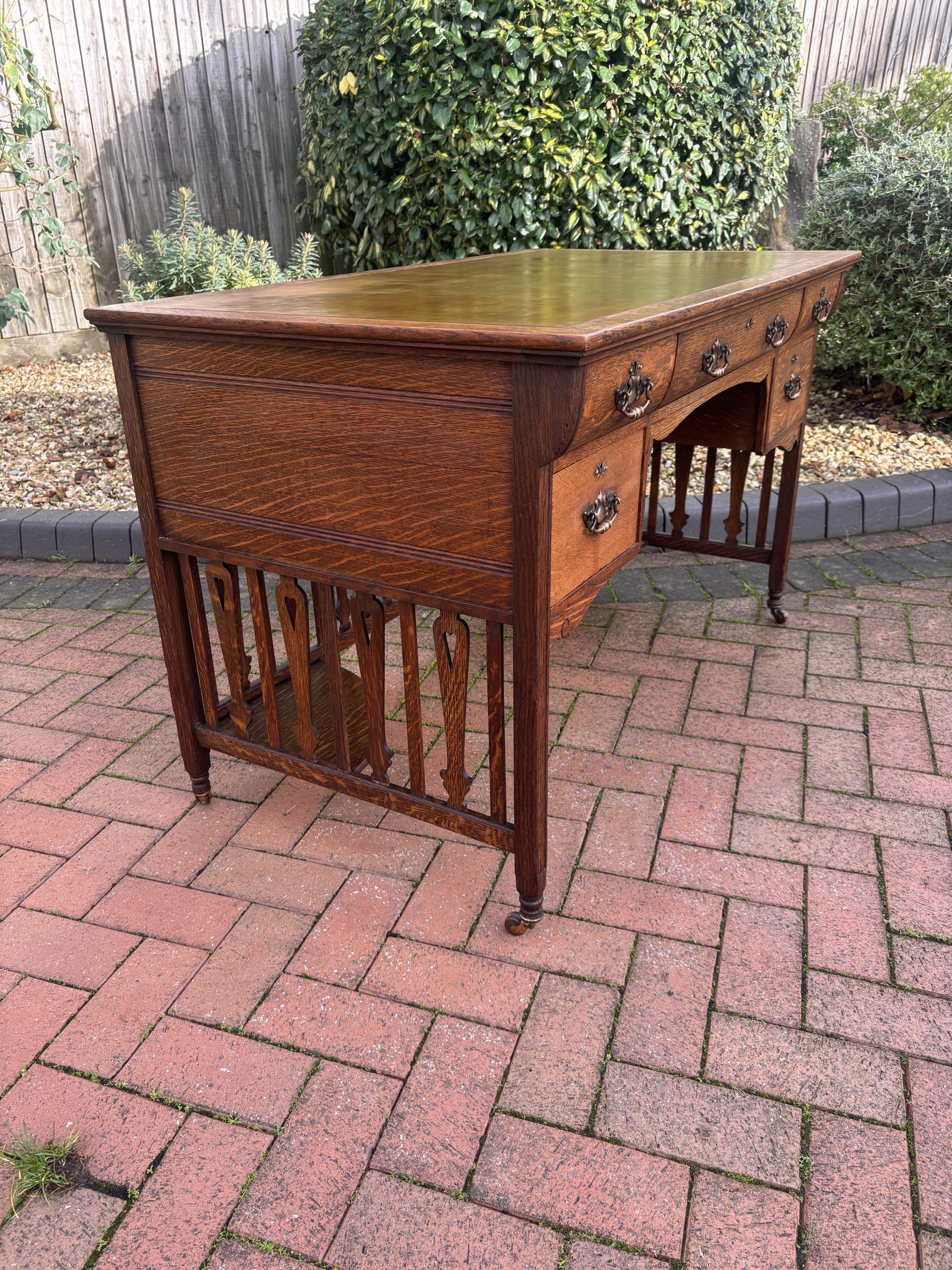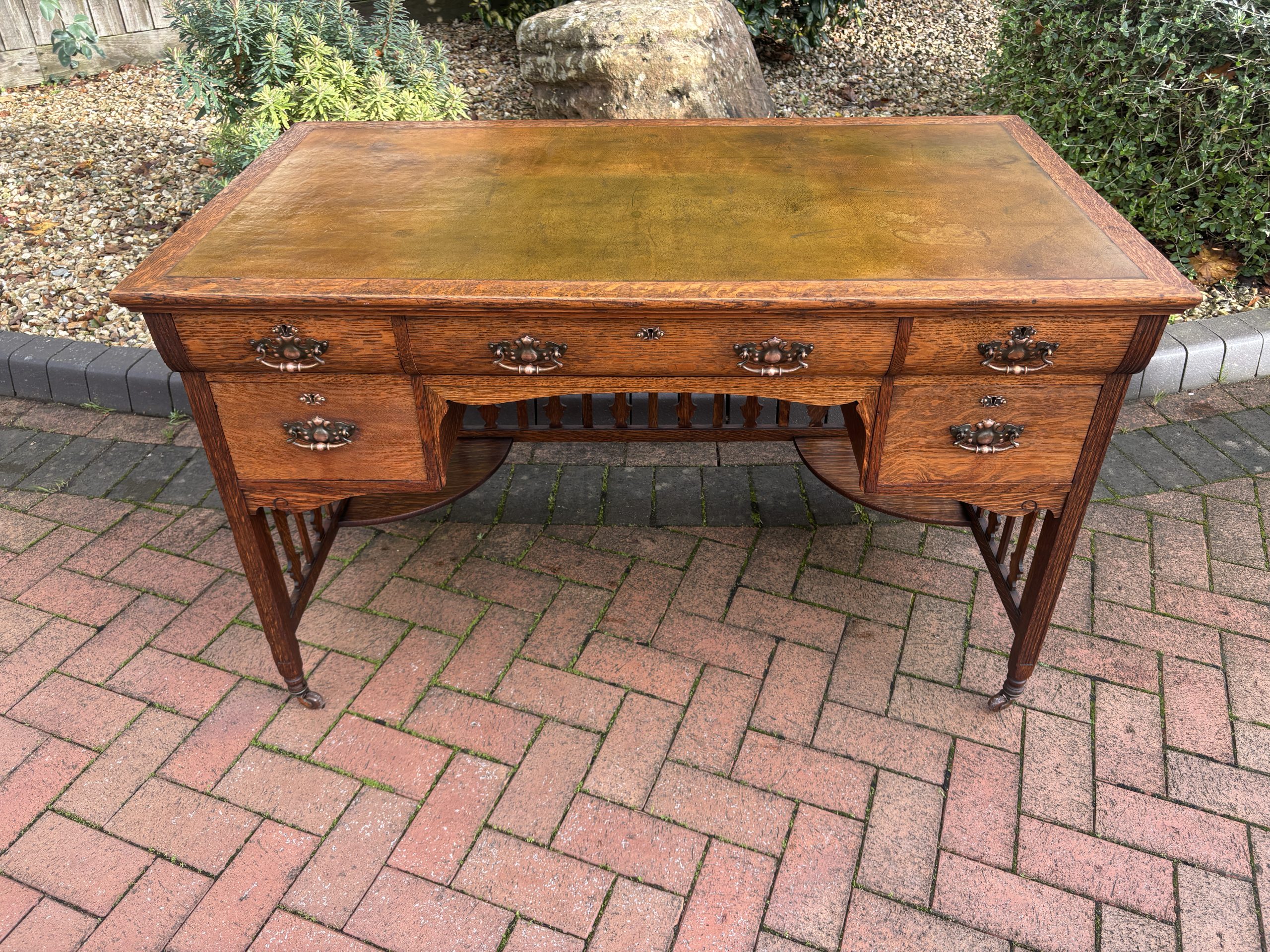 An Arts & Crafts quarter sawn solid oak writing desk by Shapland & Petter of Barnstaple c1900. The desk top has a leather skiver over three drawers across the front elevation, having curved section fronts with straight fronted drawers below, all with original copper handles. The perimeter of the desk is formed by heart shaped cut-out splats, with rear bottom corner shelves. The desk stands on square section legs with fluted detailing ending with casters.