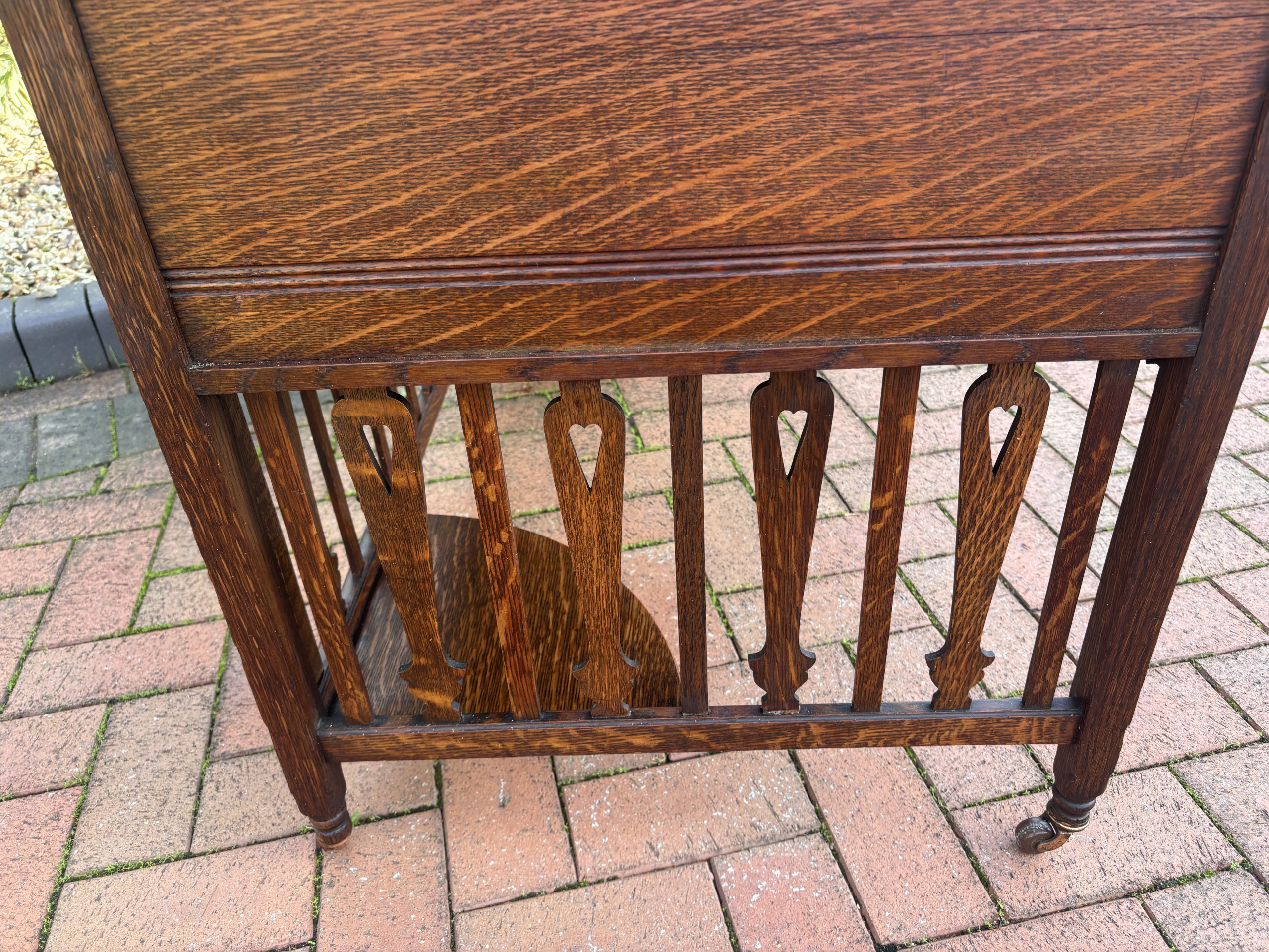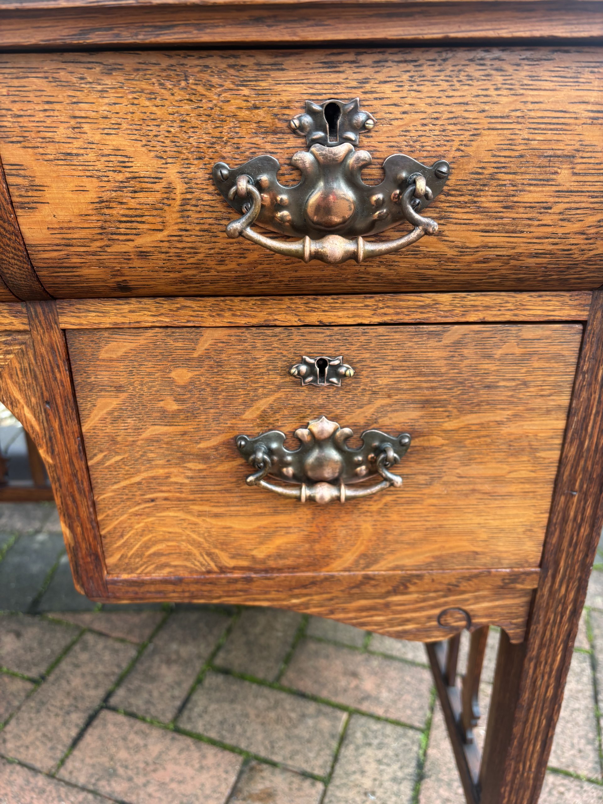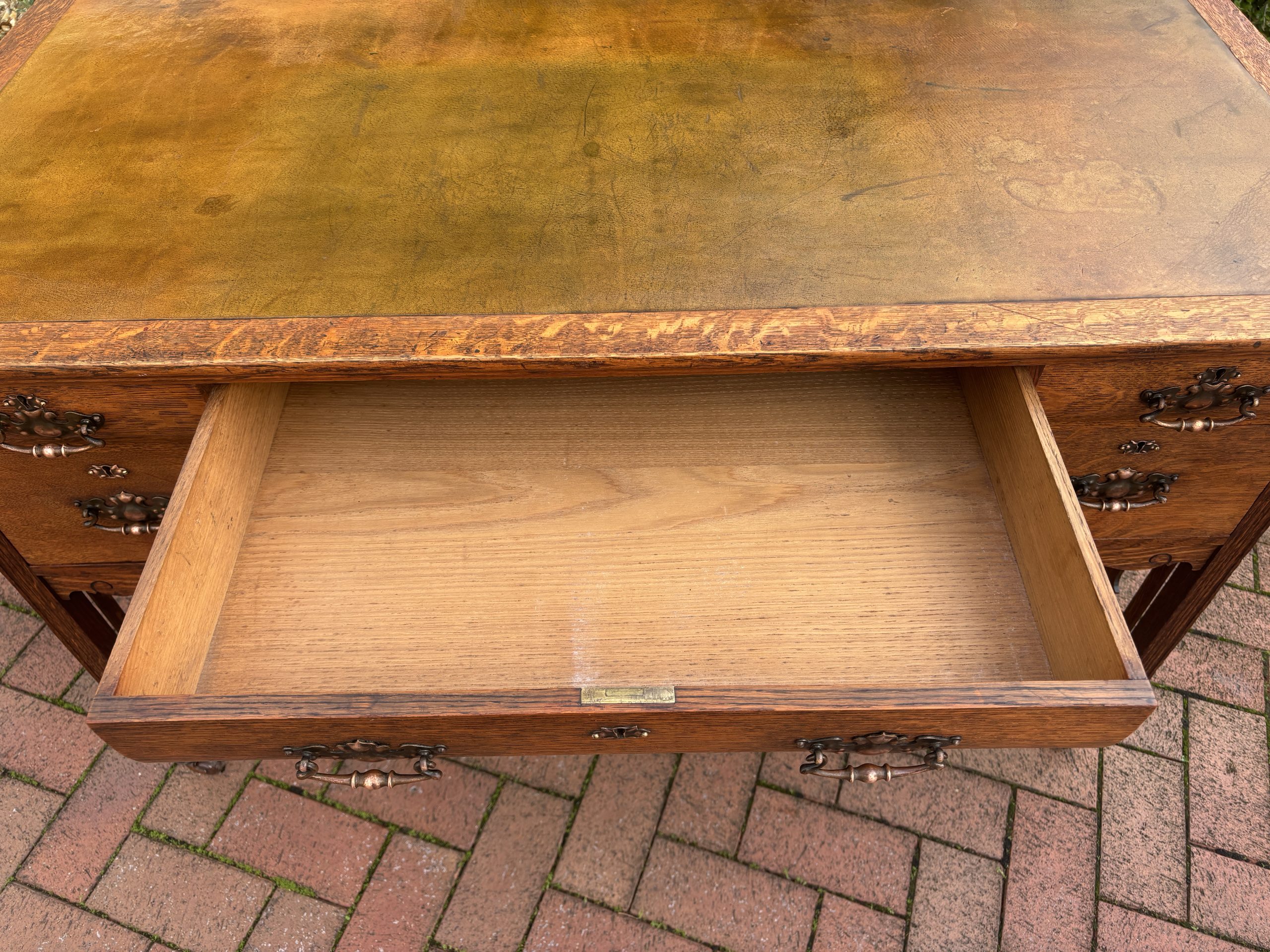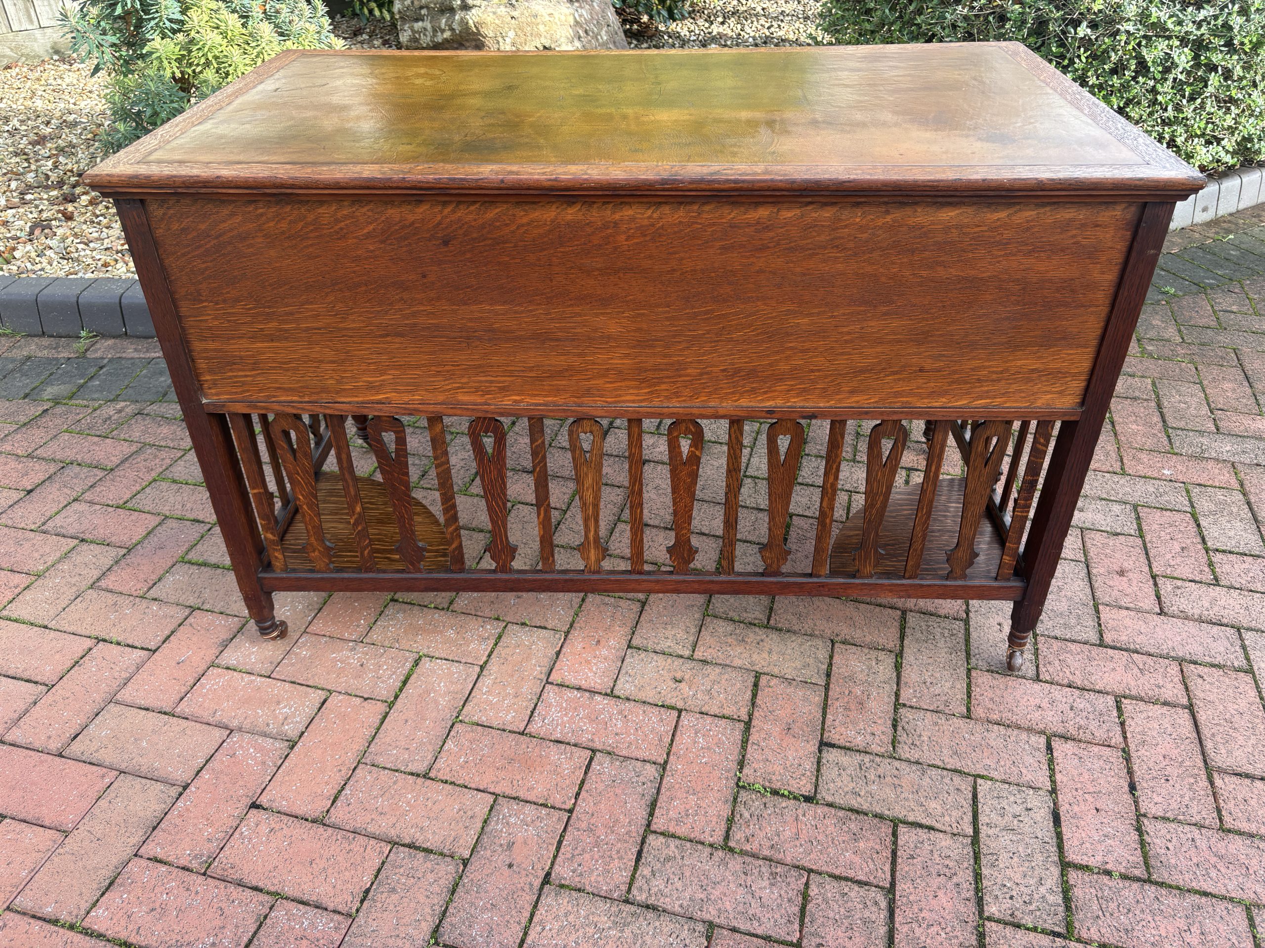 An Arts & Crafts quarter sawn solid oak writing desk by Shapland & Petter of Barnstaple c1900. The desk top has a leather skiver over three drawers across the front elevation, having curved section fronts with straight fronted drawers below, all with original copper handles. The perimeter of the desk is formed by heart shaped cut-out splats, with rear bottom corner shelves. The desk stands on square section legs with fluted detailing ending with casters.
