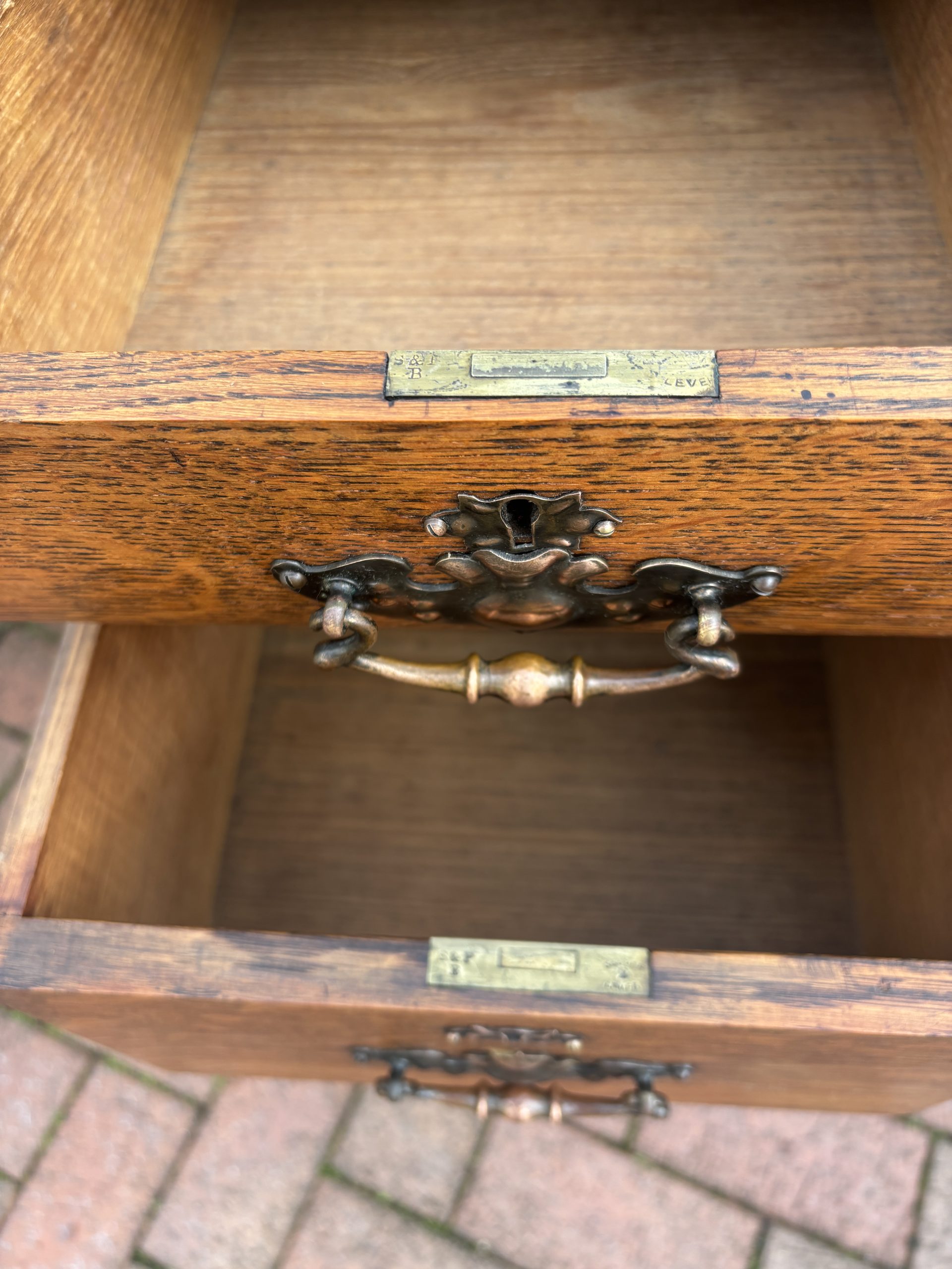 In very good condition, all the drawers run well. Locks present but no key. Age related stains and wear to the leather skiver, but no rips or scuffs.