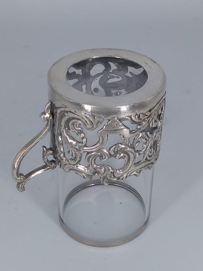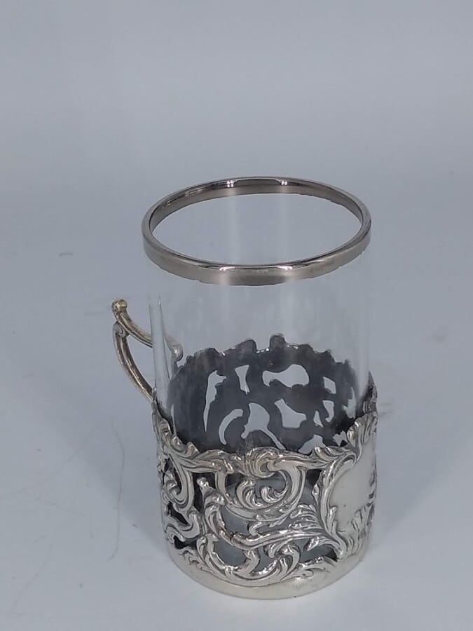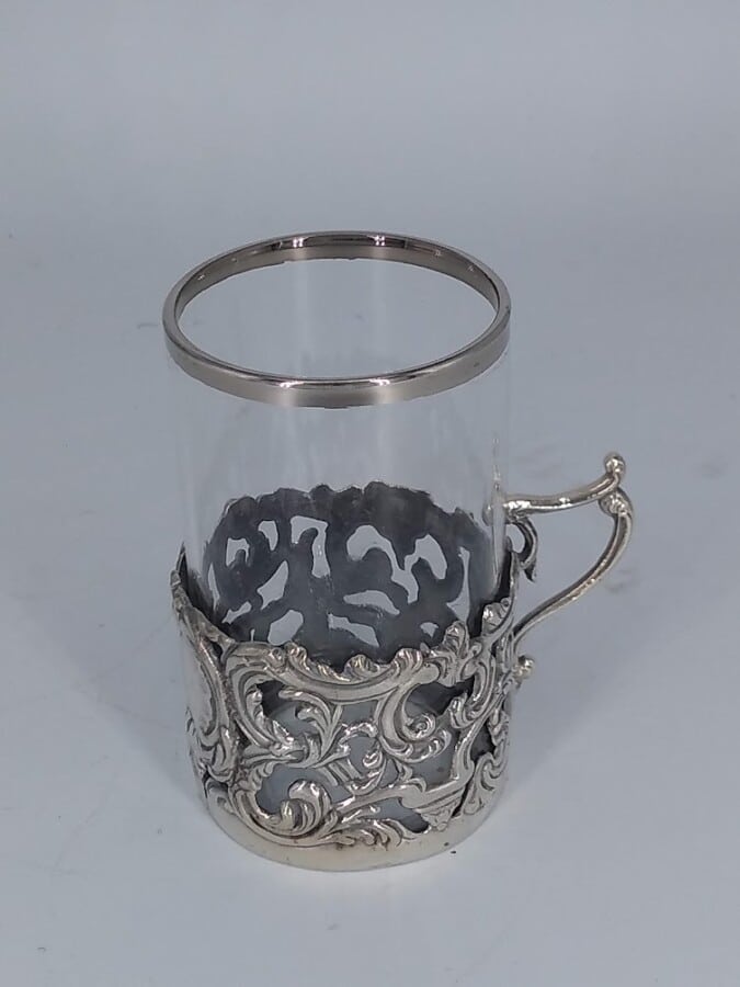 A fancy silver and glass coffee/tea holder by Ari D Norman.