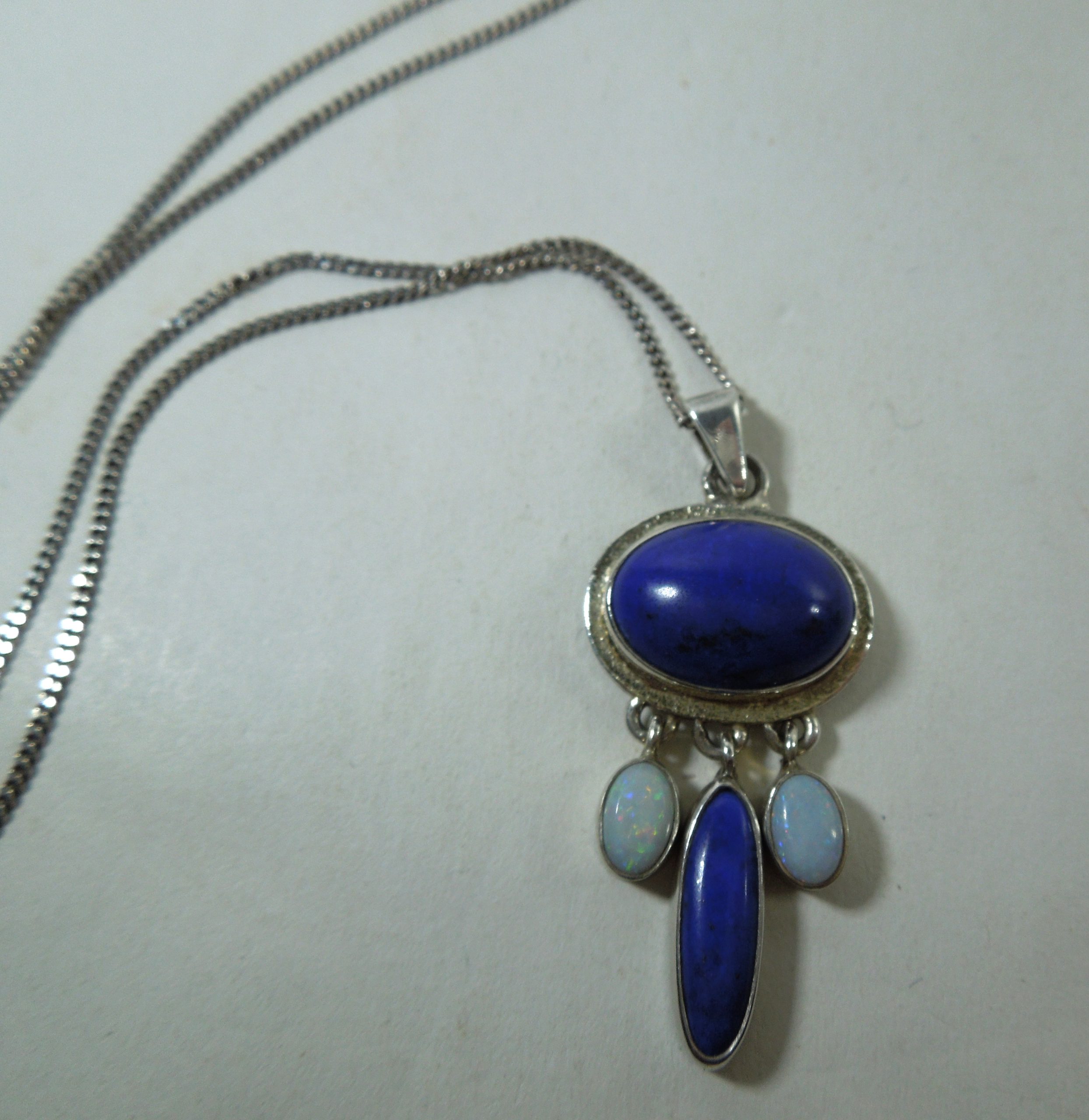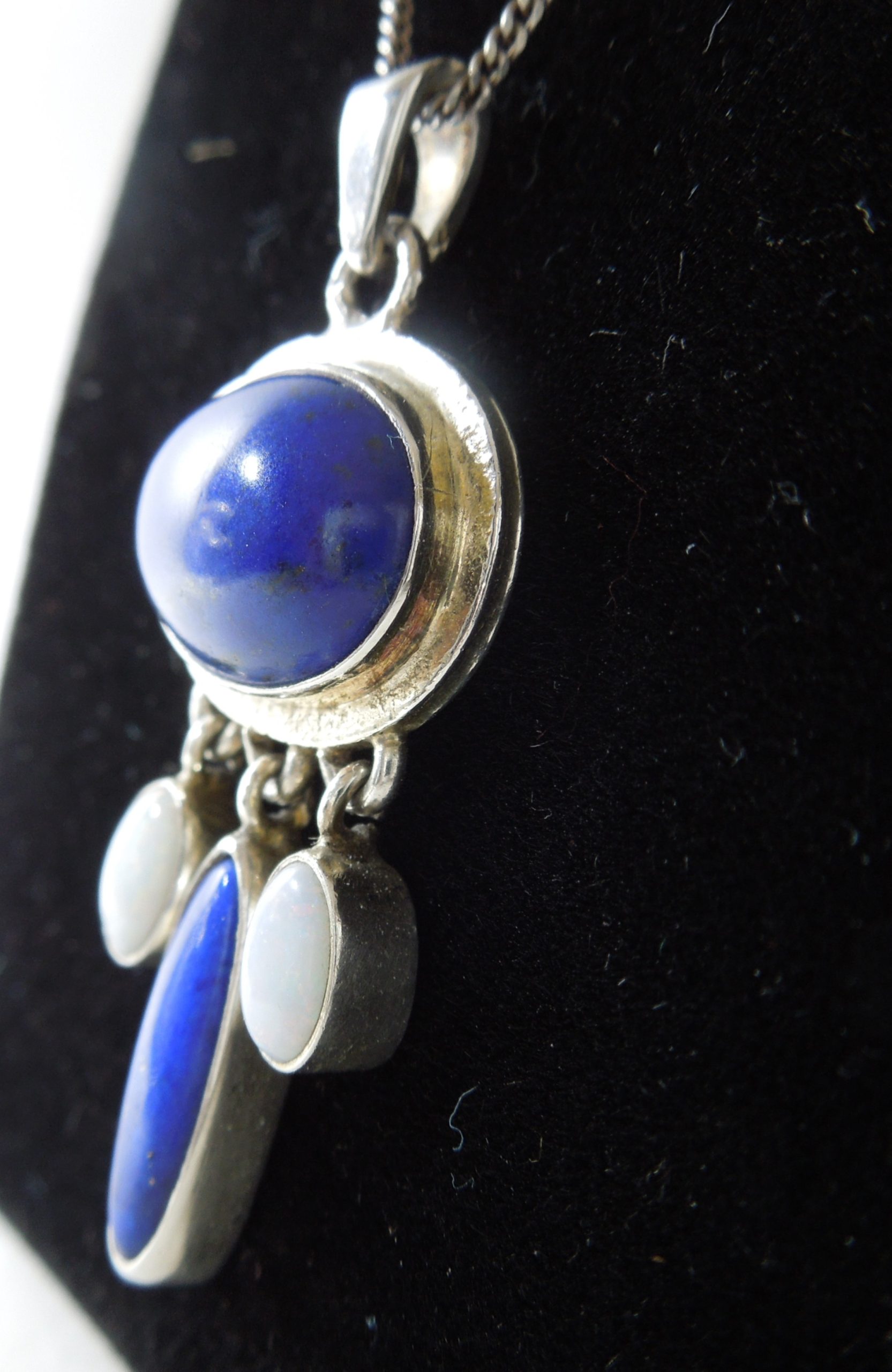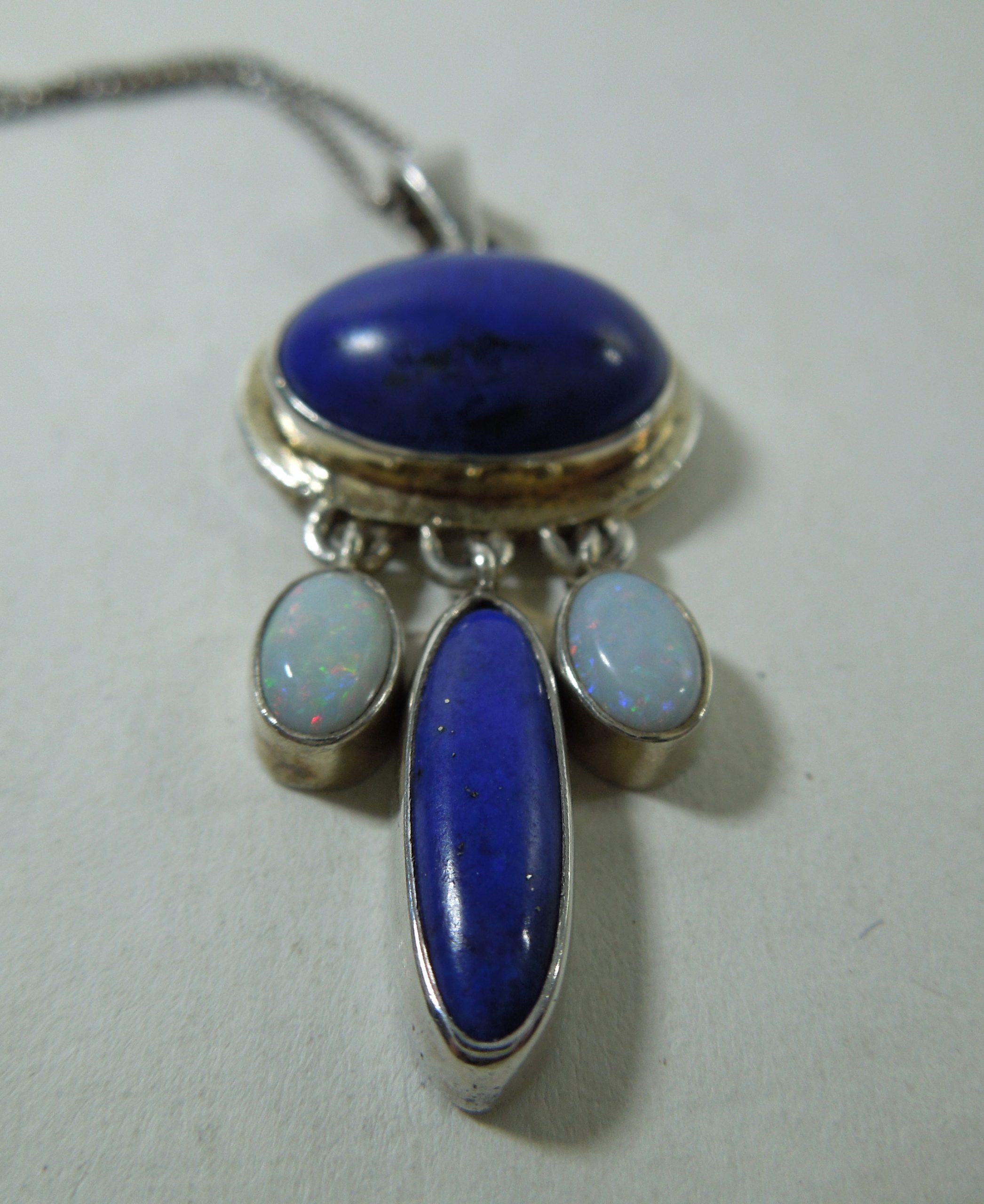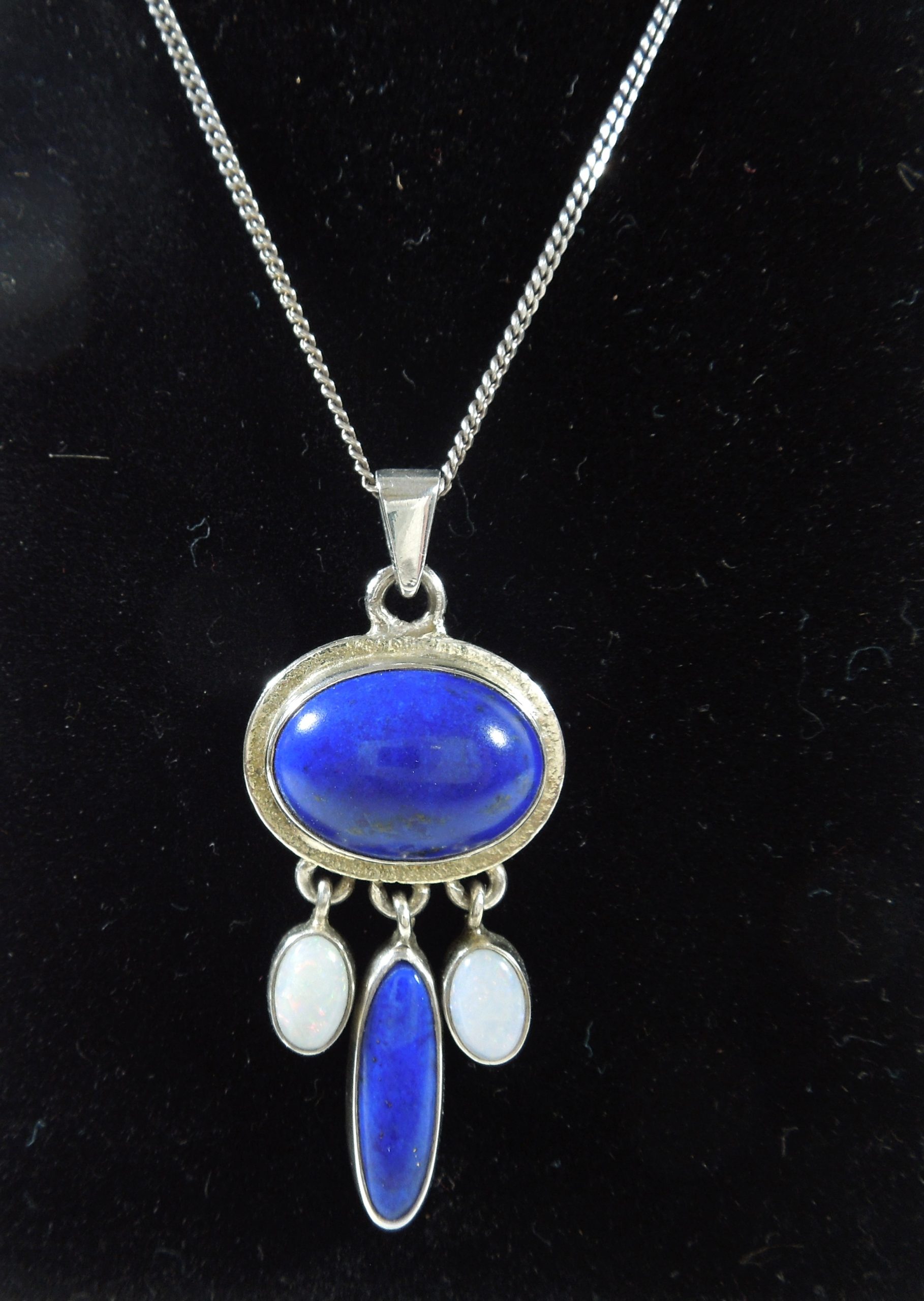 A silver set pendant with a large central Lapis Lazuli cabochon stone with attached oval drops of Lapis Lazuli and 2 fiery Opals on either side.