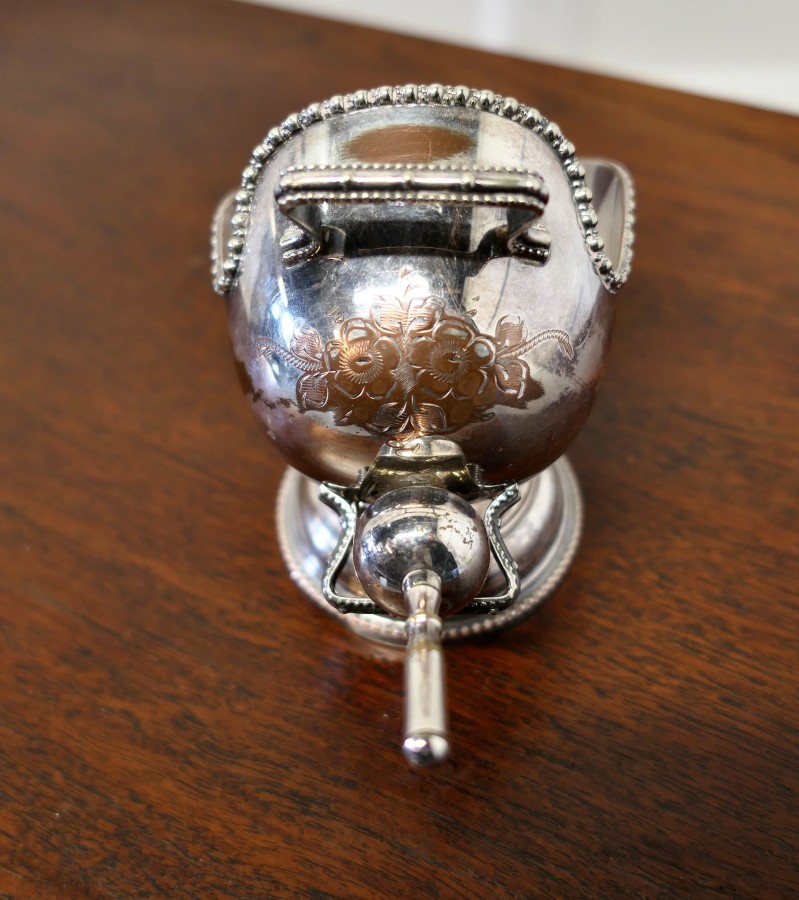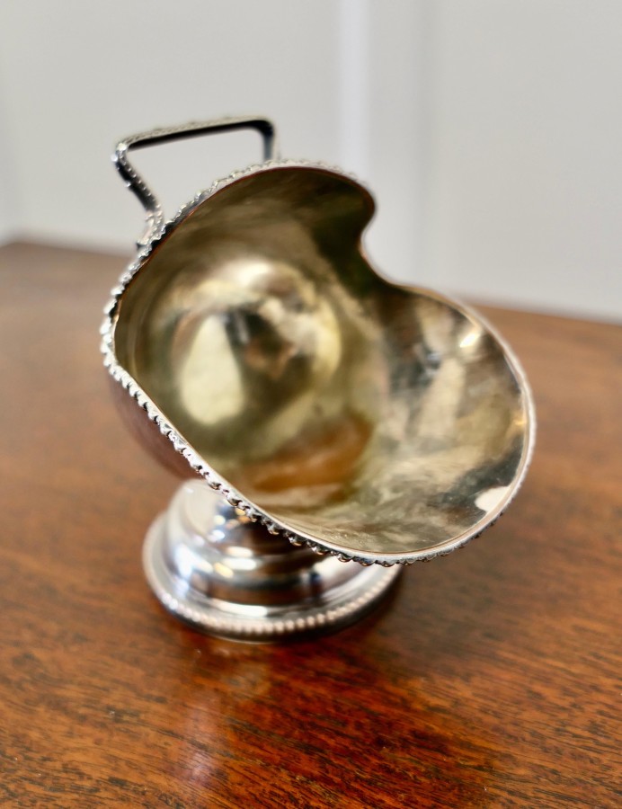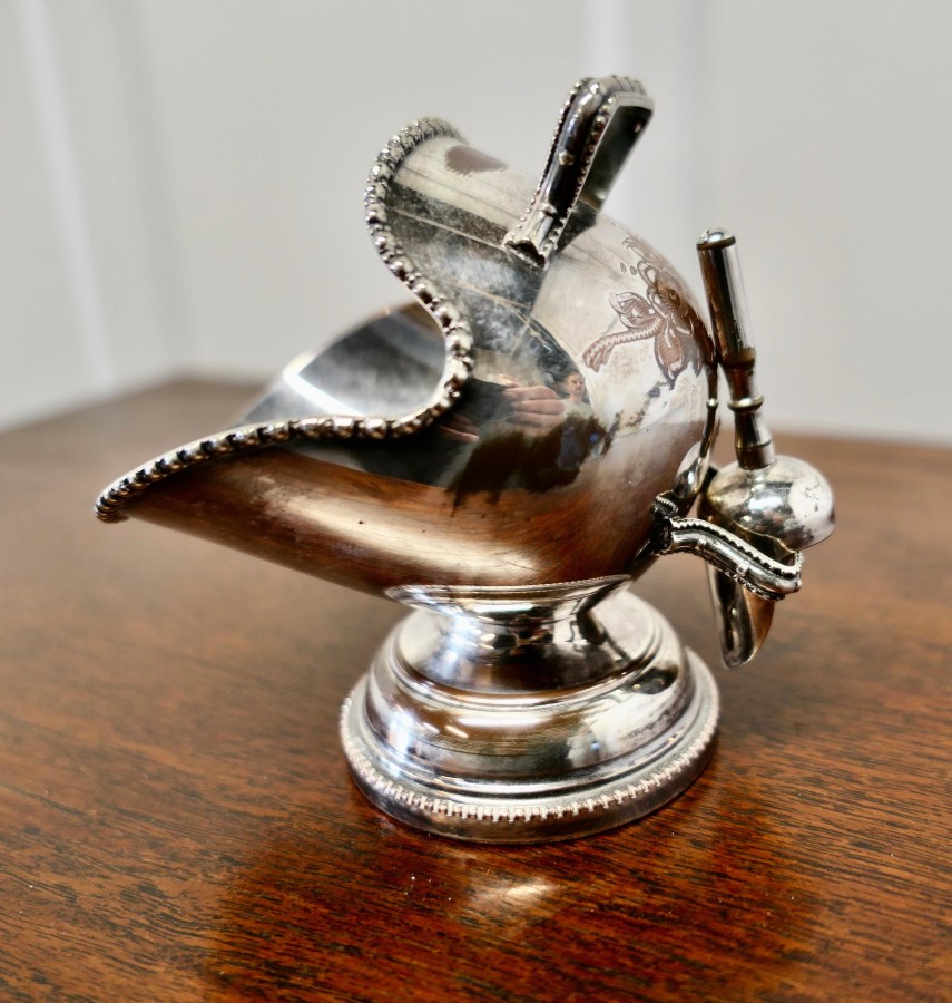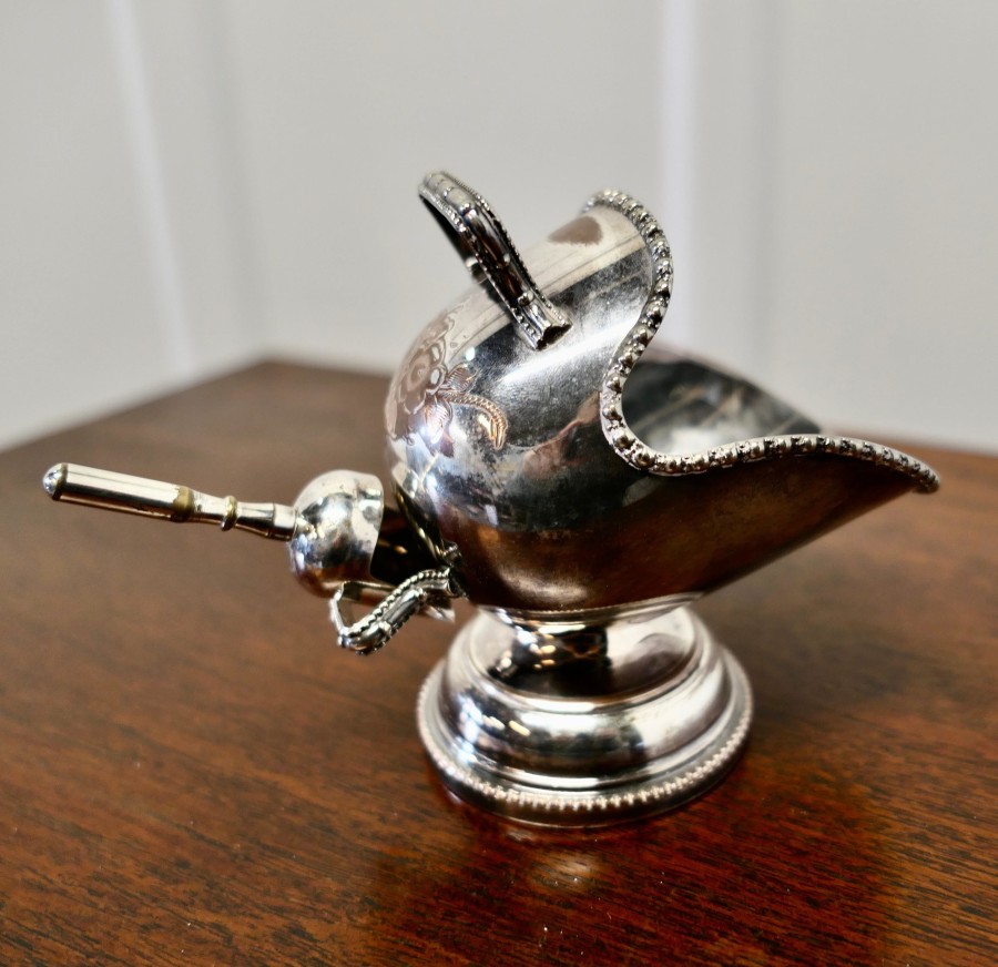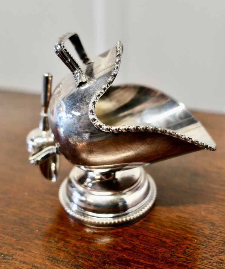 Silver Plated Novelty Sugar Scuttle with Original Scoop A Sugar scuttle as the name suggests is designed in the shape of a coal scuttle, a great fun piece for the Tea Table This one is 5” high, 3.5” wide and 5” back to front TGF53 Manufacture Date : 1920 Materials : Silver-plate