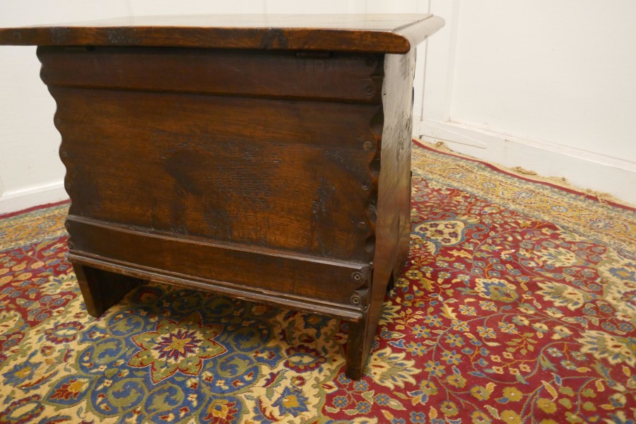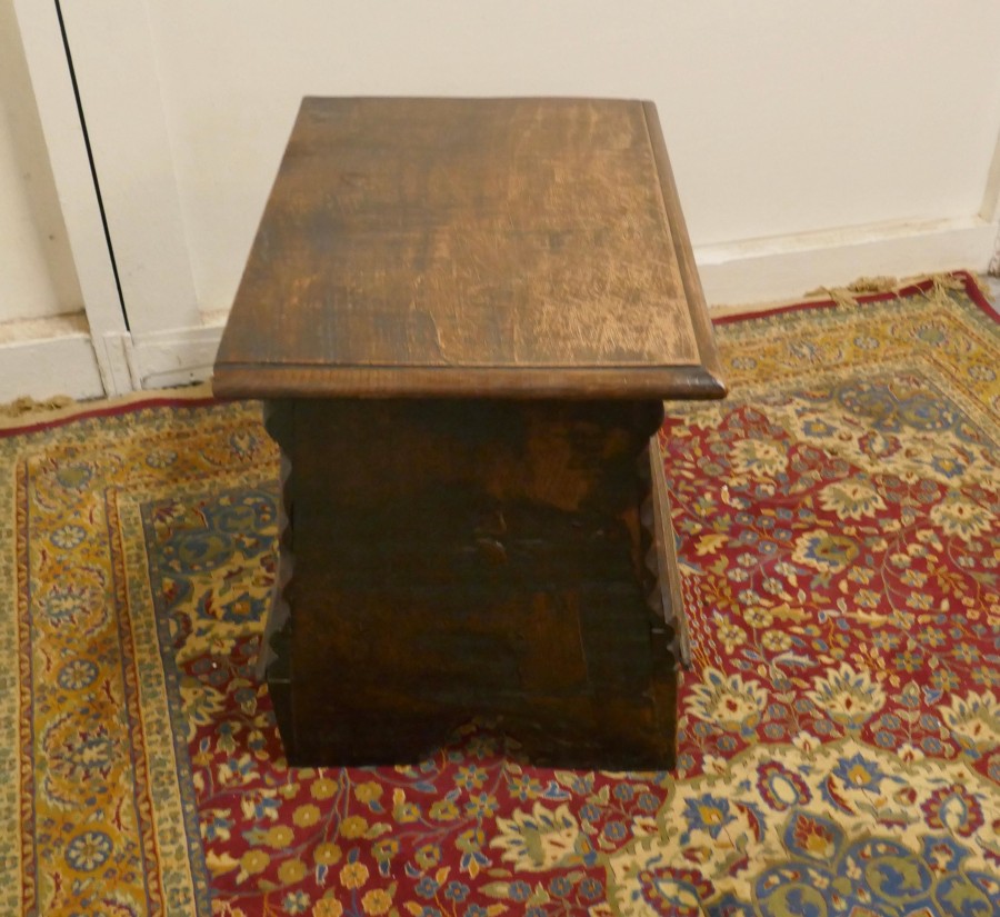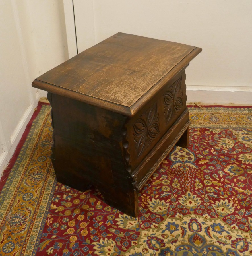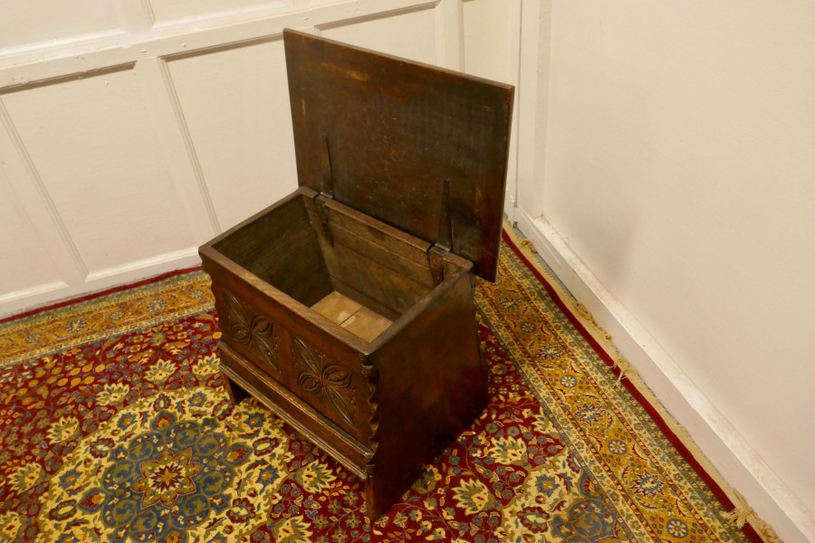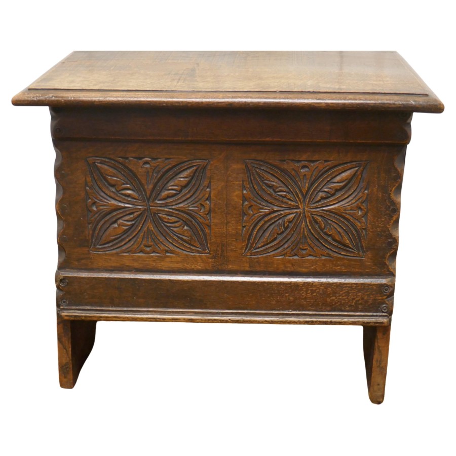 Small carved oak chest or shoe box coffer The chest has 2 carved panels to the front and and decorative nailed and scalloped corners, inside is clean and it has blacksmith made hinges This small oak coffer has a good storage compartment inside, it would also work well as a stool, or a handy side table Measures: The stool is 20” high, 24” wide and 17” deep TAC95. Manufacture Date : 1900 Materials : Oak