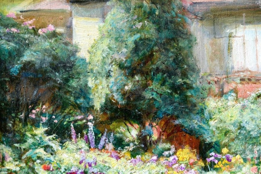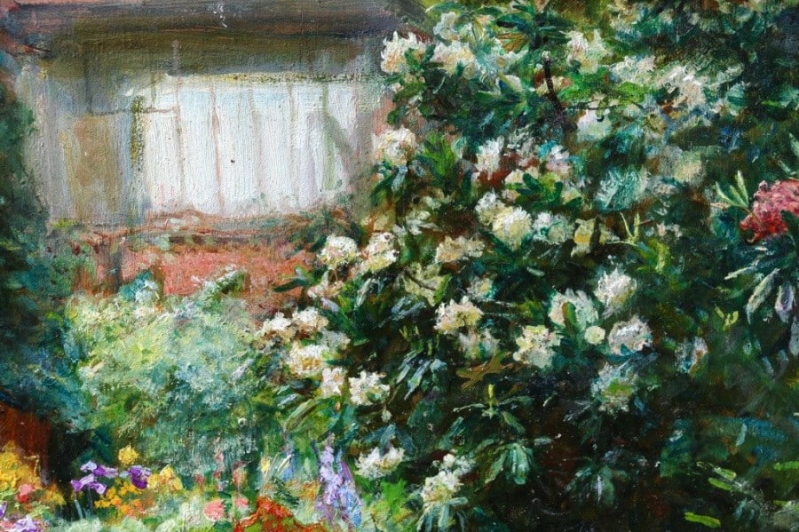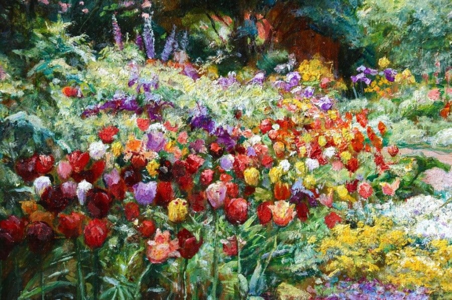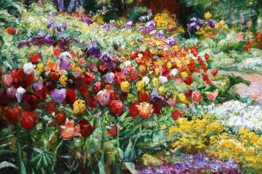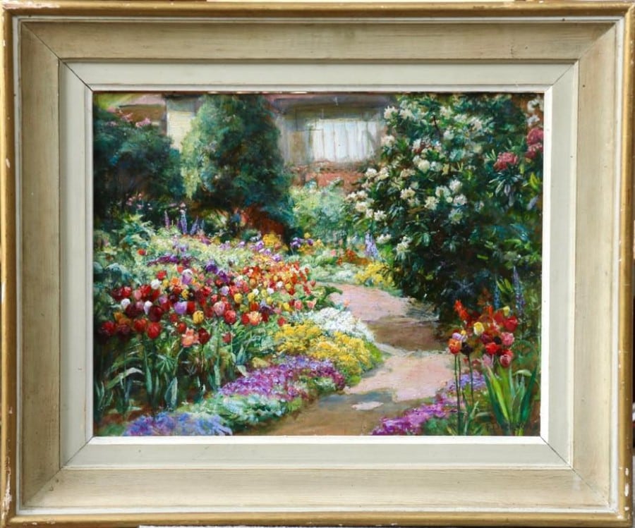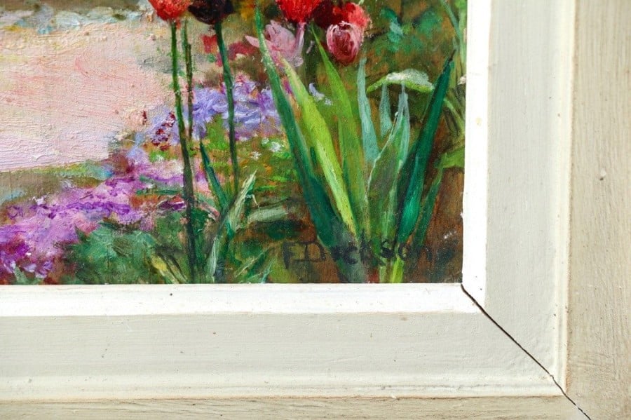 A beautiful oil painting by Frank Dickson depicting flowers in a garden. This highly striking and colourful work is superbly done and is of the highest quality,. The artist exhibited at the Royal Academy and elsewhere and his best pieces can make up to £9,000 at auction.