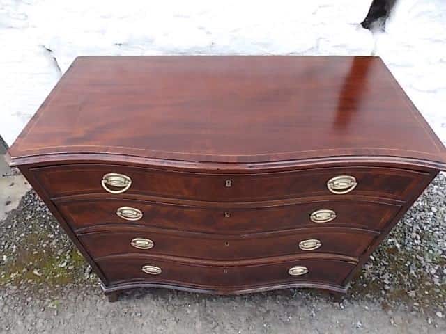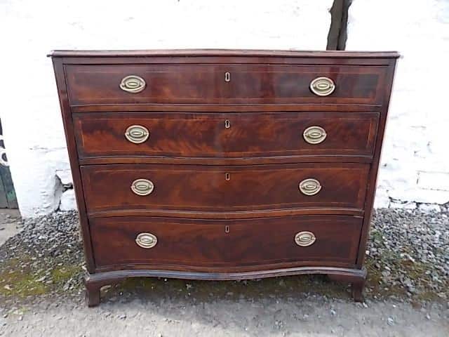 Georgian serpentine mahogany chest of drawers. Superb quality four straight drawer chest of drawers, Nice clean example with figured mahogany draw fronts. satinwood stinging on the canted corners and drawer front fieldings. Raised on bracket feet. Georigian serpentine chests of drawers remain the most opulent of all chests of drawers. Although in recent years these chests have come down in price along with most other good furniture, this situation will not last. These kind of fine chests of drawers in good condition were sold between £4-7000, not so long ago.
