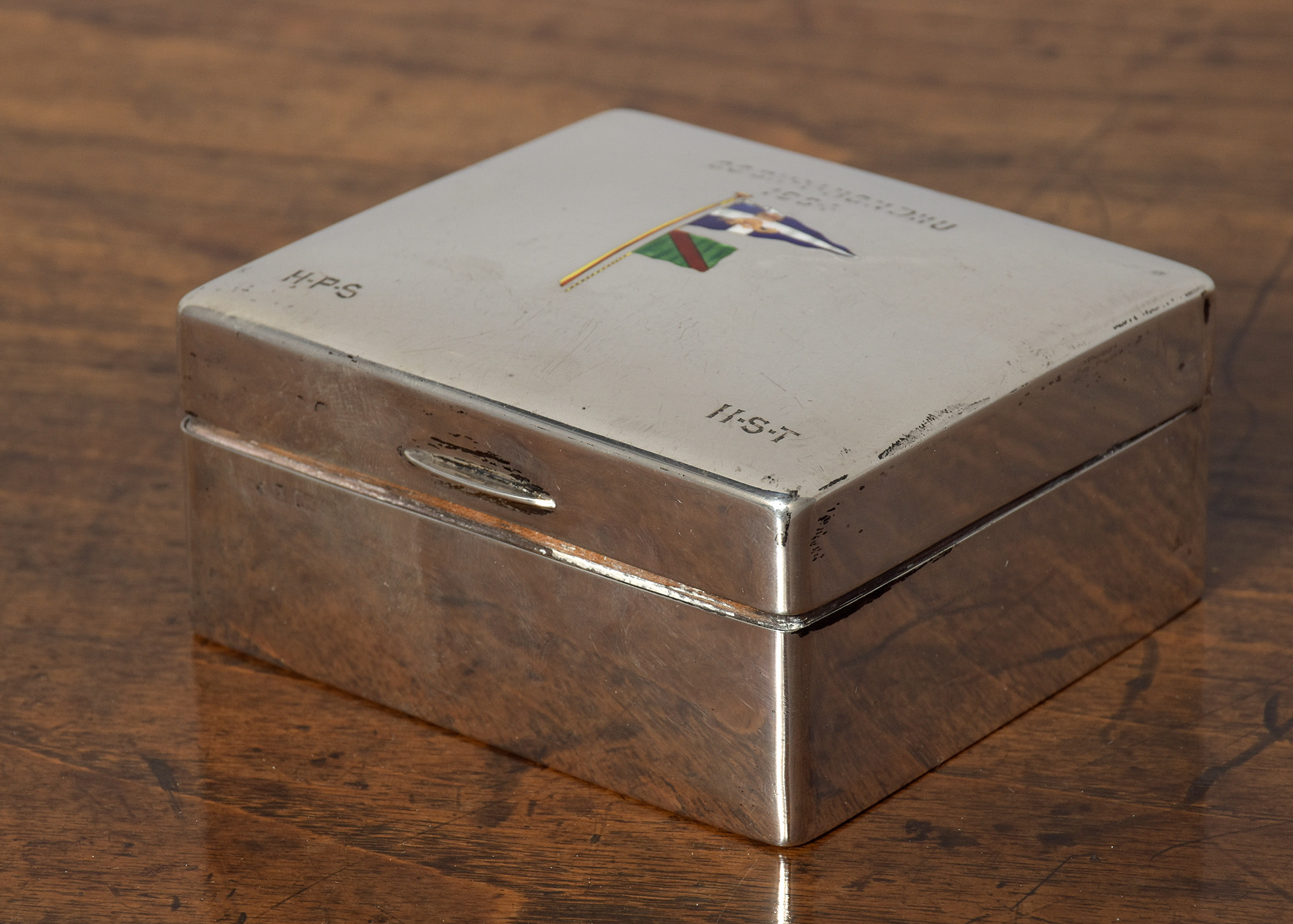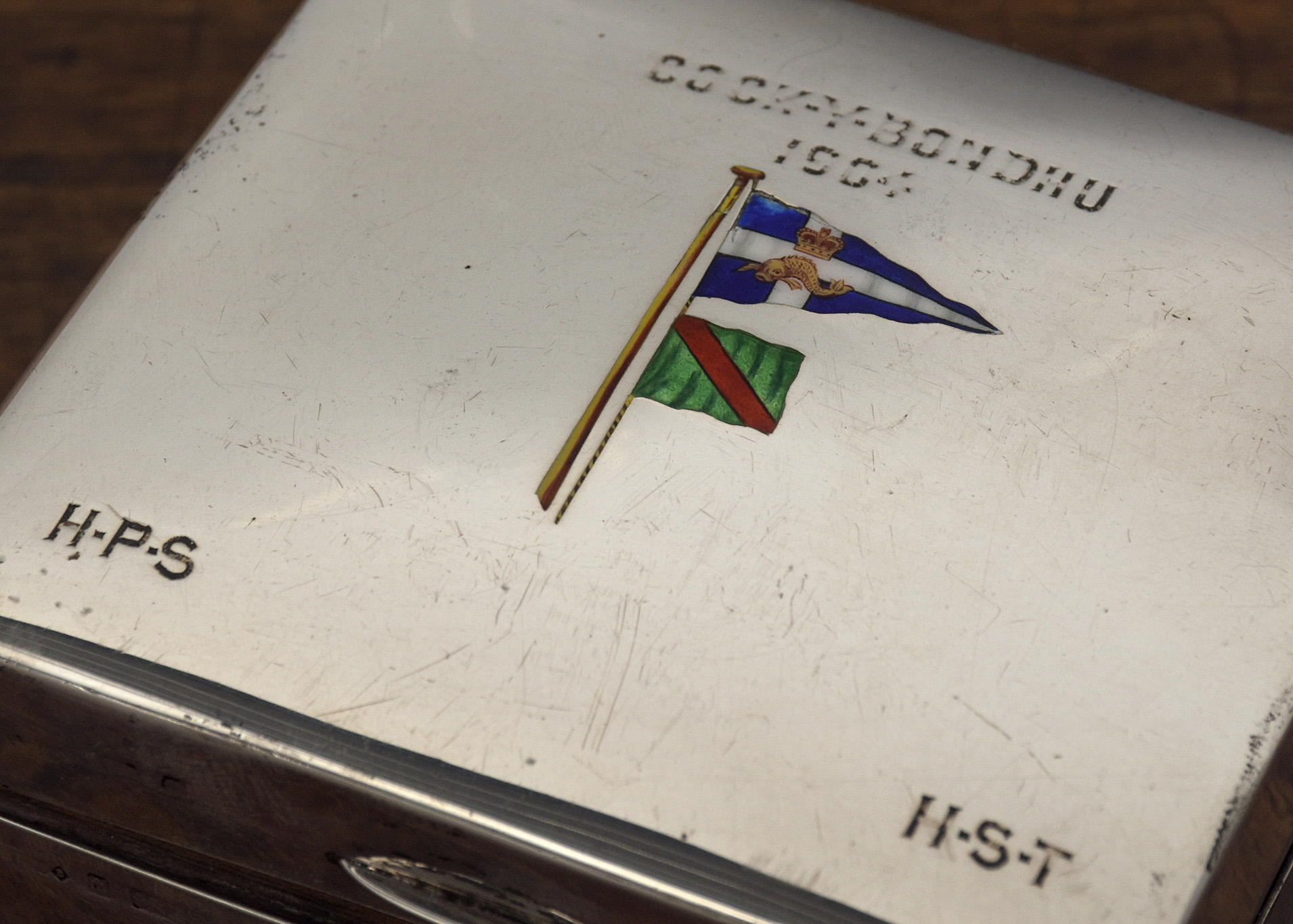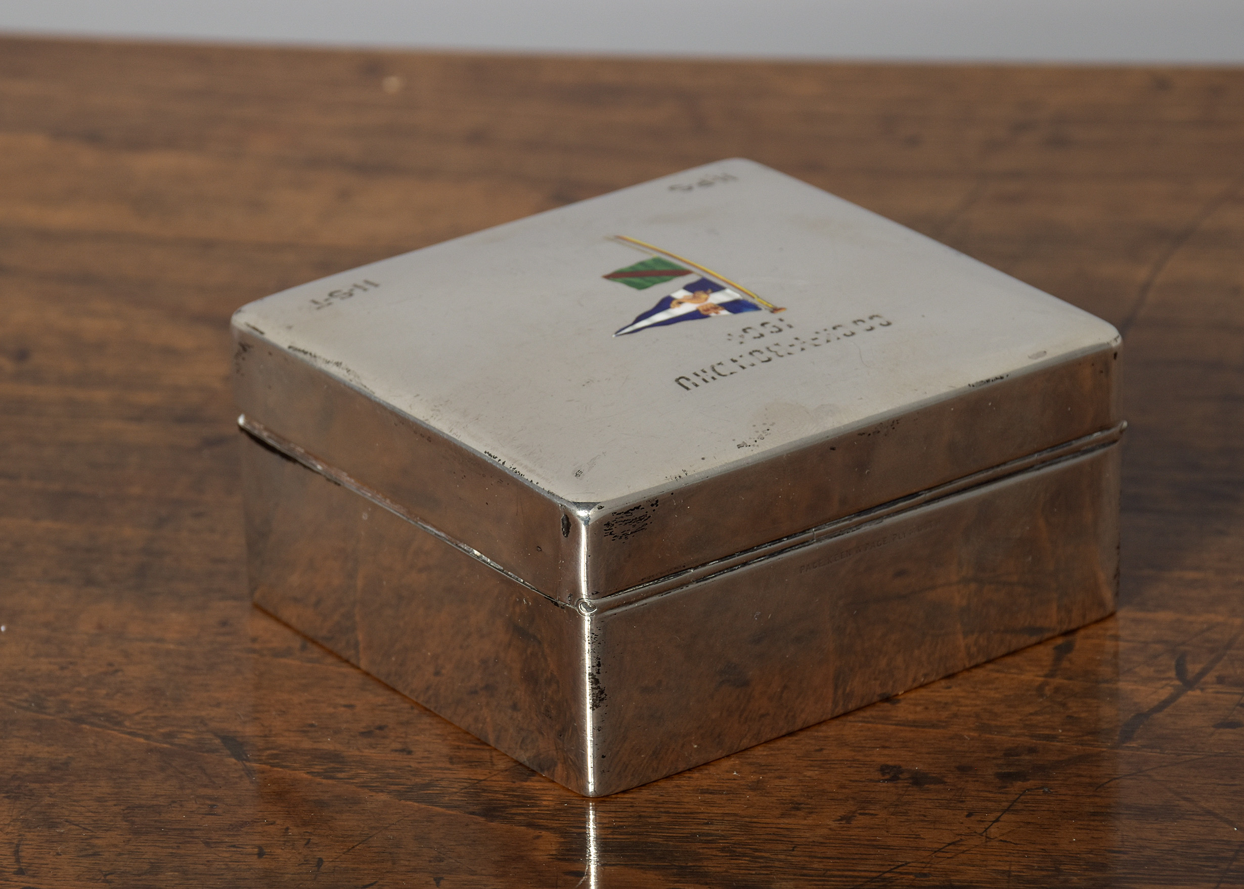 Solid silver box with enamelled nautical flags on the lid and engraved COCK-Y-BONDHU 1904
