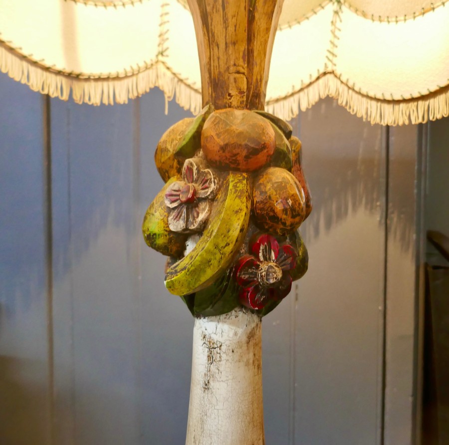 Spanish Folk Art floor standing standard lamp A traditionally turned, carved and painted piece from Spain. This wooden lamp stands on a square base, it is stepped at floor level and has a large bulbous shape decorated with carved and painted Flowers and Fruit, the lamp comes with its original hand made shade The lamp is 60” high and the shade is 24” in diameter. NV287. Manufacture Date : 1950 Materials : Softwood