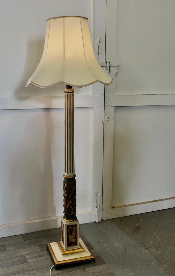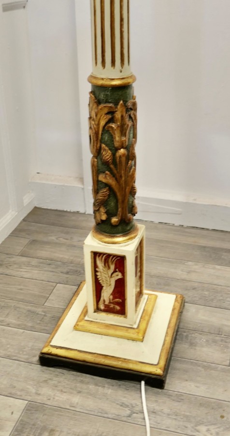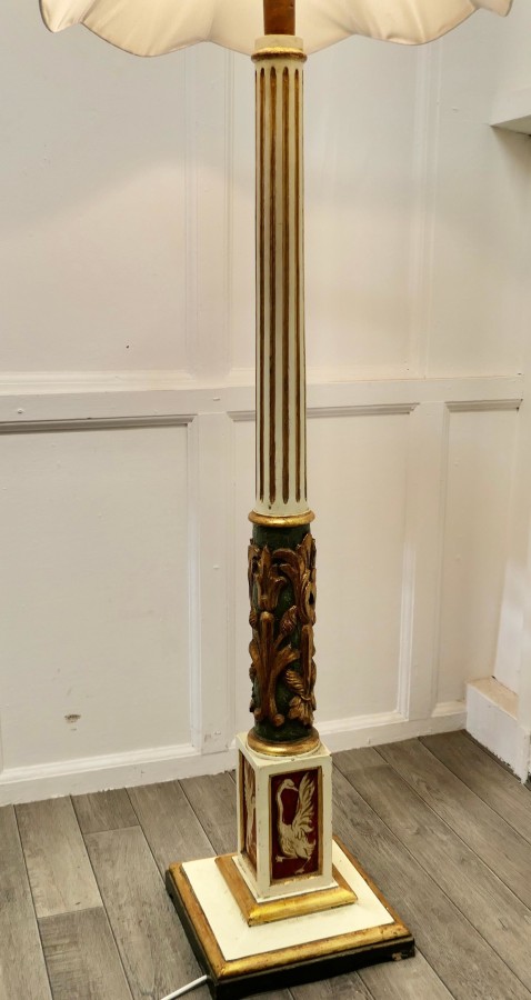 Spanish Folk Art floor standing standard lamp A traditionally turned, carved and painted piece from Spain. This wooden lamp stands on a square base, it is stepped at floor level above this is a Gilt and painted fluted column with carved and painted Gilt decoration, around the column at the bottom there are exotic birds painted on each side Th lamp is shown with a shade, this is not included The lamp is 54” high and the bas is 11” x 11” JK22. Manufacture Date : 1920 Materials : Pine