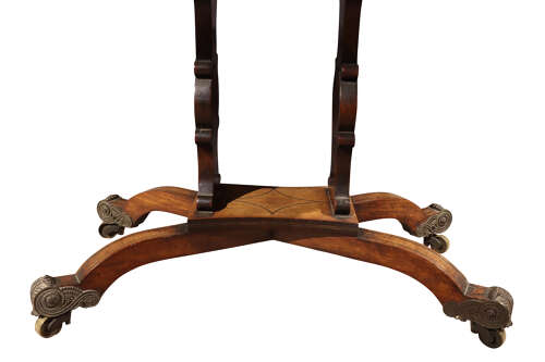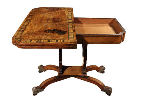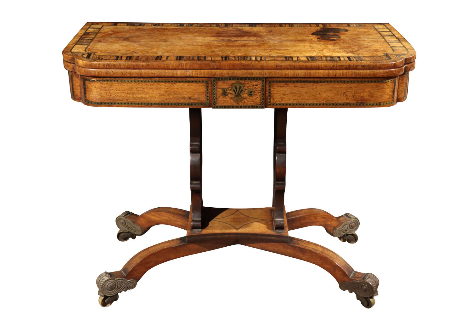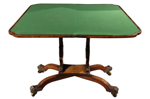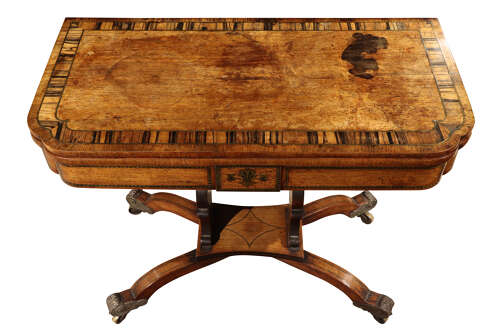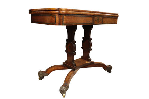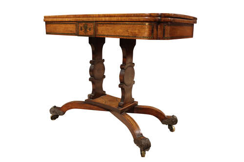 A striking Regency card table, the well-figured rosewood top banded in coromandel, opening to reveal a re-baized playing surface. Finely inlaid with brass throughout, the frieze centred with a classical motif, raised on twin supports united by a shaped stretcher and terminating in outswept sabre legs with ornate brass mounts and castors. A superb example of Regency design and craftsmanship.