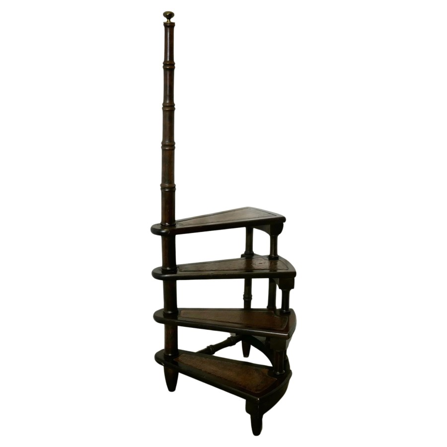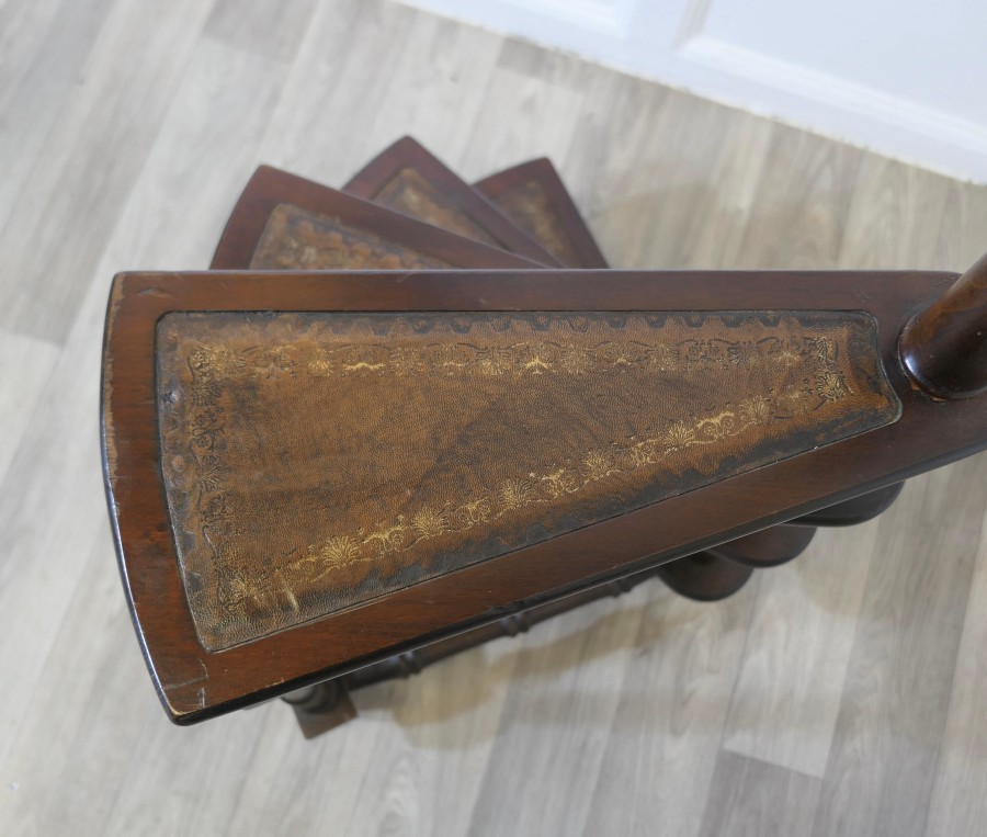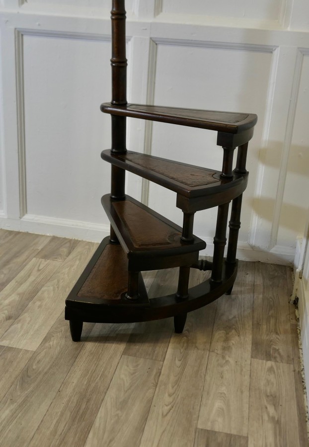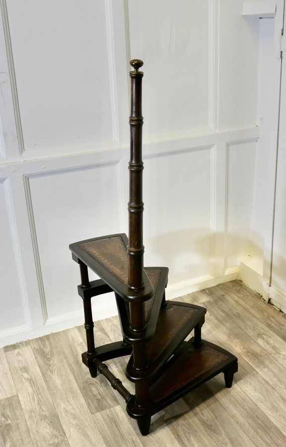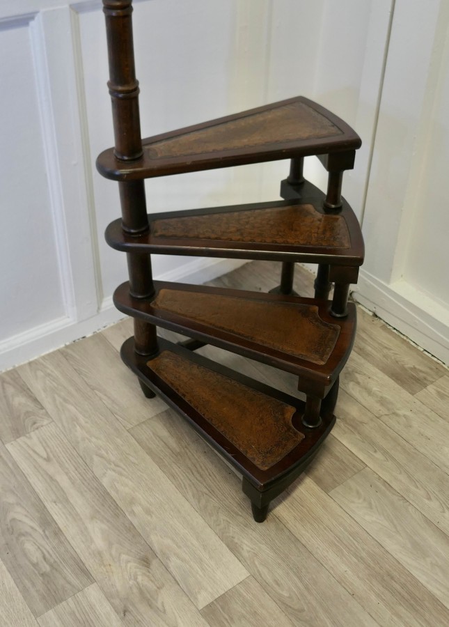 Spiral Library Steps with Turned Supports A Great set of Library Steps, the 4 steps are in a spiral formation, they have tooled leather treads and are in good condition, very sturdy and useful An attractive and unusual piece, the step is 44” high overall and 17” in diameter TNG86 Manufacture Date : 1920 Materials : Beech